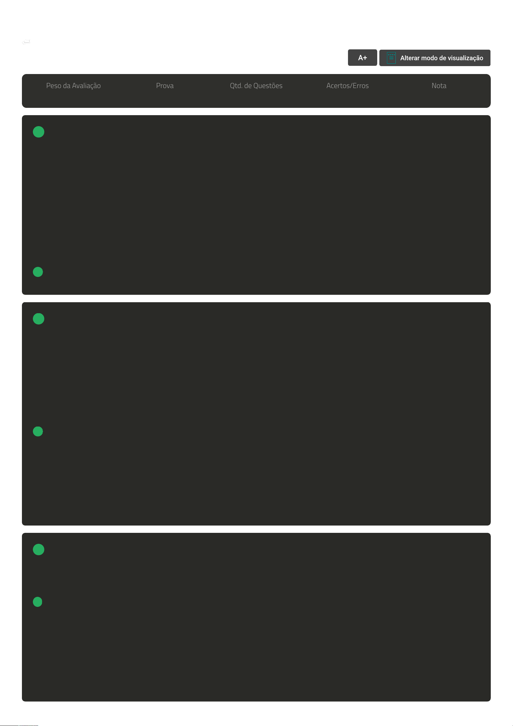 Prova Impressa GABARITO | Avaliação II - Individual (Cod.:1020566) Peso da Avaliação 2,00 Prova 100461337 Qtd. de Questões 10 Acertos/Erros 10/0 Nota 10,00 Vivemos em uma época de globalização, tanto da economia quanto das tecnologias e informações, modificadas constantemente e que refletem na cultura da sociedade. Eventos relevantes, portanto, foram realizados para a formação de pactos e direitos. Dessa forma, a Declaração de Salamanca, criada na Conferência Mundial sobre Educação Especial, em Salamanca, na Espanha, ocorreu em qual ano? A 1985. B 1988. C 1999. D 1994. A partir do reconhecimento da sociedade em relação à importância do tratamento prioritário à questão da criança e do adolescente, surgiu a doutrina da proteção integral. Considerando as características de tal doutrina, analise as afirmações a seguir e classifique V para as verdadeiras e F para as falsas: ( ) Resultou do esforço dos governantes, independentemente do contexto das lutas sociais. ( ) O tratamento da criança e do adolescente como prioridade absoluta é o seu princípio. ( ) É elemento marcante em diversos documentos internacionais sobre a criança e o adolescente. ( ) É realidade nos países da América Latina, devido a suas características diversas em relação aos demais continentes Assinale a alternativa que apresenta a sequência CORRETA: A F – V – V – F. B V – F – V – F. C V – F – F – V. D F – F – V – F. Vivemos em uma época de globalização tanto da economia quanto das tecnologias e informações, modificadas constantemente e que refletem na cultura da sociedade. Quanto às desigualdades sociais, assinale a alternativa CORRETA: A Quando são observadas as diferenças na renda média da população brasileira, verifica-se uma diversidade não somente cultural da identidade brasileira. B A diversidade coloca determinados grupos – em particular, negros e mulheres – em uma situação de inclusão. C Significa uma vantagem para grande parte da população brasileira. D Trata-se de uma realidade que não apresenta as diferenças, mas as identidades da cultura brasileira. VOLTAR 11 22 33 Avaliação II - Individual https://ava2.uniasselvi.com.br/subject/grades-and-tests/answer-book/eyJ0ZXN0Ijp7InRlc3RDb2RlI... 1 of 3 26/04/2026, 13:15 A construção coletiva da educação deve ocorrer a partir da participação da comunidade em decisões da escola. Essa participação pode ocorrer por meio de órgãos colegiados existentes em grande parte das escolas brasileiras. Com base nisso, associe os itens, utilizando o código a seguir: I- Conselho escolar. II- Conselho de classe. III- Associação depais e mestres. IV- Grêmio estudantil. ( ) Constituem um espaço de participação geralmente tímida, pois os pais não possuem conhecimento de questões da educação relacionadas a aportes teóricos e pedagógicos, assim como desconhecem o papel de cidadãos. ( ) Constitui espaço de elaboração de estratégias de ação para a melhoria da qualidade e dos resultados do processo ensino-aprendizagem. ( ) Representa uma organização que deve ser incentivada, pois os alunos não podem ser apenas receptores de conhecimentos desvinculados de sua realidade. ( ) É espaço de debate e tomada de decisões com a participação de todos os atores da comunidade escolar, como professores, funcionários, pais e alunos. Assinale a alternativa que apresenta a sequência CORRETA: A I - II - III - IV. B II - IV - III - I. C III - II - IV - I. D IV - II - I - III. O Estatuto da Criança e do Adolescente prevê o atendimento de todas as crianças e adolescentes da rede de ensino. Considerando o contexto de que a educação escolar é garantida às pessoas com deficiência, assinale a alternativa CORRETA: A A rede de ensino regular poderá optar pelo atendimento de crianças e adolescentes com essas características em suas turmas regulares. B Serão inseridas na educação básica por meio do atendimento em instituições especiais de ensino. C O ensino domiciliar deverá ser a forma de atendimento. D O atendimento dessas crianças e adolescentes deve ocorrer por meio de inserção na rede regular de ensino. Segundo o ECA, educar não é responsabilidade somente da escola, mas da família e da sociedade. Nesse sentido, cabe ao Estado garantir o acesso à educação. Sobre as previsões do ECA, classifique V para as sentenças verdadeiras e F para as falsas: ( ) Direito ao respeito dos educadores para com os alunos. ( ) Direito a negar-se a frequentar as aulas. ( ) Direito de acesso a uma escola próxima do local em que vive. ( ) Direito ao ensino fundamental obrigatório e gratuito. Assinale a alternativa que apresenta a sequência CORRETA: A V - F - V - V. B V - F - F - V. C V - V - V - V. D F - V - F - F. 44 55 66 Avaliação II - Individual https://ava2.uniasselvi.com.br/subject/grades-and-tests/answer-book/eyJ0ZXN0Ijp7InRlc3RDb2RlI... 2 of 3 26/04/2026, 13:15