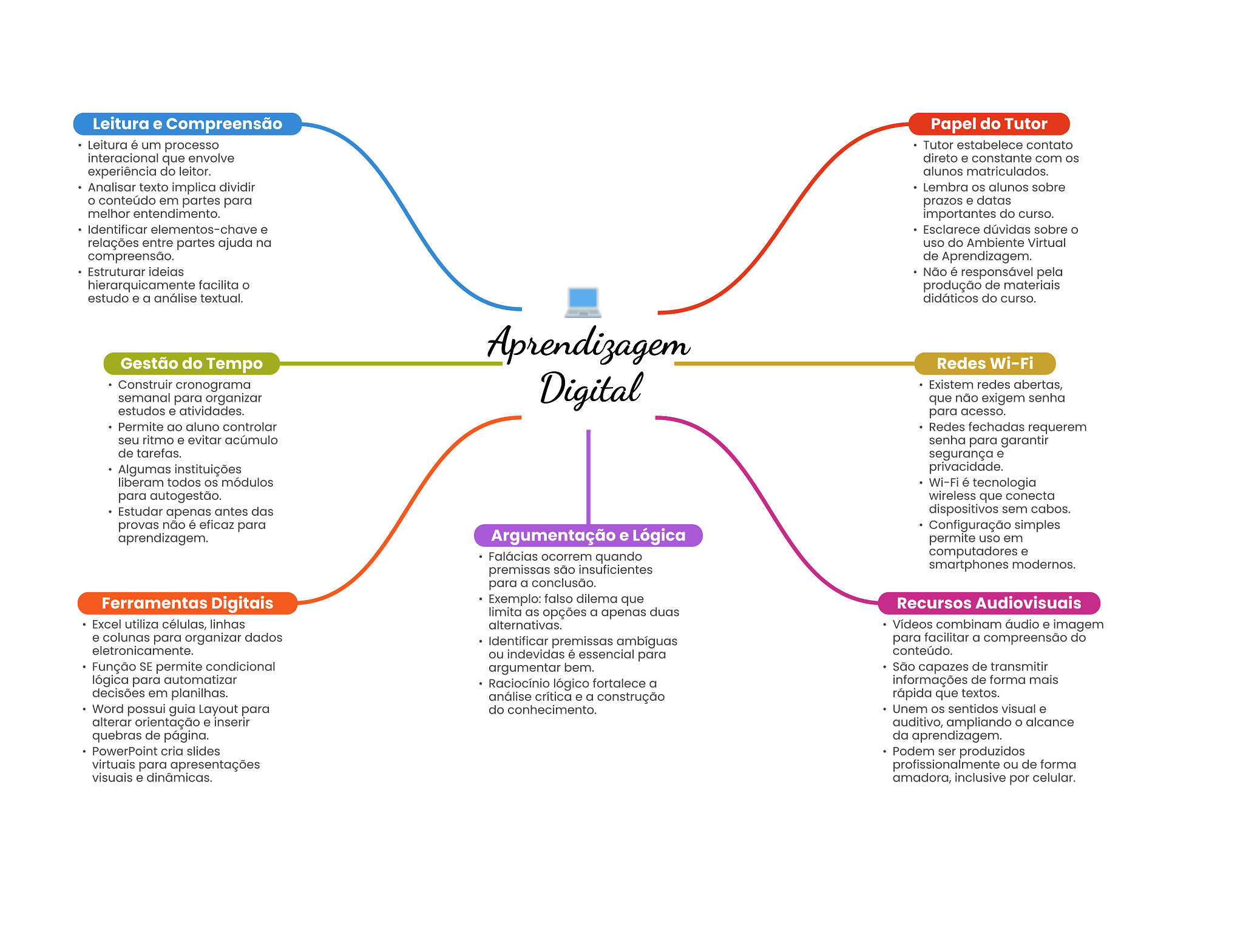 Leitura e Compreensão Papel do Tutor Leitura é um processo Tutor estabelece contato interacional que envolve direto e constante com os experiência do leitor. alunos matriculados. Analisar texto implica dividir Lembra os alunos sobre conteúdo em partes para prazos e datas melhor entendimento. importantes do curso. Identificar elementos-chave e Esclarece dúvidas sobre relações entre partes ajuda na uso do Ambiente Virtual compreensão. de Aprendizagem. Estruturar ideias Não é responsável pela hierarquicamente facilita produção de materiais estudo e a análise textual. didáticos do curso. Aprendizagem Gestão do Tempo Redes Wi-Fi Construir cronograma semanal para organizar Digital Existem redes abertas, que não exigem senha estudos e atividades. para acesso. Permite ao aluno controlar Redes fechadas requerem seu ritmo e evitar acúmulo senha para garantir de tarefas. segurança e Algumas instituições privacidade. liberam todos módulos Wi-Fi é tecnologia para autogestão. wireless que conecta Estudar apenas antes das dispositivos sem cabos. provas não é eficaz para Configuração simples aprendizagem. Argumentação e Lógica permite uso em Falácias ocorrem quando computadores e premissas são insuficientes smartphones modernos. para a conclusão. Ferramentas Digitais Exemplo: falso dilema que Recursos Audiovisuais limita as opções a apenas duas Excel utiliza células, linhas alternativas. Vídeos combinam áudio e imagem e colunas para organizar dados Identificar premissas ambíguas para facilitar a compreensão do eletronicamente. ou indevidas é essencial para conteúdo. Função SE permite condicional argumentar bem. São capazes de transmitir lógica para automatizar Raciocínio lógico fortalece a informações de forma mais decisões em planilhas. análise crítica e a construção rápida que textos. Word possui guia Layout para do conhecimento. Unem os sentidos visual e alterar orientação e inserir auditivo, ampliando O alcance quebras de página. da aprendizagem. PowerPoint cria slides Podem ser produzidos virtuais para apresentações profissionalmente ou de forma visuais e dinâmicas. amadora, inclusive por celular.