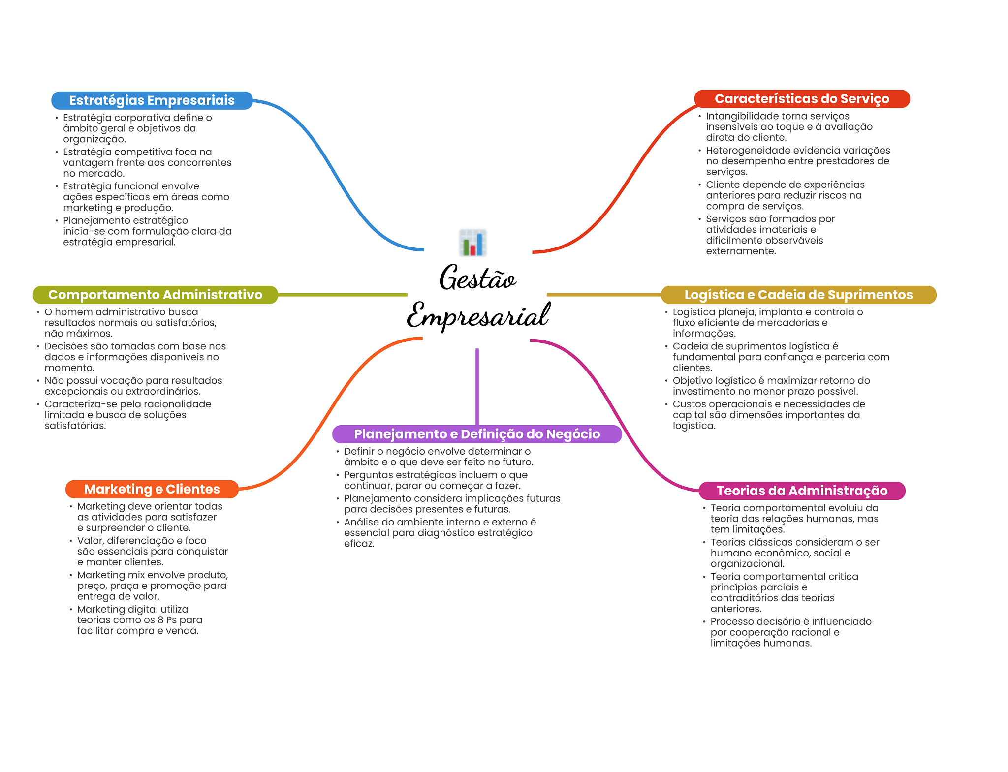 Estratégias Empresariais Características do Serviço Estratégia corporativa define Intangibilidade torna serviços âmbito geral e objetivos da insensíveis ao toque e à avaliação organização. direta do cliente. Estratégia competitiva foca na Heterogeneidade evidencia variações vantagem frente aos concorrentes no desempenho entre prestadores de no mercado. serviços. Estratégia funcional envolve Cliente depende de experiências ações específicas em áreas como anteriores para reduzir riscos na marketing e produção. compra de serviços. Planejamento estratégico Serviços são formados por inicia-se com formulação clara da atividades imateriais e estratégia empresarial. dificilmente observáveis externamente. Gestão Comportamento Administrativo Logística e Cadeia de Suprimentos homem administrativo busca Empresarial Logística planeja, implanta e controla resultados normais ou satisfatórios, fluxo eficiente de mercadorias e não máximos. informações. Decisões são tomadas com base nos Cadeia de suprimentos logística é dados e informações disponíveis no fundamental para confiança e parceria com momento. clientes. Não possui vocação para resultados Objetivo logístico é maximizar retorno do excepcionais ou extraordinários. investimento no menor prazo possível. Caracteriza-se pela racionalidade Custos operacionais e necessidades de limitada e busca de soluções capital são dimensões importantes da satisfatórias. logística. Planejamento e Definição do Negócio Definir O negócio envolve determinar O âmbito e que deve ser feito no futuro. Perguntas estratégicas incluem que Marketing e Clientes continuar, parar ou começar a fazer. Teorias da Administração Planejamento considera implicações futuras Marketing deve orientar todas para decisões presentes e futuras. Teoria comportamental evoluiu da as atividades para satisfazer Análise do ambiente interno e externo é teoria das relações humanas, mas e surpreender cliente. essencial para diagnóstico estratégico tem limitações. Valor, diferenciação e foco eficaz. Teorias clássicas consideram ser são essenciais para conquistar humano econômico, social e e manter clientes. organizacional. Marketing mix envolve produto, Teoria comportamental critica preço, praça e promoção para princípios parciais e entrega de valor. contraditórios das teorias Marketing digital utiliza anteriores. teorias como 8 Ps para Processo decisório é influenciado facilitar compra e venda. por cooperação racional e limitações humanas.
