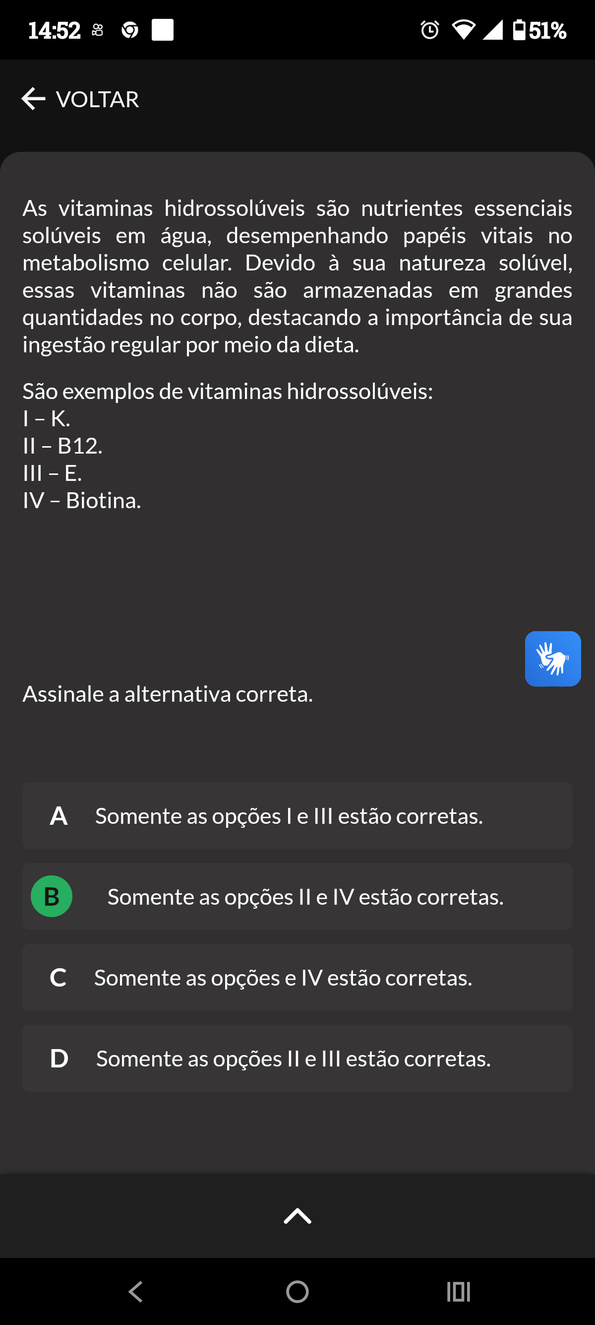 14:52 88 51% VOLTAR As vitaminas hidrossolúveis são nutrientes essenciais solúveis em água, desempenhando papéis vitais no metabolismo celular. Devido à sua natureza solúvel, essas vitaminas não são armazenadas em grandes quantidades no corpo, destacando a importância de sua ingestão regular por meio da dieta. São exemplos de vitaminas hidrossolúveis: B12. III IV - Biotina. Assinale a alternativa correta. A Somente as opções I e III estão corretas. Somente as opções e IV estão corretas. c Somente as opções e IV estão corretas. D Somente as opções e III estão corretas.