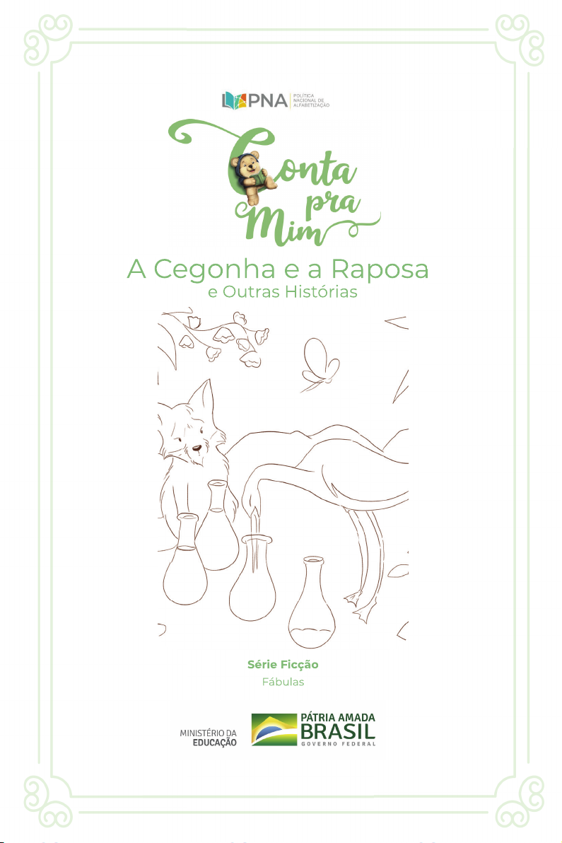 A Cegonha e a Raposa Série Ficção Fábulas e Outras Histórias A Cegonha e a Raposa Série Ficção Fábulas e Outras Histórias A Coleção Conta pra Mim é dedicada à família — mães, pais, fi lhas, fi lhos, avós, avôs... Neste livro, vamos conhecer o curioso universo das fábulas, em que as atitudes das pessoas são representadas por bichos. Essas pequenas histórias imaginativas são verdadeiros convites para cultivarmos as virtudes. Viajar por esse universo na companhia da família será com certeza uma experiência que vocês guardarão por toda a vida. Sejam todos muito bem-vindos! Infância e leitura — o caminho de uma boa aventura. Coleção Conta pra Mim Série Ficção Fábulas Dados Internacionais de Catalogação na Publicação (CIP) de acordo com ISBD C389 A cegonha e a raposa e outras histórias / organizado por Ministério da Educação – MEC ; coordenado por Secretaria de Alfabetização - Sealf. – Brasília, DF : MEC/Sealf, 2020. 16 p. : il. ; 16cm x 23cm. – (Coleção Conta pra Mim) ISBN: 978-65-87026-40-4 1. Literatura infantil. I. Ministério da Educação – MEC. II. Secretaria de Alfabetização - Sealf. III. Título. IV. Série. 2020-1037 CDD 028.5 CDU 82-93 Elaborado por Vagner Rodolfo da Silva - CRB-8/9410 Índice para catálogo sistemático: 1. Literatura infantil 028.5 2. Literatura infantil 82-93 Autoria: Ricardo Moreira Figueiredo Filho Ilustrações: Vanessa Alexandre Edição: Marismar Borém Direção geral e curadoria: Wiliam Ferreira da Cunha Supervisão técnica e de conteúdo: Carlos Francisco de Paula Nadalim Revisão de texto: Felipe Salomão Cardoso e Adriana Araújo Figueiredo Publicado em 2020 pelo Ministério da Educação (MEC) em cooperação com a Editora Cora e com a Organização das Nações Unidas para a Educação, a Ciência e a Cultura (UNESCO), no âmbito do Projeto 914BRZ1074 - 914BRZ1074.3 sob o contrato ED00217/2020 © MEC 2020 Esta publicação está disponível em acesso livre ao abrigo da licença Atribuição 4.0 Internacional (CC BY 4.0) (https://creativecommons.org/licenses/by/4.0/deed.pt_BR). Ao utilizar o conteúdo da presente publicação, os usuários aceitam os termos de uso do Repositório de Domínio Público do MEC (http://www.dominiopublico.gov.br/pesquisa/PesquisaObraForm.jsp). A Cegonha e a Raposa e Outras Histórias 3 A Cegonha e a Raposa A Raposa convidou sua amiga Cegonha para almoçar. Preparou um banquete, tudo bem molinho, como uma sopa. Porém, serviu as refeições sobre a pedra. 44 A ave tentou se alimentar, mas, como tinha um bico longo, machucou-se e voltou faminta para sua moradia. 5 5 Em outra oportunidade, a Cegonha convidou a Raposa para a merenda. Quitutes gostosos foram elaborados com carinho e servidos em vasilhas es- treitas e longas. 6 A Raposa fez várias tentativas, mas seu focinho não alcançou a comida. Desta vez, foi ela que voltou esfomeada para casa. As Árvores e o Machado No canto de um celeiro, havia um machado sem cabo. As árvores viram o instrumento triste e decidiram dar-lhe a madeira necessária para fazer a haste. 7 Pouco depois, um lenhador apanhou o machado e começou a destruir todo o bosque. 8 Em apuros, uma árvore disse a outra: — Tudo culpa nossa! Não deveríamos ter presenteado a ferramenta… 9 10 O Galo e a Pérola Um Galo ciscava no quintal, procuran- do algo gostoso para comer. Revirou uma pedra e encontrou uma pérola. Então, pensou: 11 — Se isto fosse uma semente ou uma deliciosa minhoca, eu poderia comer. Deixou aquele tesouro de lado e con- tinuou sua busca por alimento. 12 O Carvalho e o Caniço O Carvalho vistoso, para ser imitado, aconselhou o Caniço a não se curvar perante a passagem do vento ou de qualquer brisa. 13 O Caniço respondeu: — Você é robusto, pode fi car fi rme. 14 Um furacão passou e arrancou do chão o Carvalho, com raízes e tudo. Mas o Caniço, que se contorcia, resistiu. Conversa entre adultos e crianças antes, durante e depois da leitura em voz alta. Leitura Dialogada O que é? Fortalecer os laços afetivos entre pais e fi lhos. Quais são os benefícios? Contribuir para a alfabetização e reforçar a aprendizagem escolar das crianças. Como praticar? Escolha um momento tranquilo para iniciar a leitura dialogada. Leia com calma. Pronuncie bem as palavras, cuidando com carinho do tom de voz. Deslize o dedo indicador sob as palavras durante a leitura. Nomeie as ilustrações e dê tempo para seu fi lho apreciá-las. Valorize os comentários de seu fi lho, explorando outros aspectos das histórias. Ao sair de casa, leve sempre livros para ler com seu fi lho. Aproveite todas as oportunidades! 1. Trate seu fi lho com muito amor e carinho. 2. Converse com seu fi lho. 3. Valorize e respeite o que seu fi lho tem a dizer. 4. Leia em voz alta para seu fi lho. 5. Conte histórias para seu fi lho. 6. Dê livros de presente para seu fi lho. 7. Leia e escreva diante de seu fi lho. 8. Participe da vida escolar de seu fi lho. 9. Elogie e encoraje seu fi lho. 10. Tenha altas expectativas em relação a seu fi lho. Literacia Familiar em Dez Pontos