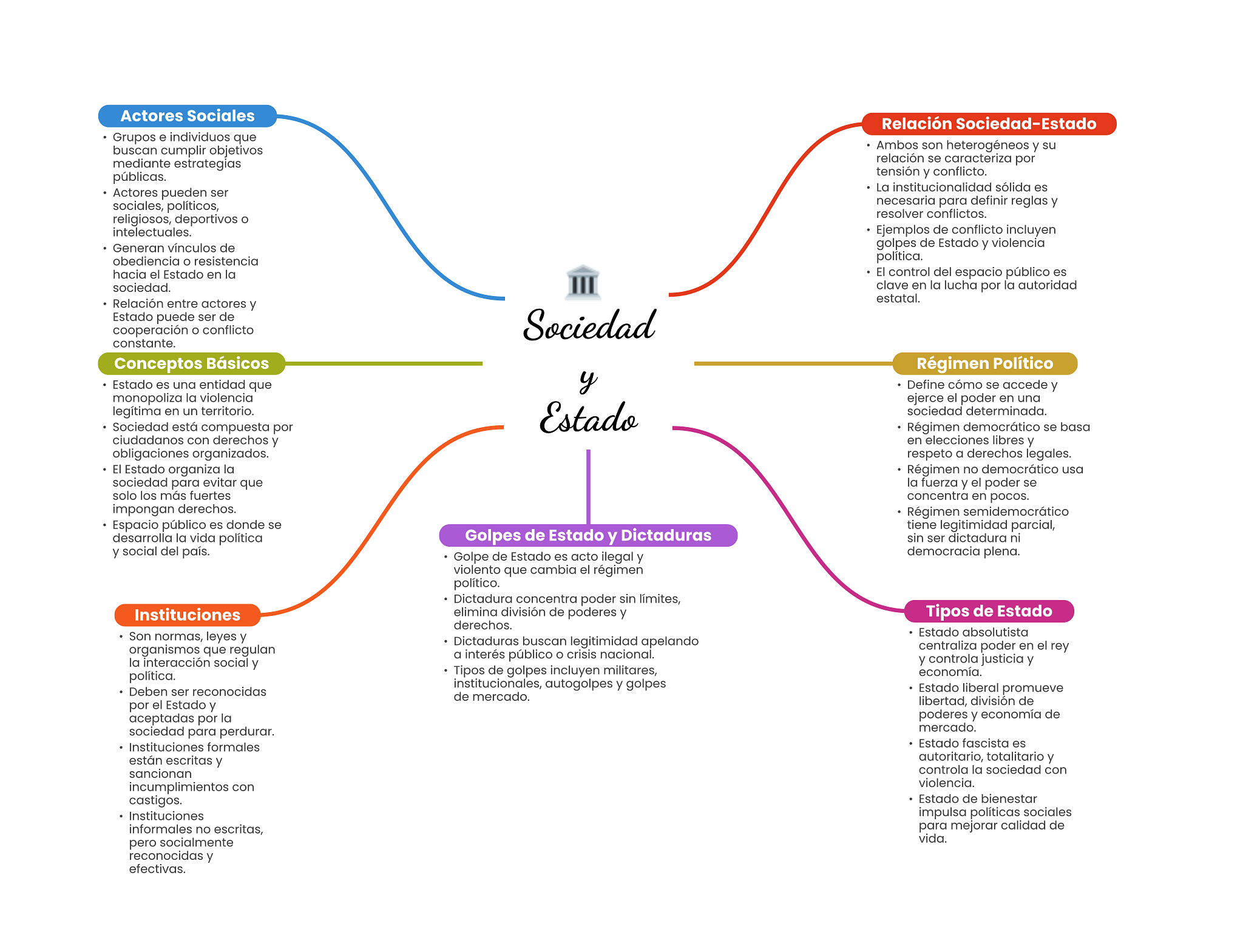 Actores Sociales Relación Sociedad-Estado Grupos e individuos que buscan cumplir objetivos Ambos son heterogéneos y su mediante estrategias relación se caracteriza por públicas. tensión y conflicto. La institucionalidad sólida es Actores pueden ser sociales, políticos, necesaria para definir reglas y resolver conflictos. religiosos, deportivos O intelectuales. Ejemplos de conflicto incluyen Generan vínculos de golpes de Estado y violencia obediencia resistencia política. hacia el Estado en la El control del espacio público es sociedad. clave en la lucha por la autoridad Relación entre actores y estatal. Estado puede ser de cooperación O conflicto Sociedad constante. Conceptos Básicos Régimen Político Estado es una entidad que y Define cómo se accede y monopoliza la violencia ejerce el poder en una legítima en un territorio. Estado sociedad determinada. Sociedad está compuesta por Régimen democrático se basa ciudadanos con derechos y en elecciones libres y obligaciones organizados. respeto a derechos legales. El Estado organiza la Régimen no democrático usa sociedad para evitar que la fuerza y el poder se solo los más fuertes concentra en pocos. impongan derechos. Régimen semidemocrático Espacio público es donde se tiene legitimidad parcial, desarrolla la vida política Golpes de Estado y Dictaduras sin ser dictadura ni y social del país. Golpe de Estado es acto ilegal y democracia plena. violento que cambia el régimen político. Dictadura concentra poder sin límites, Instituciones elimina división de poderes y Tipos de Estado derechos. Son normas, leyes y Estado absolutista Dictaduras buscan legitimidad apelando organismos que regulan centraliza poder en el rey a interés público crisis nacional. la interacción social y y controla justicia y política. Tipos de golpes incluyen militares, economía. institucionales, autogolpes y golpes Deben ser reconocidas Estado liberal promueve de mercado. por el Estado y libertad, división de aceptadas por la poderes y economía de sociedad para perdurar. mercado. Instituciones formales Estado fascista es están escritas y autoritario, totalitario y sancionan controla la sociedad con incumplimientos con violencia. castigos. Estado de bienestar Instituciones impulsa políticas sociales informales no escritas, para mejorar calidad de pero socialmente vida. reconocidas y efectivas.
