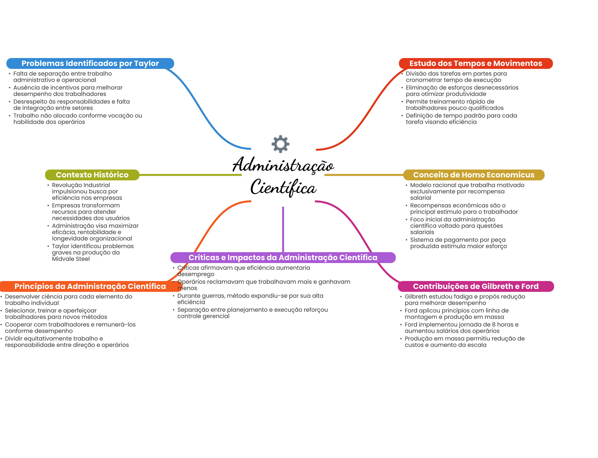 Problemas Identificados por Taylor Estudo dos Tempos e Movimentos Falta de separação entre trabalho Divisão das tarefas em partes para administrativo e operacional cronometrar tempo de execução Ausência de incentivos para melhorar Eliminação de esforços desnecessários desempenho dos trabalhadores para otimizar produtividade Desrespeito às responsabilidades e falta Permite treinamento rápido de de integração entre setores trabalhadores pouco qualificados Trabalho não alocado conforme vocação ou Definição de tempo padrão para cada habilidade dos operários tarefa visando eficiência Administração Contexto Histórico Conceito de Homo Economicus Revolução Industrial Científica Modelo racional que trabalha motivado impulsionou busca por exclusivamente por recompensa eficiência nas empresas salarial Empresas transformam Recompensas econômicas são O recursos para atender principal estímulo para O trabalhador necessidades dos usuários Foco inicial da administração Administração visa maximizar científica voltado para questões eficácia, rentabilidade e salariais longevidade organizacional Sistema de pagamento por peça Taylor identificou problemas produzida estimula maior esforço graves na produção da Midvale Steel Críticas e Impactos da Administração Científica Criticas afirmavam que eficiência aumentaria desemprego Operários reclamavam que trabalhavam mais e ganhavam Princípios da Administração Científica menos Contribuições de Gilbreth e Ford Desenvolver ciência para cada elemento do Durante guerras, método expandiu-se por sua alta Gilbreth estudou fadiga e propôs redução trabalho individual eficiência para melhorar desempenho Selecionar, treinar e aperfeiçoar Separação entre planejamento e execução reforçou Ford aplicou princípios com linha de trabalhadores para novos métodos controle gerencial montagem e produção em massa Cooperar com trabalhadores e remunerá-los Ford implementou jornada de 8 horas e conforme desempenho aumentou salários dos operários Dividir equitativamente trabalho e Produção em massa permitiu redução de responsabilidade entre direção e operários custos e aumento da escala