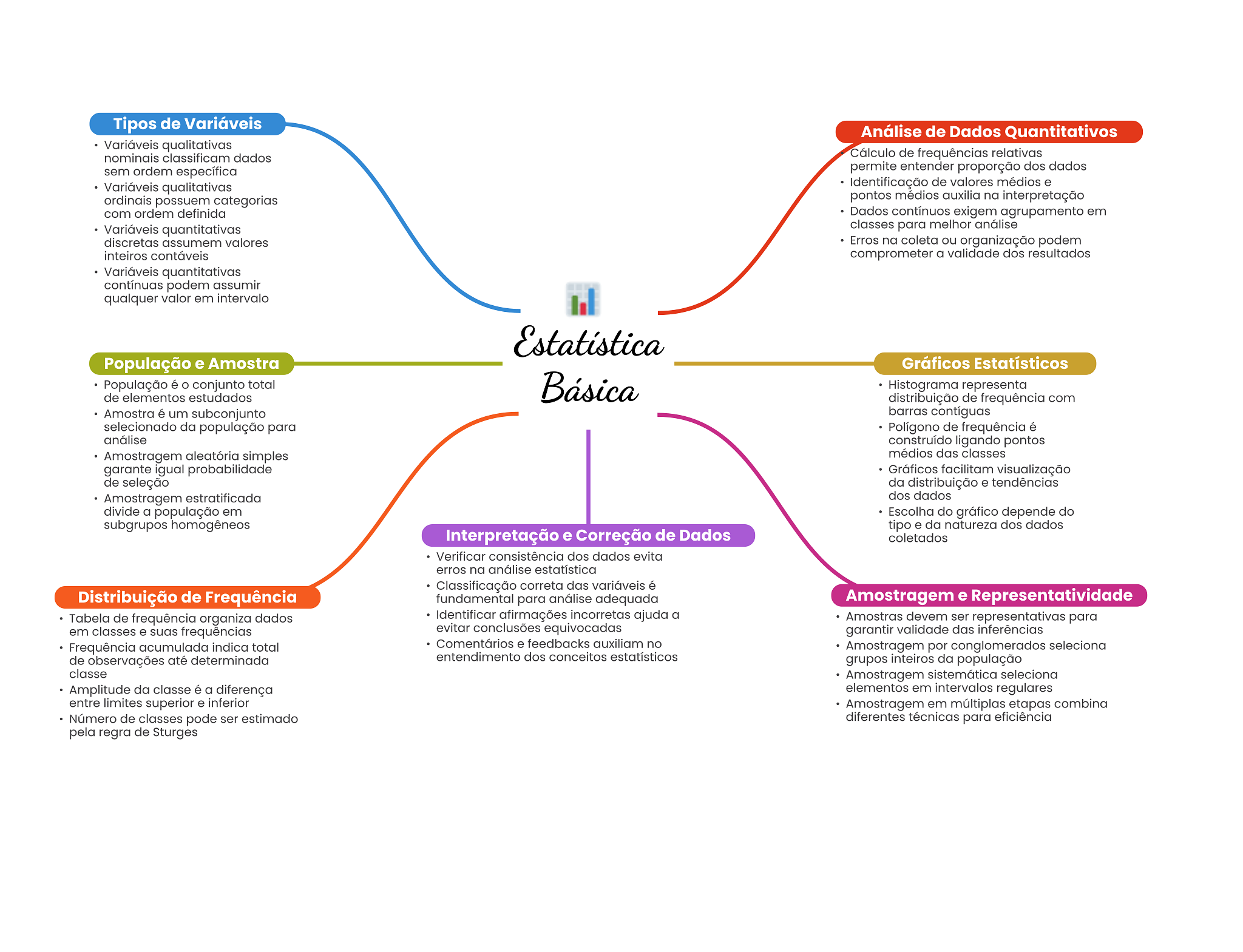 Tipos de Variáveis Análise de Dados Quantitativos Variáveis qualitativas nominais classificam dados Cálculo de frequências relativas sem ordem específica permite entender proporção dos dados Variáveis qualitativas Identificação de valores médios e ordinais possuem categorias pontos médios auxilia na interpretação com ordem definida Dados contínuos exigem agrupamento em Variáveis quantitativas classes para melhor análise discretas assumem valores Erros na coleta ou organização podem inteiros contáveis comprometer a validade dos resultados Variáveis quantitativas contínuas podem assumir qualquer valor em intervalo Estatística População e Amostra Gráficos Estatísticos População é conjunto total de elementos estudados Básica Histograma representa distribuição de frequência com Amostra é um subconjunto barras contíguas selecionado da população para Polígono de frequência é análise construído ligando pontos Amostragem aleatória simples médios das classes garante igual probabilidade Gráficos facilitam visualização de seleção da distribuição e tendências Amostragem estratificada dos dados divide a população em Escolha do gráfico depende do subgrupos homogêneos tipo e da natureza dos dados Interpretação e Correção de Dados coletados Verificar consistência dos dados evita erros na análise estatística Classificação correta das variáveis é Distribuição de Frequência fundamental para análise adequada Amostragem e Representatividade Tabela de frequência organiza dados Identificar afirmações incorretas ajuda a Amostras devem ser representativas para em classes e suas frequências evitar conclusões equivocadas garantir validade das inferências Frequência acumulada indica total Comentários e feedbacks auxiliam no Amostragem por conglomerados seleciona de observações até determinada entendimento dos conceitos estatísticos grupos inteiros da população classe Amostragem sistemática seleciona Amplitude da classe é a diferença elementos em intervalos regulares entre limites superior e inferior Amostragem em múltiplas etapas combina Número de classes pode ser estimado diferentes técnicas para eficiência pela regra de Sturges