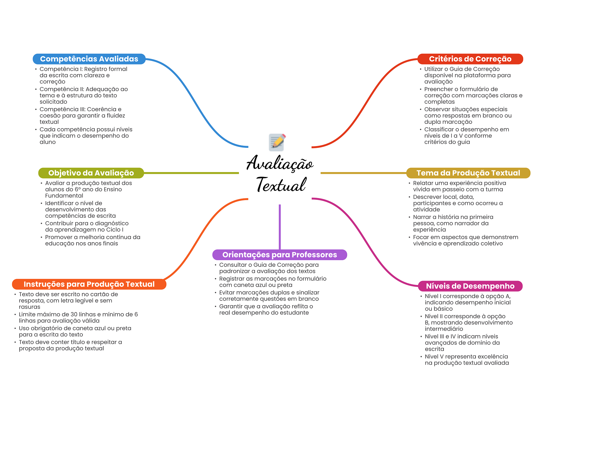 Competências Avaliadas Critérios de Correção Competência I: Registro formal Utilizar Guia de Correção da escrita com clareza e disponível na plataforma para correção avaliação Competência II: Adequação ao Preencher formulário de tema e à estrutura do texto correção com marcações claras e solicitado completas Competência III: Coerência e Observar situações especiais coesão para garantir a fluidez como respostas em branco ou textual dupla marcação Cada competência possui níveis Classificar desempenho em que indicam desempenho do níveis de a V conforme aluno critérios do guia Avaliação Objetivo da Avaliação Tema da Produção Textual Avaliar a produção textual dos Textual Relatar uma experiência positiva alunos do 6° ano do Ensino vivida em passeio com a turma Fundamental Descrever local, data, Identificar nível de participantes e como ocorreu a desenvolvimento das atividade competências de escrita Narrar a história na primeira Contribuir para diagnóstico pessoa, como narrador da da aprendizagem no Ciclo experiência Promover a melhoria contínua da Focar em aspectos que demonstrem educação nos anos finais vivência e aprendizado coletivo Orientações para Professores Consultar Guia de Correção para padronizar a avaliação dos textos Registrar as marcações no formulário Instruções para Produção Textual com caneta azul ou preta Níveis de Desempenho Texto deve ser escrito no cartão de Evitar marcações duplas e sinalizar resposta, com letra legível e sem corretamente questões em branco Nível corresponde à opção A, indicando desempenho inicial rasuras Garantir que a avaliação reflita ou básico Limite máximo de 30 linhas e mínimo de 6 real desempenho do estudante Nível corresponde à opção linhas para avaliação válida B, mostrando desenvolvimento Uso obrigatório de caneta azul ou preta intermediário para a escrita do texto Nível III e IV indicam níveis Texto deve conter título e respeitar a avançados de domínio da proposta da produção textual escrita Nível V representa excelência na produção textual avaliada
