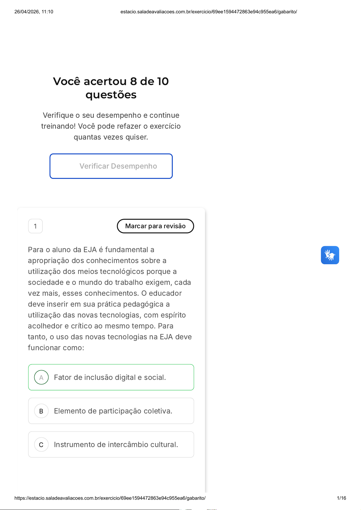 https://estacio.saladeavaliacoes.com.br/exercicio/69ee1594472863e94c955ea6/gabarito/ 14/16
