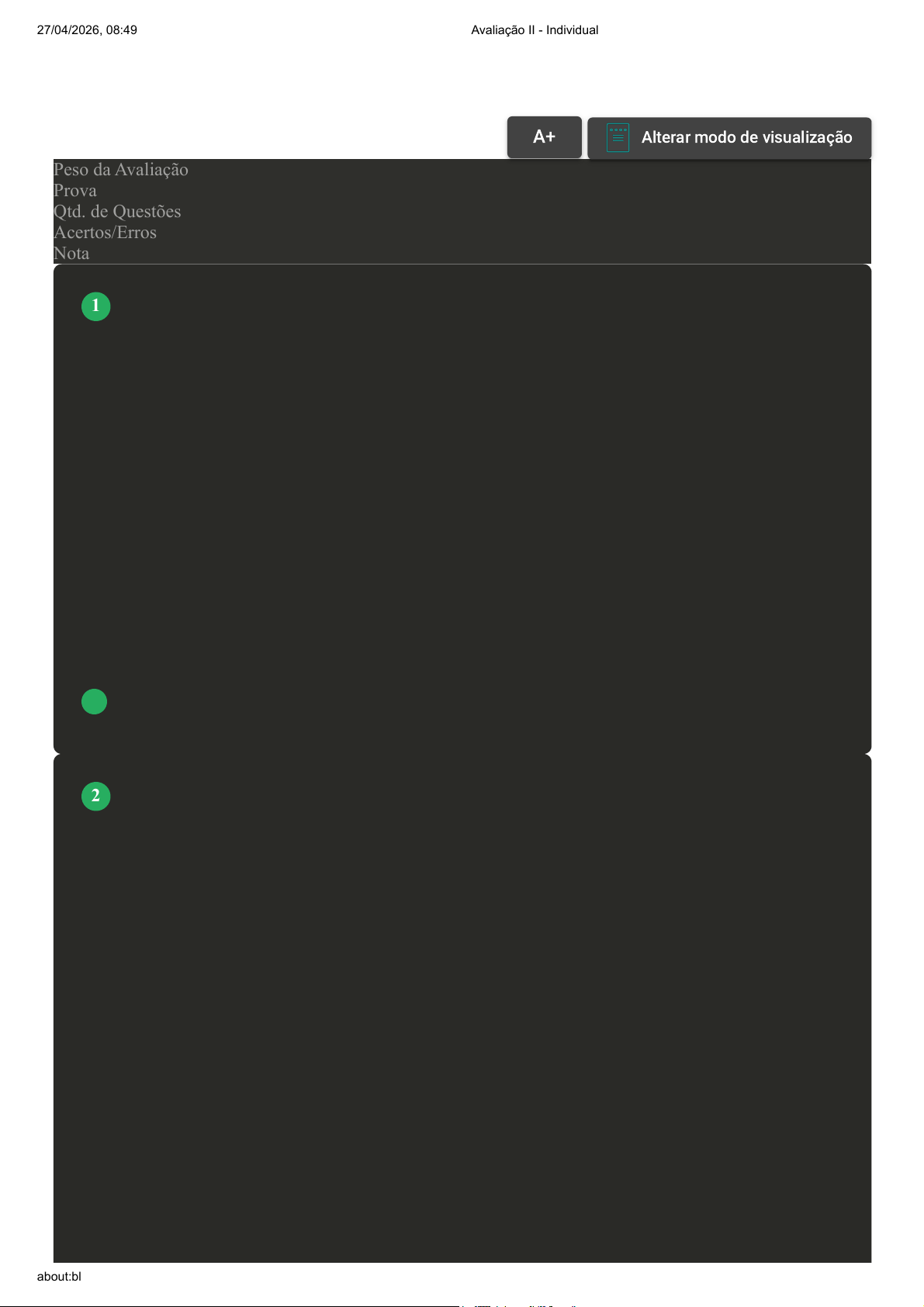 Prova Impressa GABARITO | Avaliação II - Individual (Cod.:1023536) Peso da Avaliação 2,00 Prova 94830835 Qtd. de Questões 10 Acertos/Erros 10/0 Nota 10,00 O momento de inércia é uma grandeza que define a resistência de um corpo rígido a ser girado. O produto de inércia faz parte dessa resistência em algumas situações, juntos gerando a matriz de momentos e produtos de inércia. Sobre o exposto, classifique V para as sentenças verdadeiras e F para as falsas: ( ) Os produtos de inércia aparecem sempre que os corpos não forem planos. ( ) Sempre existe um eixo que passa pelo centroide, onde os produtos de inércia são nulos. ( ) Apenas os produtos de inércia podem ser nulos, mas nunca os momentos de inércia. ( ) Os momentos e produtos de inércia jamais podem ser negativos. Assinale a alternativa que apresenta a sequência CORRETA: A F - F - V - V. B V - V - F - F. C V - F - F - F. D F - V - V - F. Um corpo rígido gira em torno de um eixo fixo, conforme a figura anexa. Sabendo que Ixz=1 kg.m^2, Iyz=2 kg.m^2 e Iz=3 kg.m^2, classifique V para as sentenças verdadeiras e F para as falsas: ( ) Esse eixo é simétrico com respeito ao plano xy. ( ) Se o momento em x e y são iguais a 1 N.m, a aceleração angular será igual a -0,333 rad/s². ( ) Se a velocidade angular do eixo for zero, os momentos e x e y serão zero. ( ) Quando o eixo é assimétrico, a soma dos momentos não é zero, mesmo quando a aceleração angular é zero. Assinale a alternativa que apresenta a sequência CORRETA: VOLTAR A+Aumentar, FonteAlterar modo de visualização 1 2 27/04/2026, 08:49 Avaliação II - Individual about:blank 1/6 FONTE DA IMAGEM: http://ocw.snu.ac.kr/sites/default/files/NOTE/Chapter%2018.pdf. Acesso em: 23 jan. 2020. A F - F - V - V. B V - F - V - F. C F - V - F - V. D V - V - F - F. A figura anexa mostra um giroscópio, onde os três ângulos de Euler e sua variação estão mostrados. As três possíveis rotações do giroscópios são chamadas de precessão, nutação e rotação própria. Com base na figura, associe os itens, utilizando o código a seguir: I- Precessão. II- Nutação. III- Rotação própria. ( ) Indicação 1 da figura. ( ) Indicação 2 da figura. ( ) Indicação 3 da figura. Assinale a alternativa que apresenta a sequência CORRETA: FONTE DA IMAGEM: http://www.gyroscopes.org/math2.asp. Acesso em: 23 jan. 2020. 3 27/04/2026, 08:49 Avaliação II - Individual about:blank 2/6 A III - I - II. B I - II - III. C II - III - I. D I - III - II. O paralelepípedo de 3 kg da figura gira em torno do eixo indicado com uma velocidade angular de 3 rad/s. Ao mesmo tempo, o centro do bloco se move na direção vertical, ao longo do eixo, com velocidade de 2 m/s. Sabendo que a=1 m e b = 2 m, calcule o momento angular com relação ao ponto no centro da aresta "a" e assinale a alternativa CORRETA: I_paralelepipedo=m(a^2+b^2)/12 FONTE DA IMAGEM: https://def.fe.up.pt/dinamica/corpos_rigidos.html. Acesso em: 22 jan. 2020. A 9,75 N.m/s B 12,5 N.m/s C 7,25 N.m/s D 4,75 N.m/s Um cilindro sólido gira em torno do seu próprio eixo com uma velocidade angular de 2 rad/s e gira ao mesmo tempo em um eixo que passa pelo diâmetro central com velocidade angular igual a 1 rad/s. Sabendo que a massa do cilindro é de 3 kg, seu diâmetro de 0,5 m e seu comprimento de 0,8 m, classifique em V para as sentenças verdadeiras e F para as falsas: ( ) O momento angular ao redor do próprio eixo é igual a 0,374 N.m/s. ( ) O momento angular ao redor do eixo que passa pelo diâmetro central é igual a 0,207 N.m/s. ( ) O terceiro eixo também possui momento angular devido aos de inércia com os outros eixos. ( ) Ao contrário das velocidades angulares, o momento angular é menor no eixo do cilindro e maior 4 5 27/04/2026, 08:49 Avaliação II - Individual about:blank 3/6 no eixo que passa pelo diâmetro. Assinale a alternativa que apresenta a sequência CORRETA: A V - F - V - F. B V - V - F - F. C F - V - F - V. D F - F - V - V. Os giroscópios são equipamentos especializados que exercem funções importantes em certas máquinas, devido as suas propriedades de giro. Com base nesse equipamento, classifique V para as sentenças verdadeiras e F para as falsas: ( ) Navios, aeronaves e helicópteros são exemplos de máquinas que utilizam o giroscópio. ( ) O objetivo do giroscópio é reaproveitar os esforços realizados durante a rotação da máquina sobre o qual reside. ( ) Um objeto em rotação tende a ficar naquele eixo de rotação. ( ) Um tipo comum de giroscópio é o eletrônico. Assinale a alternativa que apresenta a sequência CORRETA: A F - V - F - V. B V - V - F - F. C V - V - V - F. D V - F - V - V. A figura em anexo apresenta uma placa fina sob várias forças em diferentes direções. Considere presentes apenas as forças cujas magnitudes foram fornecidas, 400 N, 600 N e 300 N. Sabendo que a densidade da placa é de 1 kg/m² e considerando os eixos xyz na ponta da placa, classifique V para as sentenças verdadeiras e F para as falsas: ( ) A aceleração angular no eixo x é igual a aproximadamente 22,8 rad/s^2. ( ) A aceleração angular no eixo y é igual a 12,9 rad/s^2. ( ) A aceleração angular no eixo z é igual a 7,42 rad/s^2. ( ) Os produtos de inércia da placa nos eixos xyz são nulos. Assinale a alternativa que apresenta a sequência CORRETA: FONTE DA IMAGEM: https://www.chegg.com/homework-help/questions-and-answers/3d- 6 7 27/04/2026, 08:49 Avaliação II - Individual about:blank 4/6 equilibrium-problem-asks-find-moment-equations-x-y-z-axes-question-solution-want-know-u- q9093619. Acesso em: 22 jan. 2020. A F - V - V - F. B V - V - F - F. C V - F - F - V. D F - F - V - V. Um corpo possui momentos de inércia nos eixos x y e z iguais a 3, 2 e 1 kg.m^2, respectivamente, e produtos de inércia nulos. Com base no exposto, analise as sentenças a seguir: I- Se não houver aceleração angular no eixo x, o momento no eixo x será nulo. II- As equações de Euler podem ser usadas para 