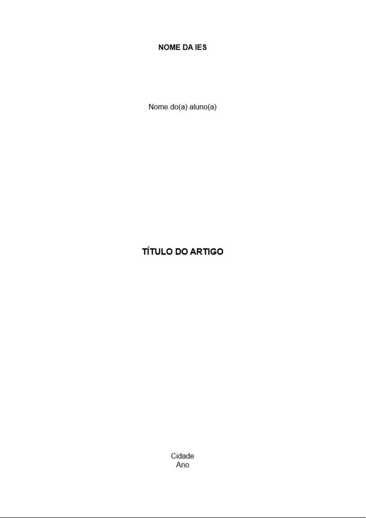 NOME DA IES Nome do(a) aluno(a) TÍTULO DO ARTIGO Cidade AnoNOME DA IES Nome do(a) aluno(a) TÍTULO DO ARTIGO Trabalho apresentado como requisito obrigatório para conclusão do curso de no formato de artigo científico, resultante da pesquisa desenvolvida no ano de sob a orientação de Cidade Ano TÍTULO DO ARTIGO Nome do(a) aluno(a)RESUMO Apresentação concisa e seletiva do artigo, apresentando elementos de maior interesse tais como objetivos do artigo, metodologia e conclusões. A Associação Brasileira de Normas Técnicas, através da norma NBR 6028, define resumo como "a apresentação concisa dos pontos relevantes de um texto". Para artigos, a ABNT recomenda 0 resumo com 250 palavras, aproximadamente 8 a 10 linhas, em apenas um parágrafo e espaçamento simples. Palavras-Chaves: Artigo científico. Trabalho de Conclusão de Curso. Modelo de artigo. (Deve conter entre 3 e 5 palavras, no máximo, e se caracterizam por refletirem de maneira objetiva conteúdo do texto; são retiradas do texto do resumo, pois nele se situa a síntese do estudo. As palavras-chave são colocadas em sequência à apresentação do resumo. corpo do artigo será iniciado imediatamente após a linha que contém as palavras- chave). INTRODUÇÃO Esta seção deve proporcionar ao leitor uma introdução geral sobre tema do artigo, com propósito de atraí-lo para a leitura completa do artigo. Não é apenas uma descrição dos conteúdos das seções do texto. Ela deve apresentar em um texto único (sem seções), fluido e agradável, capaz de introduzir tema da pesquisa ao leitor, demonstrando os caminhos que serão percorridos e como os resultados serão apresentados. Trata-se da formulação clara do tema em questão e OS motivos que justificam a sua escolha. TÍTULO DA SEÇÃO (Desenvolvimento/Referencial Teórico) Esta seção é resultado da revisão de literatura (livros, artigos etc.) das áreas de conhecimento relacionadas com tema do artigo. Nela são apresentadas as ideias principais de autores da área. As referências do artigo devem incluir, no mínimo, 3 livros e 2 artigos de revistas idôneas sobre tema em questão. Pesquise sempre em sites de confiança e oficiais, no meio acadêmico. A seção pode ser dividida em tantas subseções quanto desejáveis. Sua adequada organização permite, posteriormente, realizar comparações e análises, levando a uma melhor compreensão do assunto. Subtitulo (se houver) Subtitulo (se houver) TÍTULO DA SEÇÃO (Análise dos dados se houver) Subtitulo (se houver) Subtitulo (se houver) CONSIDERAÇÕES FINAIS As conclusões devem ser apresentadas de forma objetiva e concisa. REFERÊNCIAS A lista de referências é estreitamente relacionada à de literatura utilizada na pesquisa. Ela deve incluir os trabalhos de onde foram extraídos dados, figuras, tabelas, textos etc. Todas as referências citadas no texto devem ser incluídas na lista de referências. Por outro lado, a lista não deve incluir trabalhos não citados no texto.Seguir as Normas da ABNT e as orientações técnicas mencionadas neste documento. Elencar em ordem alfabética, começando pelo sobrenome do(s) autor(es), com espaçamento simples e um espaço entre as referências. GOMES, R.M.; BRITO, E.; VARELA, A. Intervenção na formação no ensino superior: a aprendizagem baseada em problemas (PBL). Interacções, n. 42, 44-57, 2016. BENDER, W. Aprendizagem baseada em projetos: educação diferenciada para 0 século XXI. Porto Alegre: Penso, 2014. ORIENTAÇÕES TÉCNICAS: TCC é individual, contendo, no mínimo, 15 (quinze) e no máximo 25(vinte e cinco) páginas por se tratar de artigo científico, não computadas as páginas de capa e pós-textuais anexos, obedecendo criteriosamente as Normas da ABNT. As orientações técnicas para elaboração do artigo são: Editor de texto e normas técnicas e doc (word) Tamanho do papel: A4 (29,7cm 21 cm) Margem superior: 3 cm Margem inferior: 2 cm Margem esquerda: 3 cm Margem direita: 2 cm Fonte: Times New Roman ou Arial, corpo 12. Para títulos 14 em negrito e subtítulo 12 em negrito. Resumo, fonte 12 com no máximo 250 palavras. Palavras-chave: Entre 3 e 5, separadas por ponto. Ex: Metodologias Ativas. Educação. Educação Básica. Espaçamento entre caracteres, palavras e linhas: 1,5 exceto resumo (com espaçamento simples). Notas de rodapé ou notas de fim: fonte 10 com espaçamento simples. Citação direta curta: até três linhas (com aspas no trecho transcrito do autor(a) e indicação da obra no começo ou no final, conforme casos ilustrativos abaixo: Ex: PEREIRA (2017, p. 02) define que "as práticas educativas inovadoras estão no centro do debate da potencialidade do uso de tecnologias e metodologias ativas". OU "As práticas educativas inovadoras estão no centro do debate da potencialidade do uso de tecnologias e metodologias ativas". PEREIRA (2017, p. 02)Citação direta longa: com mais de três linhas, recuo de 4 cm a esquerda, fonte 11, espaçamento simples e referência/fonte ao final, conforme abaixo: 0 processo de avaliação é uma tarefa didática necessária e permanente do trabalho docente, devendo estar articulada passo a passo ao processo de aprendizagem. Nesse viés, os resultados que vão sendo obtidos no decorrer das atividades em conjunto, entre o professor e os alunos, serão comparados com os objetivos propostos, dessa forma, visando constatar progressos, dificuldades e reorientar trabalho para as correções necessárias. (LUCHESI, 2022, p. 36). As referências bibliográficas devem seguir as orientações da ABNT, conforme casos ilustrativos abaixo: ARTIGOS EM REVISTAS ELETRÔNICAS (título da revista em negrito com link de indicação): GOMES, R.M.; BRITO, E.; VARELA, A. Intervenção na formação no ensino superior: a aprendizagem baseada em problemas (PBL). Interacções, n. 42, p. 44-57, 2016. https://doi.org/10.25755/int.11812 LIVROS (título do livro em negrito): BENDER, W. Aprendizagem baseada em projetos: ed