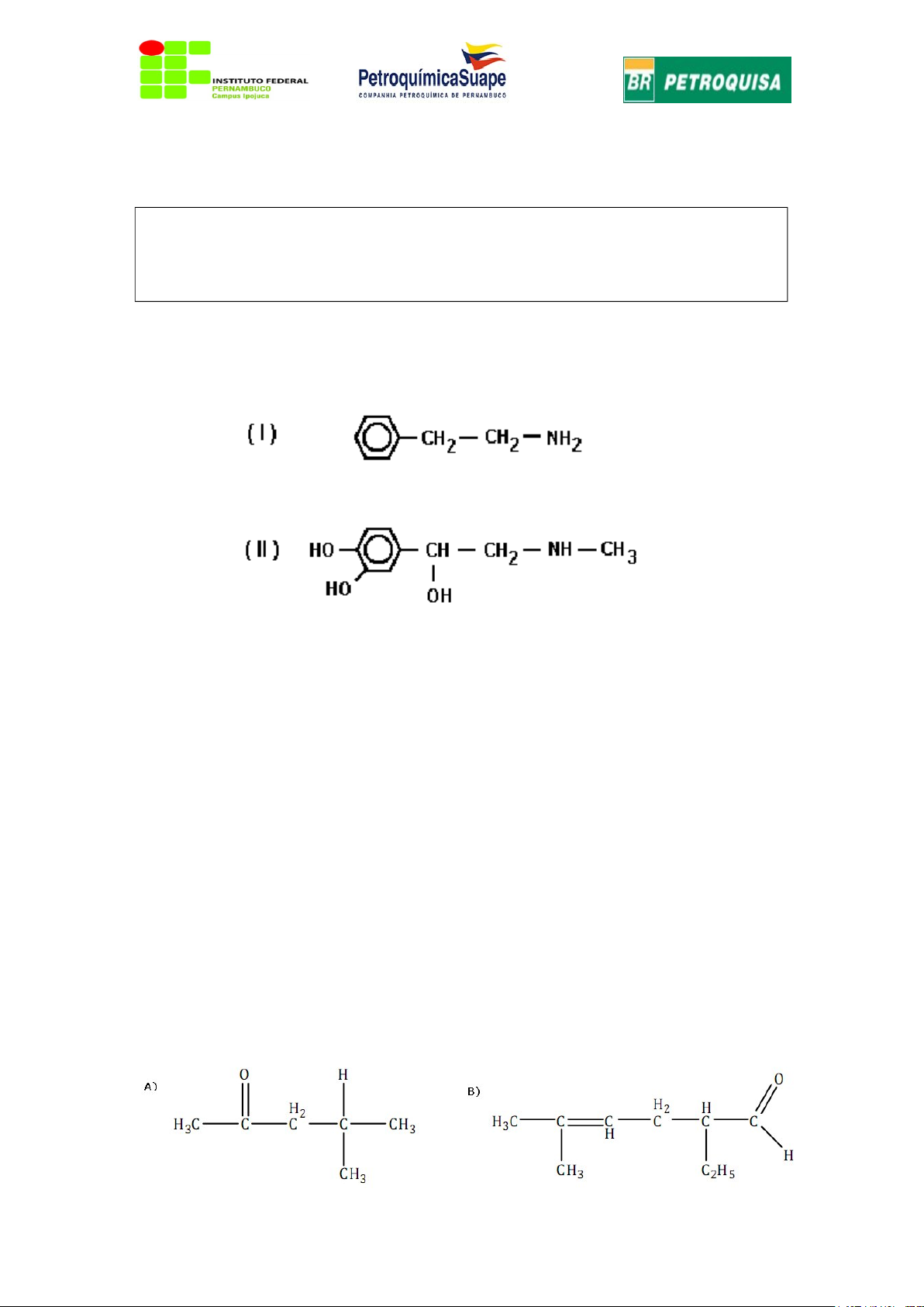 CURSO DE FORMAÇÃO PARA OPERADORES DE PROCESSOS QUÍMICOS Disciplina: [QUÍMICA APLICADA QUALITATIVA] Aluno(a): ____________________________________________________________________ 01 - A seguir são dadas as fórmulas de dois compostos que agem no sistema nervoso simpático: (I) feniletilamina, encontrada no chocolate e (II) adrenalina, um hormônio animal, estimulante cardíaco. a) escreva a equação da reação de ’-feniletilamina com o ácido clorídrico. b) Quais são as funções orgânicas que devem ser responsáveis pela propriedade fisiológica particular da adrenalina? 02 – 5. Menteno, um hidrocarboneto encontrado na hortelã, tem o nome sistemático 1-Isopropil-4-metilcicloexeno. Represente a estrutura. 03 – Dê a nomenclatura IUPAC para os seguintes compostos: AVALIAÇÃO PARCIAL ( x ) AVALIAÇÃO TOTAL ( ) Quantidade de questões: [05] x Valor das Questões: [0,1] Total de pontos: [0,5] 04 - 05 – CURSO DE FORMAÇÃO PARA OPERADORES DE PROCESSOS QUÍMICOS Disciplina: [QUÍMICA APLICADA QUALITATIVA] Aluno(a): ____________________________________________________________________ ( AVALIAÇÃO PARCIAL ( x ) AVALIAÇÃO TOTAL ( ) Quantidade de questões: [ 05] x Valor das Questões: [0,1 ] Total de pontos: [0,5] ) 01 - A seguir são dadas as fórmulas de dois compostos que agem no sistema nervoso simpático: (I) feniletilamina, encontrada no chocolate e (II) adrenalina, um hormônio animal, estimulante cardíaco. a) escreva a equação da reação de ’-feniletilamina com o ácido clorídrico. b) Quais são as funções orgânicas que devem ser responsáveis pela propriedade fisiológica particular da adrenalina? 02 – 5. Menteno, um hidrocarboneto encontrado na hortelã, tem o nome sistemático 1-Isopropil-4-metilcicloexeno. Represente a estrutura. 03 – Dê a nomenclatura IUPAC para os seguintes compostos: 04 - 05 – image5.png image6.png image7.png image8.png image9.png image10.png image11.png image1.png image2.png image3.png image4.png image12.png image13.png image14.jpeg