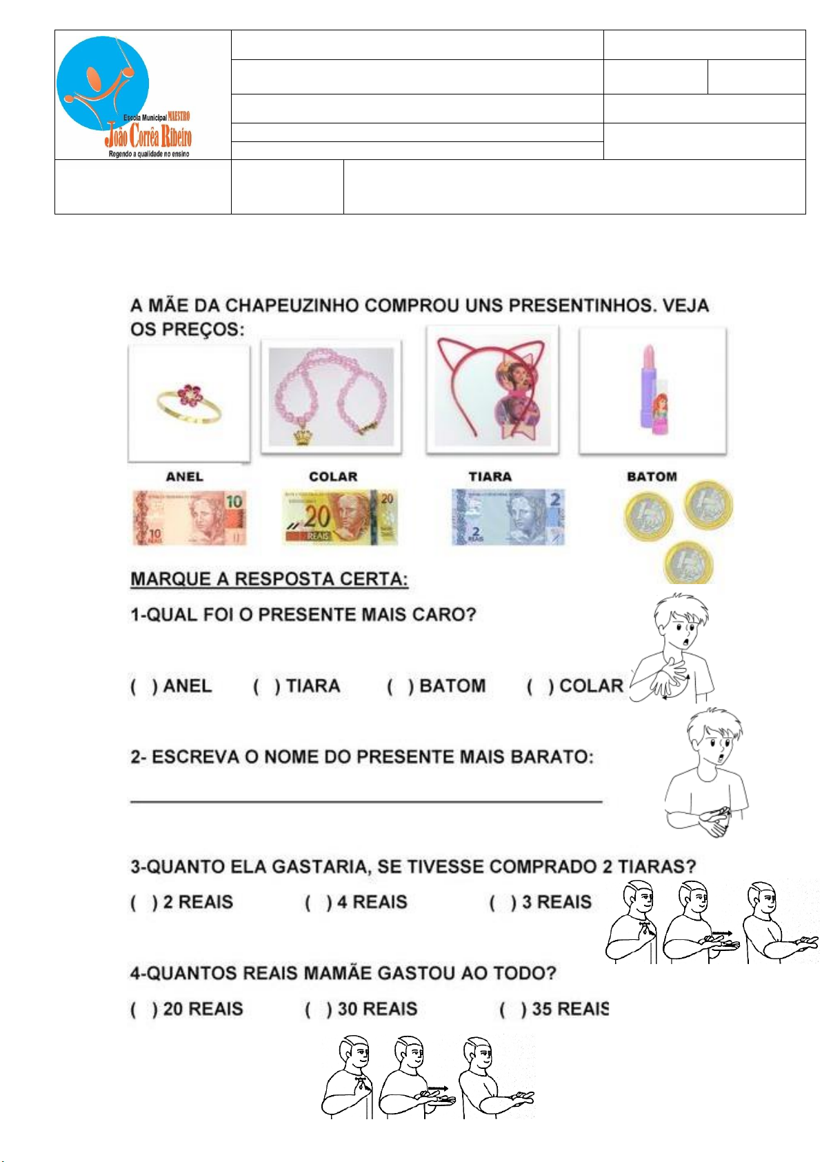 MATEMÁTICA I Escola Municipal Maestro João Correa Ribeiro BIMESTRE Componente Curricular: Aplicações Matemática 1º Professor(a): JULIANA BRASIL Ano/Turma: 9 A Assinatura do Professor: Professor(a) Intérprete: Adriana de Lima G. Mota Data:_____/_____/2020 Aluno (a): Karolina Grazielly do N. de Jesus Instruções:Atividade Adaptada Conteúdo: Moedas e valores Objetivo: Compreender como trabalha com a moeda brasileira valores por meio dos números.