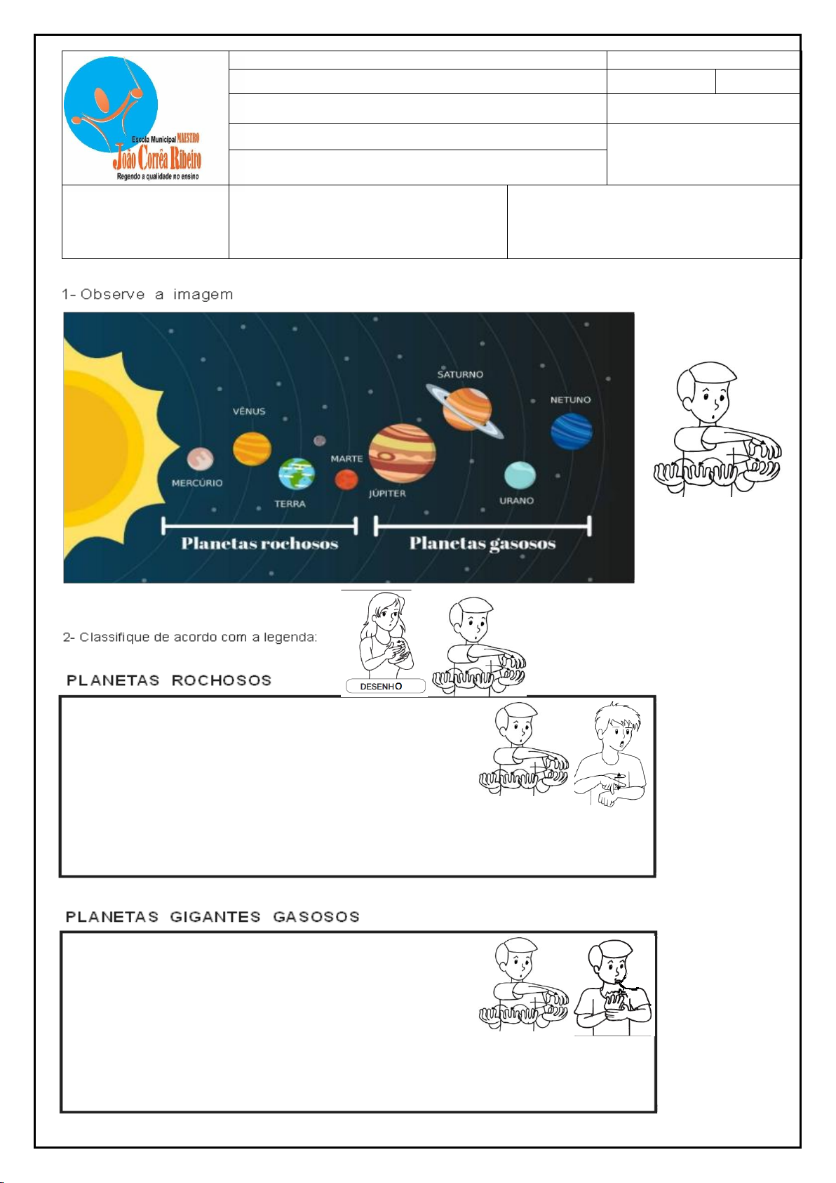 ATIVIDADES A Escola Municipal Maestro João Correa Ribeiro BIMESTRE Componente Curricular: CIÊNCIAS - FÍSICA 1 9ºA Professor(a): RENATA Ano/Turma: 9 A Assinatura do Professor(a): Professor(a) Intérprete: Adriana de Lima G. Mota Data___/_____/2020 Aluno (a): Karolina Grazielly do N. Jesus Instruções: Atividade Adaptada I Conteúdo:Tipos de planetas, sistema solar, tipos de matéria que compõe os planetas. Objetivo: Compreender componentes e tipos planetários, composições e diferenciação entre gasosos e rochosos. Imagens para recortes. ORGANIZAR NO CADERNO SEPARADAMENTE OS PLANETAS COM SINAIS CORRETAMENTE. URANO NETUNO