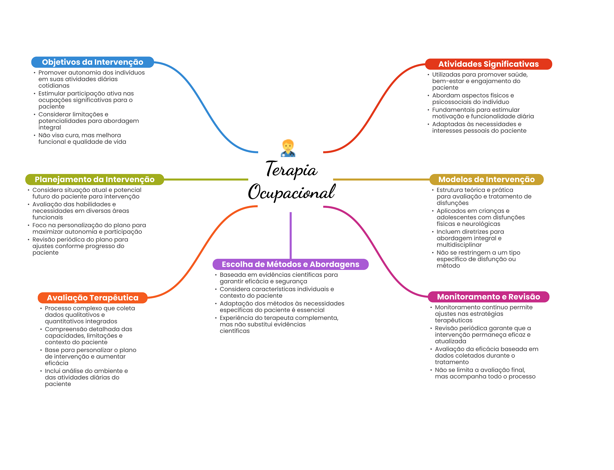 Objetivos da Intervenção Atividades Significativas Promover autonomia dos indivíduos Utilizadas para promover saúde, em suas atividades diárias bem-estar e engajamento do cotidianas paciente Estimular participação ativa nas Abordam aspectos físicos e ocupações significativas para psicossociais do indivíduo paciente Fundamentais para estimular Considerar limitações e motivação e funcionalidade diária potencialidades para abordagem integral Adaptadas às necessidades e interesses pessoais do paciente Não visa cura, mas melhora funcional e qualidade de vida Terapia Planejamento da Intervenção Modelos de Intervenção Considera situação atual e potencial Ocupacional Estrutura teórica e prática futuro do paciente para intervenção para avaliação e tratamento de Avaliação das habilidades e disfunções necessidades em diversas áreas Aplicados em crianças e funcionais adolescentes com disfunções Foco na personalização do plano para físicas e neurológicas maximizar autonomia e participação Incluem diretrizes para Revisão periódica do plano para abordagem integral e ajustes conforme progresso do multidisciplinar paciente Não se restringem a um tipo específico de disfunção ou Escolha de Métodos e Abordagens método Baseada em evidências científicas para garantir eficácia e segurança Considera características individuais e Avaliação Terapêutica contexto do paciente Monitoramento e Revisão Adaptação dos métodos às necessidades Processo complexo que coleta específicas do paciente é essencial Monitoramento contínuo permite dados qualitativos e ajustes nas estratégias quantitativos integrados Experiência do terapeuta complementa, terapêuticas mas não substitui evidências Compreensão detalhada das científicas Revisão periódica garante que a capacidades, limitações e intervenção permaneça eficaz e contexto do paciente atualizada Base para personalizar plano Avaliação da eficácia baseada em de intervenção e aumentar dados coletados durante eficácia tratamento Inclui análise do ambiente e Não se limita a avaliação final, das atividades diárias do mas acompanha todo O processo paciente