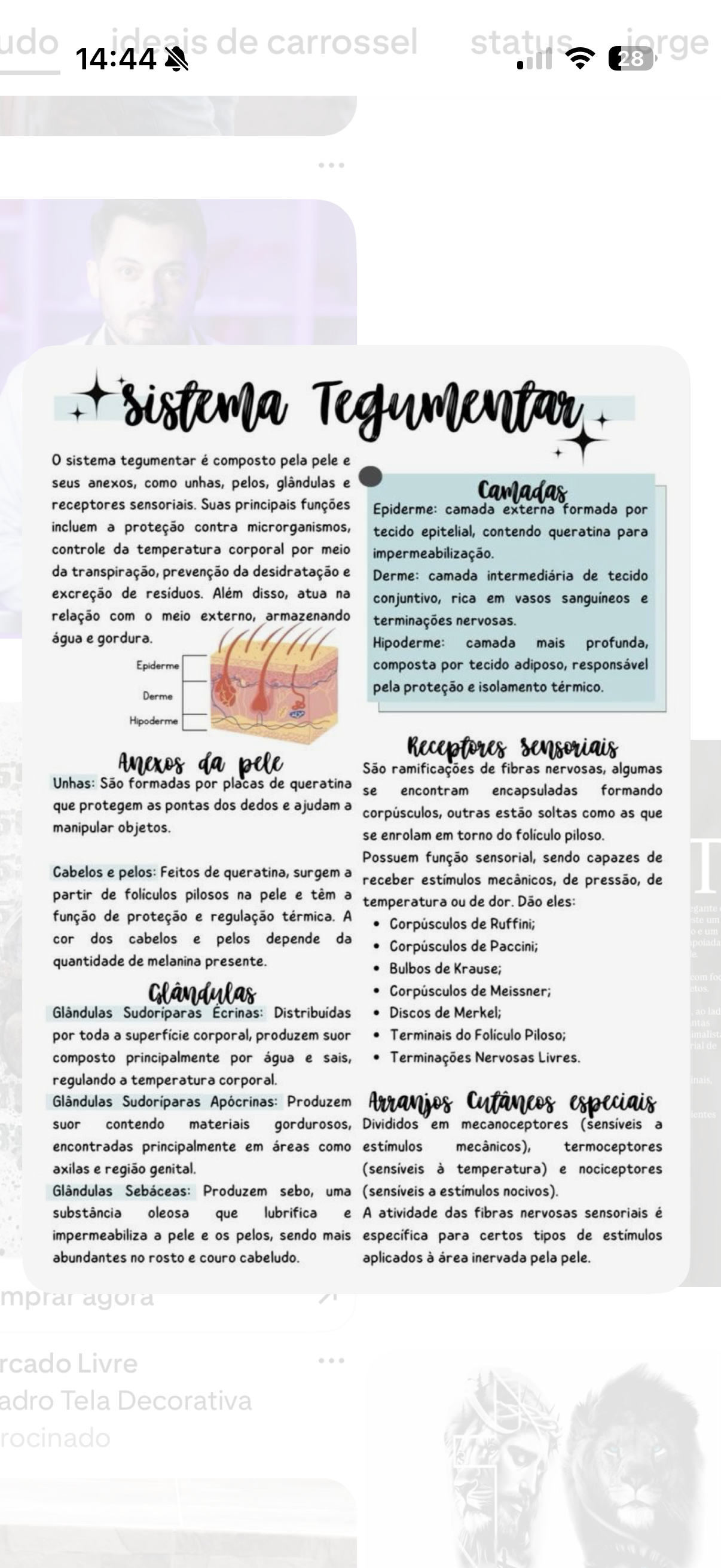 udo 14:44 ideais de carrossel status jorge sistema Tegumentar 0 sistema tegumentar é composto pela pele e seus anexos, como unhas, pelos, glândulas e Camadas receptores sensoriais. Suas principais funções Epiderme: camada externa formada por incluem a proteção contra microrganismos, tecido epitelial, contendo queratina para controle da temperatura corporal por meio impermeabilização. da transpiração, prevenção da desidratação e Derme: camada intermediária de tecido excreção de residuos. Além disso, atua na conjuntivo, rica em vasos sanguineos e relação com meio externo, armazenando terminações nervosas. água e gordura. Hipoderme: camada mais profunda, Epiderme composta por tecido adiposo, responsável pela proteção e isolamento térmico. Derme Hipoderme Receptores sensoriais da pele São ramificações de fibras nervosas, algumas Unhas: São formadas por placas de queratina se encontram encapsuladas formando que protegem as pontas dos dedos e ajudam a corpúsculos, outras estão soltas como as que manipular objetos. se enrolam em torno do piloso. Possuem função sensorial, sendo capazes de Cabelos e pelos: Feitos de queratina, surgem a receber mecânicos, de pressão, de partir de foliculos pilosos na pele e têm a temperatura ou de dor. Dão eles: função de proteção e regulação térmica. A Corpúsculos de Ruffini; cor dos cabelos e pelos depende da Corpúsculos de Paccini; quantidade de melanina presente. Bulbos de Krause; Glândulas Corpúsculos de Meissner; Glândulas Sudoriparas Ecrinas: Discos de Merkel; por toda a superficie corporal, produzem suor Terminais do Folículo Piloso; composto principalmente por água e sais, Terminações Nervosas Livres. regulando a temperatura corporal. Glândulas Sudoriparas Apócrinas: Produzem Arranjos especiais suor contendo materiais gordurosos, Divididos em mecanoceptores (sensíveis a encontradas principalmente em áreas como estimulos mecânicos), termoceptores axilas e região genital. (sensiveis à temperatura) e nociceptores Glândulas Sebáceas: Produzem sebo, uma a nocivos). substância oleosa que lubrifica e A atividade das fibras nervosas sensoriais é impermeabiliza a pele e os pelos, sendo mais específica para certos tipos de abundantes no rosto e couro cabeludo. aplicados à área inervada pela pele. mprar agora rcado Livre adro Tela Decorativa rocinado