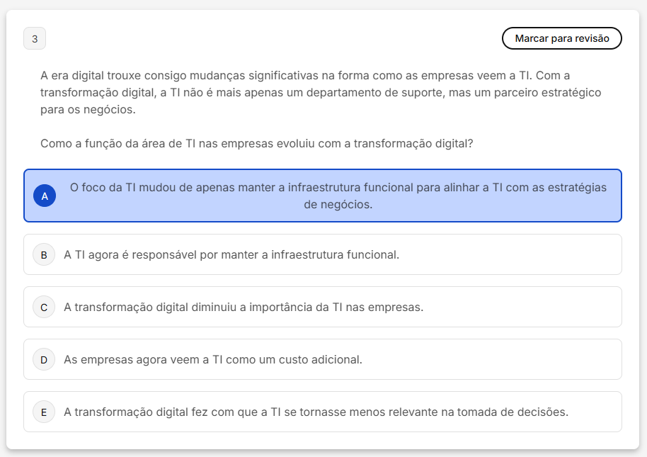 3 Marcar para revisão A era digital trouxe consigo mudanças significativas na forma como as empresas veem a TI. Com a transformação digital, a TI não é mais apenas um departamento de suporte, mas um parceiro estratégico para OS negócios. Como a função da área de TI nas empresas evoluiu com a transformação digital? foco da TI mudou de apenas manter a infraestrutura funcional para alinhar a TI com as estratégias A de negócios. B A TI agora é responsável por manter a infraestrutura funcional. C A transformação digital diminuiu a importância da TI nas empresas. D As empresas agora veem a TI como um custo adicional. E A transformação digital fez com que a TI se tornasse menos relevante na tomada de decisões.