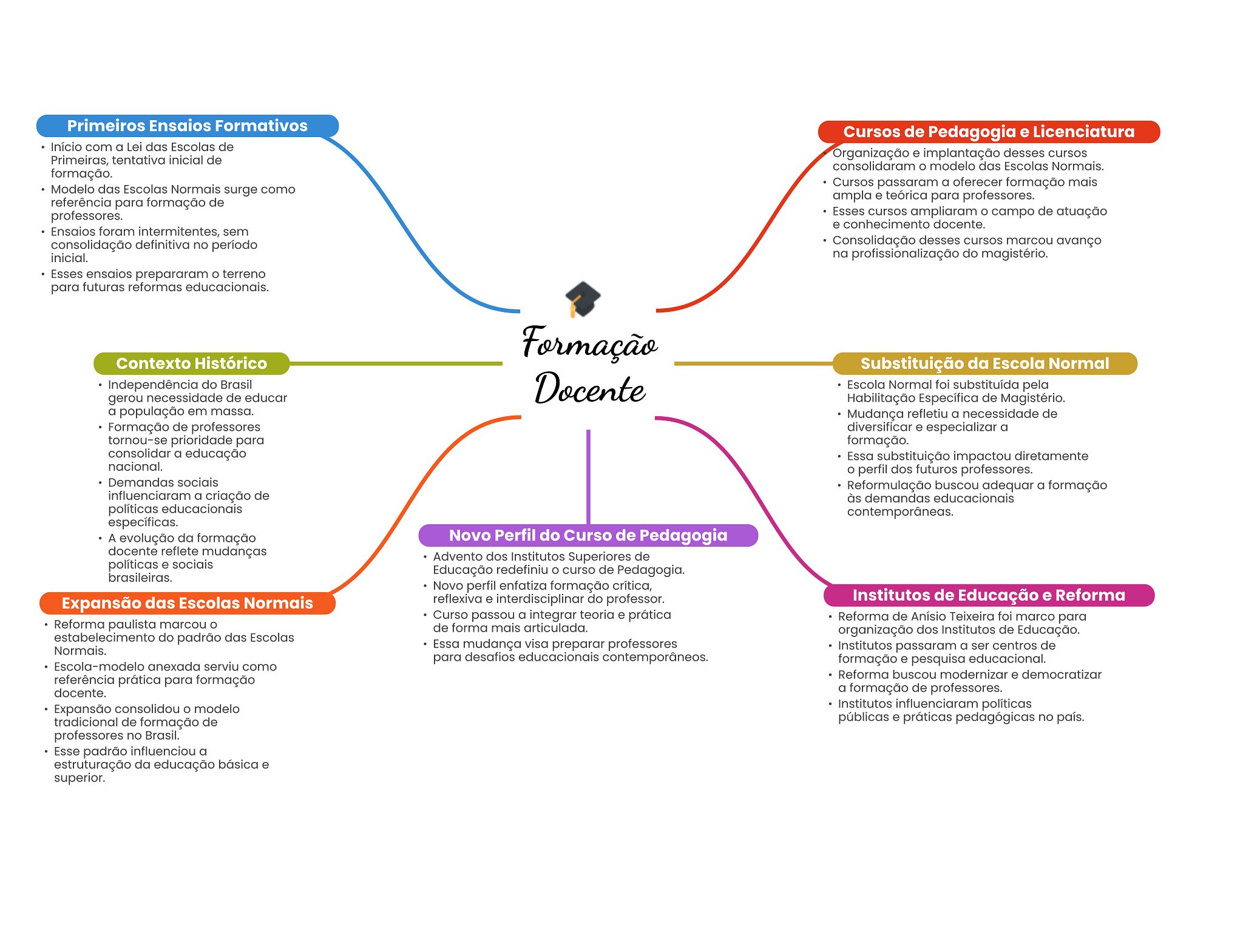 Primeiros Ensaios Formativos Cursos de Pedagogia e Licenciatura Início com a Lei das Escolas de Primeiras, tentativa inicial de Organização e implantação desses cursos consolidaram modelo das Escolas Normais. formação. Cursos passaram a oferecer formação mais Modelo das Escolas Normais surge como referência para formação de ampla e teórica para professores. professores. Esses cursos ampliaram campo de atuação e conhecimento docente. Ensaios foram intermitentes, sem consolidação definitiva no período Consolidação desses cursos marcou avanço inicial. na profissionalização do magistério. Esses ensaios prepararam terreno para futuras reformas educacionais. Formação Contexto Histórico Substituição da Escola Normal Independência do Brasil gerou necessidade de educar Docente Escola Normal foi substituída pela Habilitação Específica de Magistério. a população em massa. Mudança refletiu a necessidade de Formação de professores diversificar e especializar a tornou-se prioridade para formação. consolidar a educação Essa substituição impactou diretamente nacional. perfil dos futuros professores. Demandas sociais Reformulação buscou adequar a formação influenciaram a criação de às demandas educacionais políticas educacionais contemporâneas. específicas. A evolução da formação Novo Perfil do Curso de Pedagogia docente reflete mudanças Advento dos Institutos Superiores de políticas e sociais Educação redefiniu curso de Pedagogia. brasileiras. Novo perfil enfatiza formação crítica, Expansão das Escolas Normais reflexiva e interdisciplinar do professor. Institutos de Educação e Reforma Curso passou a integrar teoria e prática Reforma de Anísio Teixeira foi marco para Reforma paulista marcou de forma mais articulada. organização dos Institutos de Educação. estabelecimento do padrão das Escolas Normais. Essa mudança visa preparar professores Institutos passaram a ser centros de para desafios educacionais contemporâneos. formação e pesquisa educacional. Escola-modelo anexada serviu como referência prática para formação Reforma buscou modernizar e democratizar docente. a formação de professores. Expansão consolidou modelo Institutos influenciaram políticas tradicional de formação de públicas e práticas pedagógicas no país. professores no Brasil. Esse padrão influenciou a estruturação da educação básica e superior.