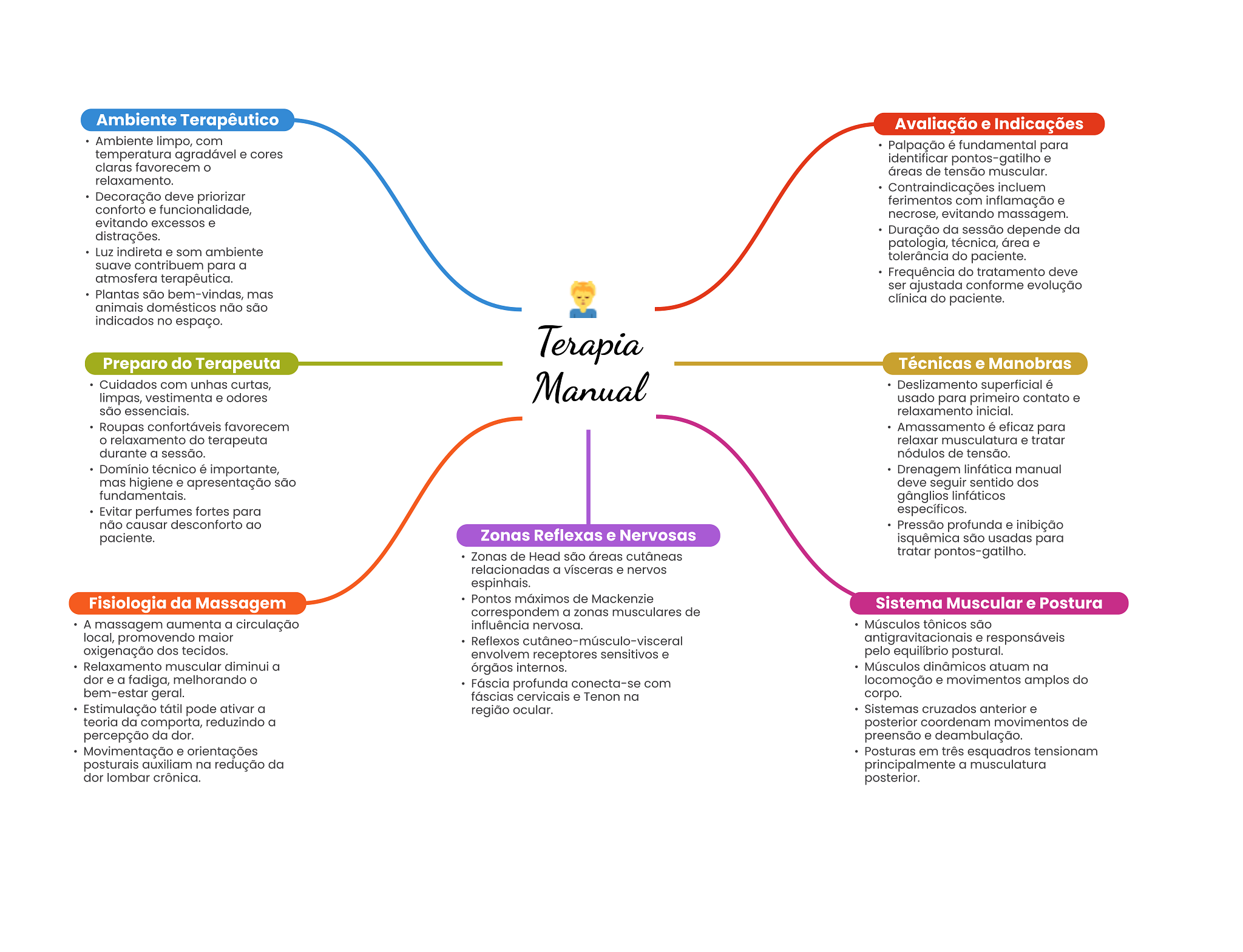 Ambiente Terapêutico Avaliação e Indicações Ambiente limpo, com Palpação é fundamental para temperatura agradável e cores identificar pontos-gatilho e claras favorecem áreas de tensão muscular. relaxamento. Contraindicações incluem Decoração deve priorizar ferimentos com inflamação e conforto e funcionalidade, necrose, evitando massagem. evitando excessos e distrações. Duração da sessão depende da patologia, técnica, área e Luz indireta e som ambiente tolerância do paciente. suave contribuem para a atmosfera terapêutica. Frequência do tratamento deve ser ajustada conforme evolução Plantas são bem-vindas, mas clínica do paciente. animais domésticos não são indicados no espaço. Terapia Preparo do Terapeuta Técnicas e Manobras Cuidados com unhas curtas, limpas, vestimenta e odores Manual Deslizamento superficial é usado para primeiro contato e são essenciais. relaxamento inicial. Roupas confortáveis favorecem Amassamento é eficaz para relaxamento do terapeuta relaxar musculatura e tratar durante a sessão. nódulos de tensão. Domínio técnico é importante, Drenagem linfática manual mas higiene e apresentação são deve seguir sentido dos fundamentais. gânglios linfáticos Evitar perfumes fortes para específicos. não causar desconforto ao Pressão profunda e inibição paciente. Zonas Reflexas e Nervosas isquêmica são usadas para Zonas de Head são áreas cutâneas tratar pontos-gatilho. relacionadas a vísceras e nervos espinhais. Fisiologia da Massagem Pontos máximos de Mackenzie Sistema Muscular e Postura correspondem a zonas musculares de A massagem aumenta a circulação influência nervosa. Músculos tônicos são local, promovendo maior Reflexos antigravitacionais e responsáveis oxigenação dos tecidos. envolvem receptores sensitivos e pelo equilíbrio postural. Relaxamento muscular diminui a órgãos internos. Músculos dinâmicos atuam na dor e a fadiga, melhorando Fáscia profunda conecta-se com locomoção e movimentos amplos do bem-estar geral. fáscias cervicais e Tenon na corpo. Estimulação tátil pode ativar a região ocular. Sistemas cruzados anterior e teoria da comporta, reduzindo a posterior coordenam movimentos de percepção da dor. preensão e deambulação. Movimentação e orientações Posturas em três esquadros tensionam posturais auxiliam na redução da principalmente a musculatura dor lombar crônica. posterior.
