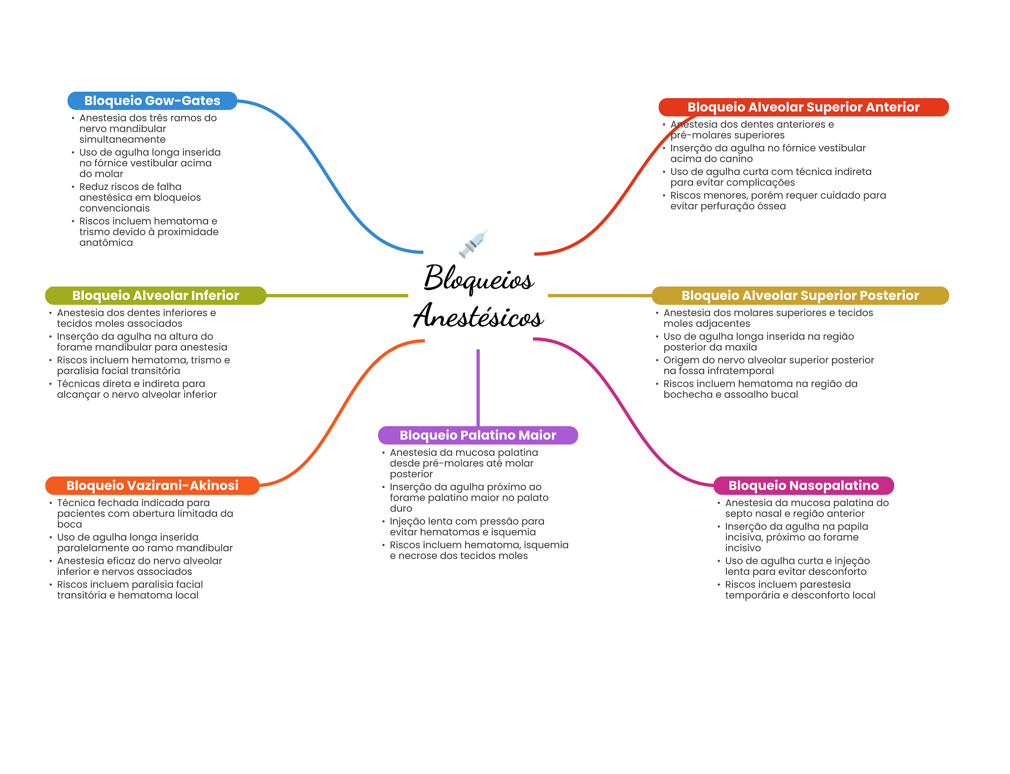 Bloqueio Gow-Gates Bloqueio Alveolar Superior Anterior Anestesia dos três ramos do nervo mandibular Anestesia dos dentes anteriores e simultaneamente pré-molares superiores Uso de agulha longa inserida Inserção da agulha no fórnice vestibular no fórnice vestibular acima acima do canino do molar Uso de agulha curta com técnica indireta Reduz riscos de falha para evitar complicações anestésica em bloqueios Riscos menores, porém requer cuidado para convencionais evitar perfuração óssea Riscos incluem hematoma e trismo devido à proximidade anatômica Bloqueios Bloqueio Alveolar Inferior Bloqueio Alveolar Superior Posterior Anestesia dos dentes inferiores e tecidos moles associados Anestésicos Anestesia dos molares superiores e tecidos moles adjacentes Inserção da agulha na altura do Uso de agulha longa inserida na região forame mandibular para anestesia posterior da maxila Riscos incluem hematoma, trismo e Origem do nervo alveolar superior posterior paralisia facial transitória na fossa infratemporal Técnicas direta e indireta para Riscos incluem hematoma na região da alcançar nervo alveolar inferior bochecha e assoalho bucal Bloqueio Palatino Maior Anestesia da mucosa palatina desde pré-molares até molar posterior Bloqueio Vazirani-Akinosi Inserção da agulha próximo ao Bloqueio Nasopalatino Técnica fechada indicada para forame palatino maior no palato duro Anestesia da mucosa palatina do pacientes com abertura limitada da septo nasal e região anterior boca Injeção lenta com pressão para Uso de agulha longa inserida evitar hematomas e isquemia Inserção da agulha na papila incisiva, próximo ao forame paralelamente ao ramo mandibular Riscos incluem hematoma, isquemia incisivo e necrose dos tecidos moles Anestesia eficaz do nervo alveolar Uso de agulha curta e injeção inferior e nervos associados lenta para evitar desconforto Riscos incluem paralisia facial Riscos incluem parestesia transitória e hematoma local temporária e desconforto local