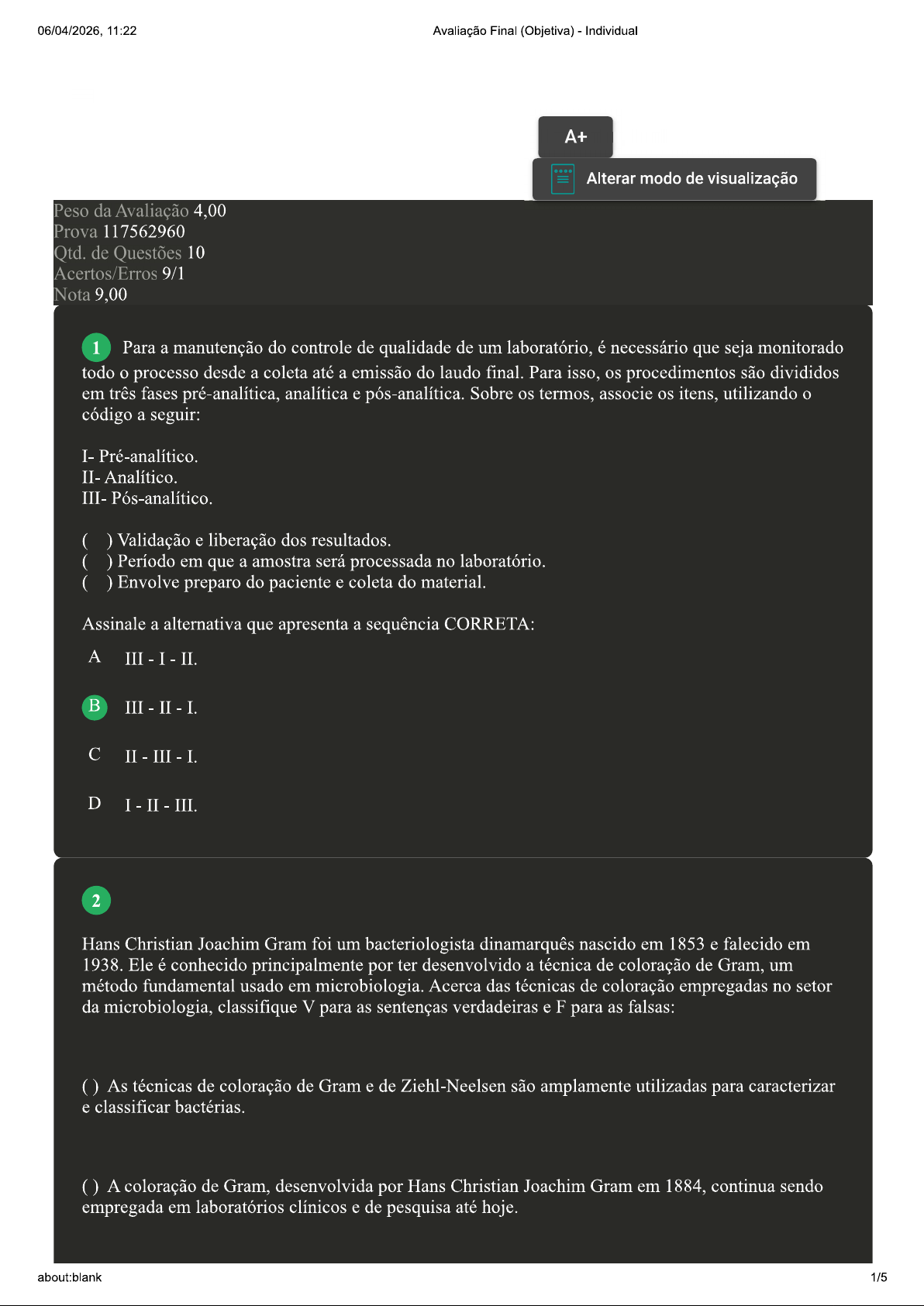 06/04/2026, 11:22 Avaliação Final (Objetiva) Individual A+ Alterar modo de visualização Peso da Avaliação 4,00 Prova 117562960 Qtd. de Questões 10 Acertos/Erros 9/1 Nota 9,00 1 Para a manutenção do controle de qualidade de um laboratório, é necessário que seja monitorado todo o processo desde a coleta até a emissão do laudo final. Para isso, os procedimentos são divididos em três fases pré-analítica, analítica e pós-analítica. Sobre os termos, associe os itens, utilizando o código a seguir: I- Pré-analítico. II- Analítico. III- Pós-analítico. ( ) Validação e liberação dos resultados. ( ) Período em que a amostra será processada no laboratório. ( ) Envolve preparo do paciente e coleta do material. Assinale a alternativa que apresenta a sequência CORRETA: A III I II. III - II I. II III I. D I II III. 2 Hans Christian Joachim Gram foi um bacteriologista dinamarquês nascido em 1853 e falecido em 1938. Ele é conhecido principalmente por ter desenvolvido a técnica de coloração de Gram, um método fundamental usado em microbiologia. Acerca das técnicas de coloração empregadas no setor da microbiologia, classifique V para as sentenças verdadeiras e F para as falsas: () As técnicas de coloração de Gram e de Ziehl-Neelsen são amplamente utilizadas para caracterizar e classificar bactérias. () A coloração de Gram, desenvolvida por Hans Christian Joachim Gram em 1884, continua sendo empregada em laboratórios clínicos e de pesquisa até hoje. about:blank 1/506/04/2026, 11:22 Avaliação Final (Objetiva) Individual () A coloração de Gram permite diferenciar dois principais grupos de bactérias: as Gram positivas e as Gram negativas, com base nas diferenças em suas paredes celulares. Assinale a alternativa que apresenta a sequência CORRETA: A V-F-F D 3 M. tuberculosis é um patógeno intracelular capaz de provocar uma infecção que pode durar a vida toda. A existência de infecções persistentes, sem progressão para doença, envolve uma delicada relação entre o hospedeiro e o parasita. Sobre a doença, analise as sentenças a seguir: I- Quando em contato com o hospedeiro, o M. tuberculosis entra pelas vias respiratórias, penetrando nos alvéolos, onde não é fagocitado. II- As bactérias impedem a fusão dos fagossomos com os lisossomos e escapam da morte provocada pelos macrófagos. III- agrupamento de células necróticas (chamado granuloma) resultante vai conter a infecção. IV- granuloma permitirá a sobrevivência de algumas bactérias. Assinale a alternativa CORRETA: A Somente a sentença II está correta. B As sentenças II, III e IV estão corretas. Somente a sentença I está correta. D As sentenças I e II estão corretas. 4 A baciloscopia apresenta limitação quanto a sua sensibilidade, e sua especificidade também não é de 100%. Falsos positivos podem ocorrer, quer por outras micobactérias, quer por bactérias como Nocardia sp. e Rhodococcusequi. Para a indicação do resultado são utilizadas cruzes que indicam a quantidade de bactérias encontradas. Assinale a alternativa que apresenta a indicação CORRETA: A Positivo +++: em média mais de 30 BAAR por campo. B Positivo +++: em média mais de 10 BAAR por campo. Positivo +++: em média mais de 5 BAAR por campo. about:blank 2/506/04/2026, 11:22 Avaliação Final (Objetiva) Individual D Positivo +++: em média mais de 20 BAAR por campo. Revisar Conteúdo do Livro 5 [Laboratório Virtual Preparação do Meio de Cultura] Meios de cultura são ferramentas essenciais em um laboratório de microbiologia. Uma ampla seleção de meios de cultura de ágar e caldo permite recuperação, crescimento e caracterização ideais de microrganismos de amostras clínicas. Com relação às observações feitas no experimento de preparo do meio de cultura, assinale a alternativa CORRETA: A A capela de fluxo laminar ou cuidado análogo não é empregado no preparo de meios de cultura, somente no repique de bactérias. B Todo o experimento precisa obrigatoriamente ser conduzido em capela de fluxo laminar. Ao menos parte do preparo deve ser realizada na capela de fluxo laminar, ou equipamento análogo. D Por se tratar de meios que são estéreis, o uso de capela de fluxo laminar é redundante. 6 A biossegurança é um conjunto de ações voltadas para prevenção, minimização e eliminação de riscos para a saúde, ajuda na proteção do meio ambiente contra resíduos e na conscientização do profissional da saúde. Avaliando a seguinte situação: Elevado risco individual e risco limitado para a comunidade. Os patógenos geralmente causam doenças graves ao homem ou aos animais e podem representar um sério risco a quem os manipulam. Sobre qual risco se trata a afirmação, assinale a alternativa CORRETA: A Risco 1. B Risco 3. Risco 4. D Risco 2. 7 Amoxicilina é um antibiótico usado para tratar vários tipos de infecções bacterianas. Considerada eficaz e segura, tem uso pediátrico, é indicada para gestantes, lactantes e até idosos. Sobre este antibiótico, avalie as asserções a seguir e a relação proposta entre elas: about:blank 3/506/04/2026, 11:22 Avaliação Final (Objetiva) Individual I- A amoxicilina é a aminopenicilina mais utilizada para tratamentos pela via oral. PORQUE II- Possui uma boa ação contra bactérias da cavidade oral, trato respiratório superior e inferior, seja sozinha ou conjugada com clavulanato. Assinale a alternativa CORRETA: A As asserções I e II são proposições falsas. B A asserção I é uma proposição verdadeira, e a II é uma proposição falsa. As asserções I e II são proposições verdadeiras, e a II é uma justificativa da I. D As asserções I e II são proposições verdadeiras, mas a II não é uma justificativa da I. 8 Os macrolídeos atuam na inibição da síntese proteica, impedindo a fixação do RNA transportador ao ribossomo e bloqueando a disponibilidade de aminoácidos. Podem apresentar atividade bactericida ou bacteriost