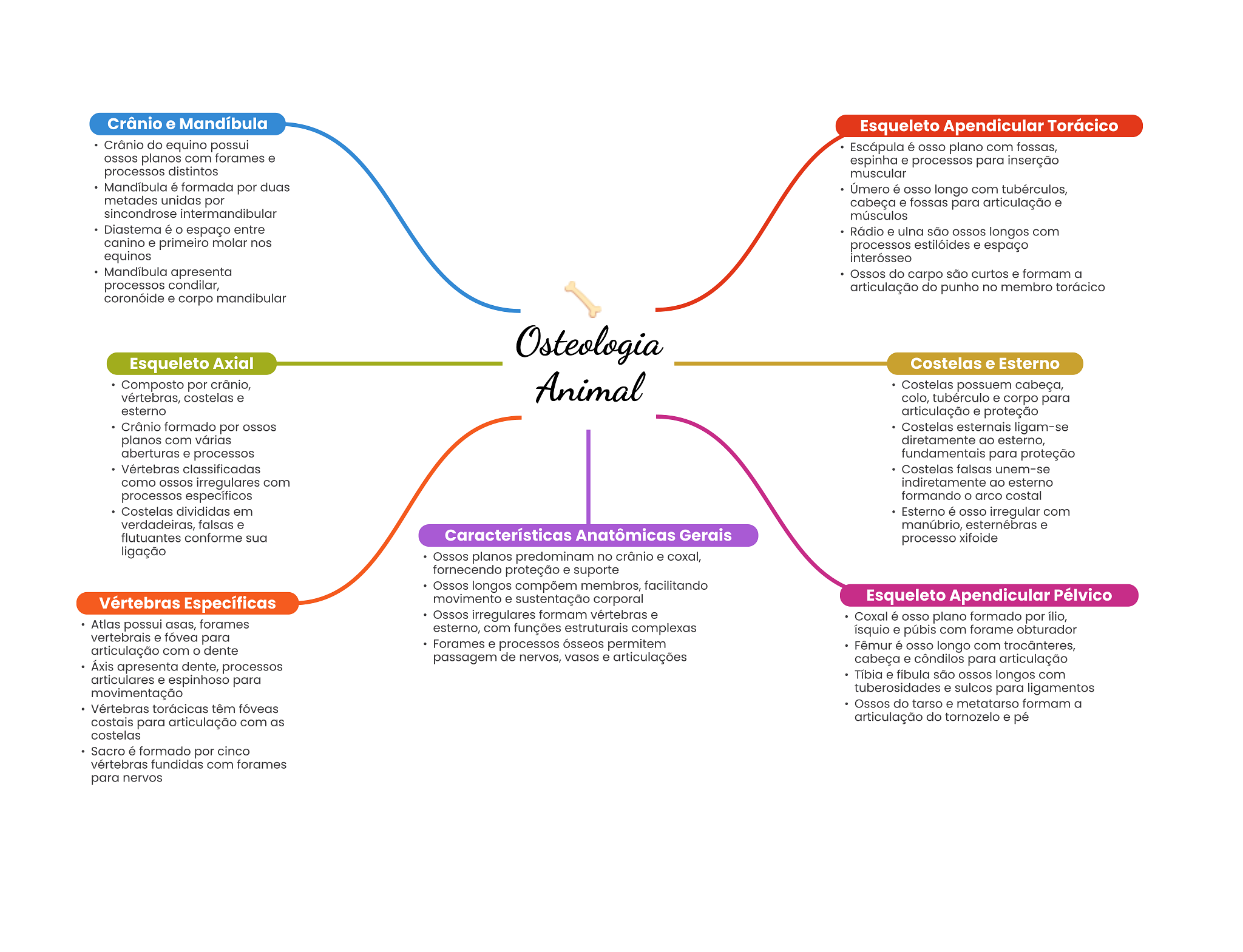 Crânio e Mandíbula Esqueleto Apendicular Torácico Crânio do equino possui Escápula é osso plano com fossas, planos com forames e espinha e processos para inserção processos distintos muscular Mandíbula é formada por duas Úmero é OSSO longo com tubérculos, metades unidas por cabeça e fossas para articulação e sincondrose intermandibular músculos Diastema é espaço entre Rádio e ulna são longos com canino e primeiro molar nos processos estilóides e espaço equinos interósseo Mandíbula apresenta Ossos do carpo são curtos e formam a processos condilar, articulação do punho no membro torácico coronóide e corpo mandibular Osteologia Esqueleto Axial Costelas e Esterno Composto por crânio, Animal Costelas possuem cabeça, vértebras, costelas e colo, tubérculo e corpo para esterno articulação e proteção Crânio formado por OSSOS Costelas esternais ligam-se planos com várias diretamente ao esterno, aberturas e processos fundamentais para proteção Vértebras classificadas Costelas falsas unem-se como OSSOS irregulares com indiretamente ao esterno processos específicos formando arco costal Costelas divididas em Esterno é irregular com verdadeiras, falsas e manúbrio, esternébras e flutuantes conforme sua Características Anatômicas Gerais processo xifoide ligação Ossos planos predominam no crânio e fornecendo proteção e suporte Ossos longos compõem membros, facilitando Vértebras Específicas movimento e sustentação corporal Esqueleto Apendicular Pélvico Ossos irregulares formam vértebras e Coxal é plano formado por Atlas possui asas, forames esterno, com funções estruturais complexas ísquio e púbis com forame obturador vertebrais e fóvea para articulação com O dente Forames e processos ósseos permitem Fêmur é longo com trocânteres, passagem de nervos, vasos e articulações Áxis apresenta dente, processos cabeça e côndilos para articulação articulares e espinhoso para Tíbia e fíbula são longos com movimentação tuberosidades e sulcos para ligamentos Vértebras torácicas têm fóveas Ossos do tarso e metatarso formam a costais para articulação com as articulação do tornozelo e pé costelas Sacro é formado por cinco vértebras fundidas com forames para nervos