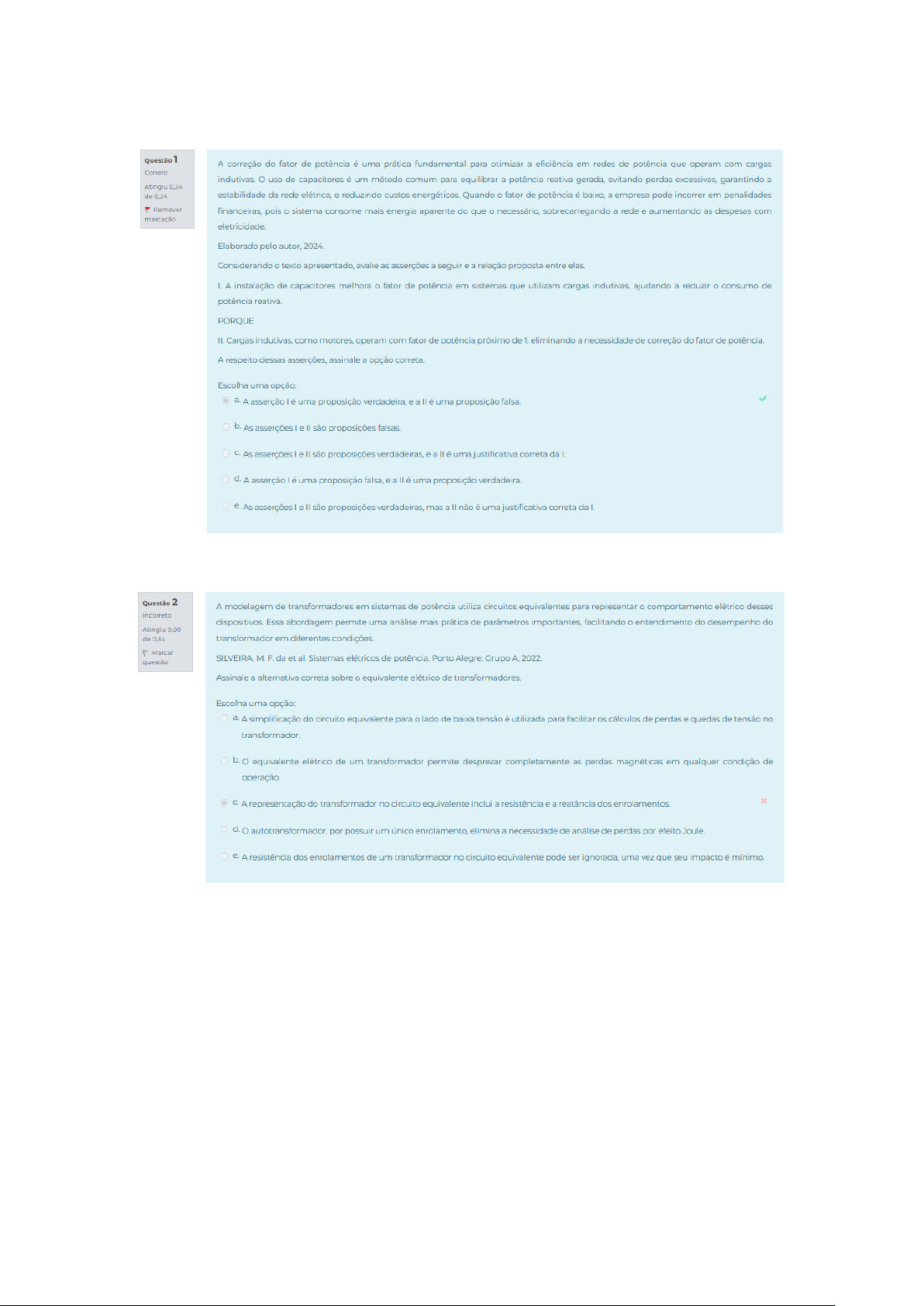 Questão 1 A correção do fator de potência é uma prática fundamental para otimizar a eficiência em redes de potência que operam com cargas Correto uso de capacitores é um método comum para equilibrar a potência reativa gerada, evitando perdas excessivas, garantindo a Atingiu 0,34 de estabilidade da rede elétrica, e reduzindo custos energéticos. Quando fator de potência é baixo, a empresa pode incorrer em penalidades Remover financeiras, pois sistema consome mais energia aparente do que necessário, sobrecarregando a rede e aumentando as despesas com marcação eletricidade. Elaborado pelo autor, Considerando texto apresentado, avalie as asserções a seguir e a relação proposta entre elas. A instalação de capacitores melhora fator de potência em sistemas que utilizam cargas indutivas, ajudando a reduzir consumo de potência reativa. PORQUE Cargas indutivas, como motores, operam com fator de potência próximo de 1, eliminando a necessidade de correção do fator de potência. A respeito dessas asserções, assinale a opção Escolha uma opção: A asserção é uma proposição verdadeira, e a é uma proposição falsa. b. As asserções le são proposições falsas. As asserções le são proposições verdadeiras, e a é uma justificativa correta da d. A asserção é uma proposição falsa, e a é uma proposição verdadeira. As asserções le são proposições verdadeiras, mas a não é uma justificativa correta da Questão 2 A modelagem de transformadores em sistemas de potência utiliza circuitos equivalentes para representar comportamento elétrico desses dispositivos. Essa abordagem permite uma análise mais prática de parâmetros importantes, facilitando entendimento do desempenho do Atingiu de transformador em diferentes condições. P Marcar questão M.F. da et al. Sistemas elétricos de potência. Porto Alegre: Grupo A, 2022. Assinale a alternativa correta sobre equivalente elétrico de Escolha uma opção: A simplificação do circuito equivalente para lado de baixa tensão é utilizada para facilitar cálculos de perdas e quedas de tensão no transformador. b. equivalente elétrico de um transformador permite desprezar completamente as perdas magnéticas em qualquer condição de operação. A representação do transformador no circuito equivalente inclui a resistência e a reatância dos d. autotransformador, por possuir um único enrolamento, elimina a necessidade de análise de perdas por efeito Joule. A resistência dos enrolamentos de um transformador no circuito equivalente pode ser ignorada, uma vez que seu impacto éQuestão 3 A simulação de cargas elétricas permite prever comportamento de diferentes tipos de cargas em redes de potência. Ferramentas Correto computacionais são utilizadas para testar cenários operacionais, avaliando impacto de cargas resistivas, indutivas e capacitivas no fluxo de Atingiu de potência e na estabilidade da rede. Cargas desequilibradas podem afetar a qualidade da energia, causando distorções harmônicas que P Marcar comprometem desempenho de equipamentos sensíveis. questão OLIVEIRA, I.C. de et al. Transmissão e distribuição de energia. Porto Alegre: Grupo 2021. Classifique as afirmações a seguir como verdadeiras (V) ou falsas (F). () A simulação de cargas indutivas em redes elétricas permite prever impacto no fator de potência e identificar a necessidade de compensação com capacitores. II. () Cargas capacitivas, quando simuladas, tendem a melhorar a estabilidade da rede sem a necessidade de ajustes adicionais para evitar III. () Ferramentas de simulação podem ser utilizadas para avaliar impacto de cargas desequilibradas no fluxo de potência, permitindo ajustes no sistema. Assinale a opção que apresenta a sequência correta. Escolha uma opção: Questão 4 A modelagem de máquinas síncronas é essencial para entender seu comportamento em sistemas de potência, tanto em regime Correto permanente quanto em condições dinâmicas. As máquinas síncronas são amplamente utilizadas na geração de energia e são responsáveis Atingiu 0,34 de pelo controle de frequência e estabilidade do sistema, especialmente em resposta a variações de carga e perturbações na rede. P Marcar Sistemas elétricos de potência: métodos de análise e solução. Curitiba: 2018. questão Considerando texto apresentado, avalie as afirmações a seguir. Em regime permanente, circuito equivalente de uma máquina síncrona inclui a resistência do estator e a reatância síncrona, fatores essenciais para calcular O fluxo de potência. Pequenas perturbações, como variações de carga, podem causar oscilações temporárias no ângulo de rotação do rotor, afetando a estabilidade angular da máquina. III. A estabilidade angular de uma máquina síncrona é irrelevante para a estabilidade global do sistema, desde que a frequência da rede seja mantida constante. É correto O que se afirma em: Escolha uma opção: a. apenas. b. III, apenas. C. II, apenas. d. III. e.Questão 5 Linhas de transmissão são essenciais para transportar energia elétrica entre geradores e consumidores, sendo caracterizadas por diversos Correto parâmetros elétricos que influenciam diretamente sua operação. Esses parâmetros afetam O desempenho da linha em termos de eficiência, Atingiu 0,34 de estabilidade e qualidade da energia fornecida. P Marcar SILVEIRA, M.F. da et al. Sistemas elétricos de potência. Porto Alegre: Grupo A, 2022. questão Classifique as afirmações a seguir como verdadeiras (V) ou falsas (F). () A resistência das linhas de transmissão contribui diretamente para as perdas por aquecimento, influenciando a eficiência da transmissão de energia. II. () A capacitância de uma linha curta é O principal fator que determina as perdas de energia por dissipação ao longo da linha. III. () A reatância pode impactar a estabilidade do sistema, especialmente em cenários de alta demanda, afetando a regulação de tensão