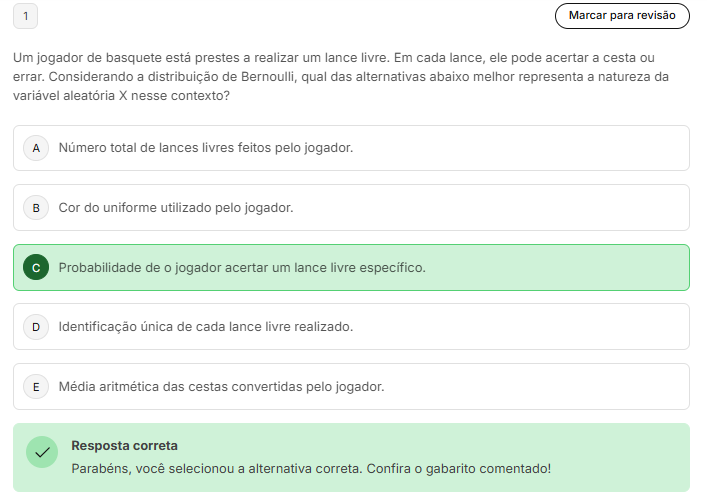 1 Marcar para revisão Um jogador de basquete prestes a realizar um lance livre. Em cada lance, ele pode acertar a cesta ou errar. Considerando a distribuição de Bernoulli, qual das alternativas abaixo melhor representa a natureza da variável X nesse contexto? A Número total de lances livres feitos pelo jogador. B Cor do uniforme utilizado pelo jogador. C Probabilidade de jogador acertar um lance livre específico. D Identificação única de cada lance livre realizado. E aritmética das cestas convertidas pelo jogador. Resposta correta Parabens, você selecionou a alternativa correta. Confira 0 gabarito comentado!