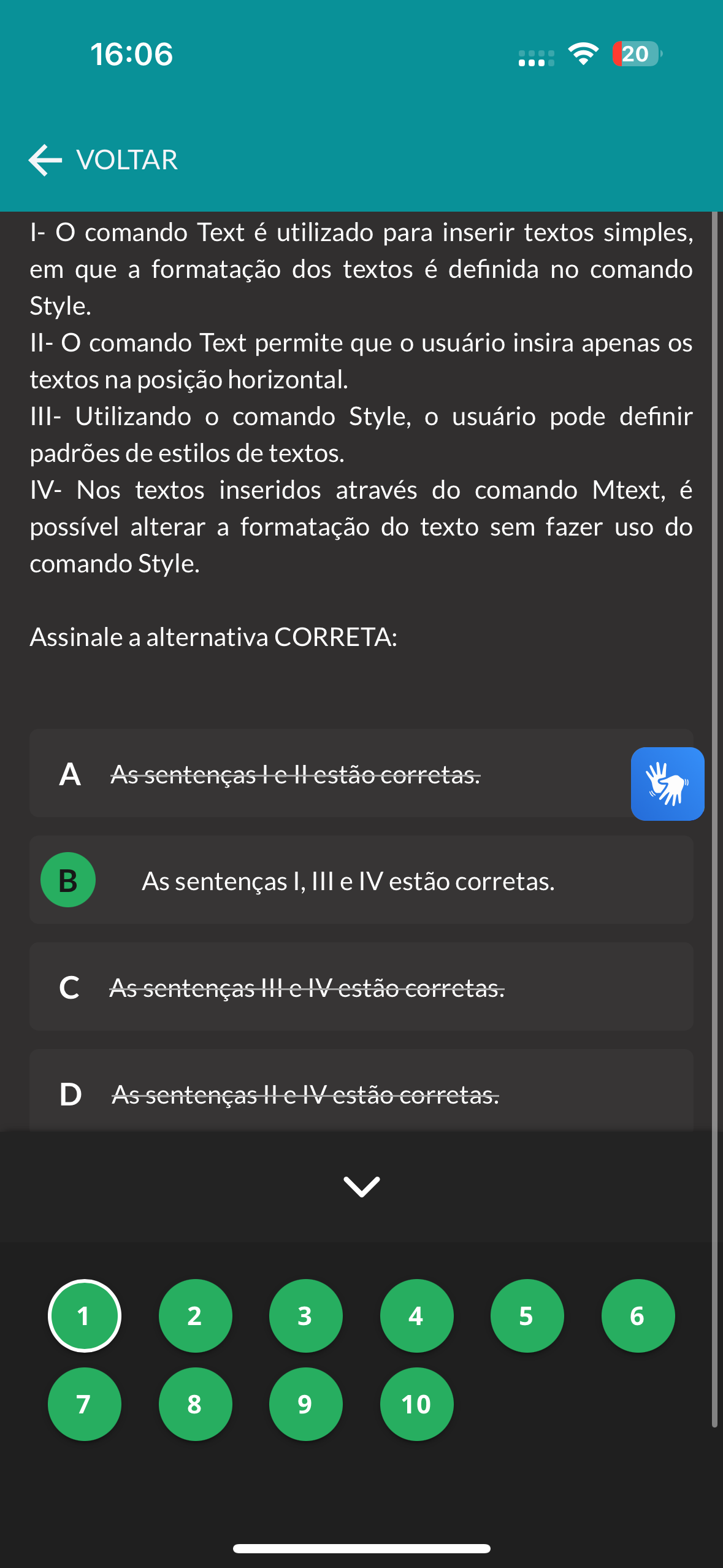 16:06 20 VOLTAR I- comando Text é utilizado para inserir textos simples, em que a formatação dos textos é definida no comando Style. II- comando Text permite que usuário insira apenas os textos na posição horizontal. III- Utilizando comando Style, usuário pode definir padrões de estilos de textos. IV- Nos textos inseridos através do comando Mtext, é possível alterar a formatação do texto sem fazer uso do comando Style. Assinale a alternativa CORRETA: A As sentenças le H estão corretas. B As sentenças I, III e IV estão corretas. c As sentenças e IVestão corretas. D As sentenças IVestão corretas. 1 2 3 4 5 6 7 8 9 10