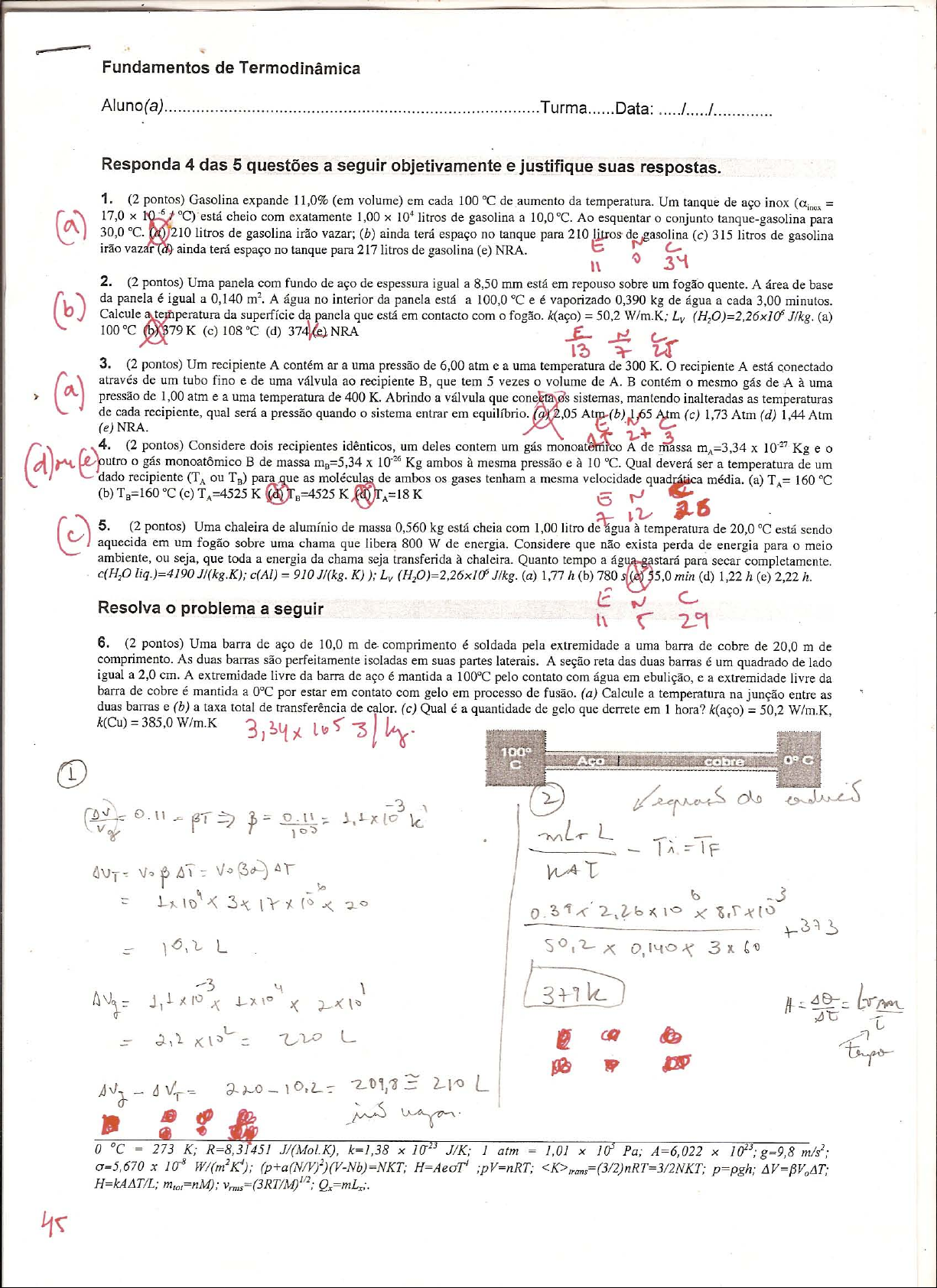 Fundamentos de Termodinâmica Aluno(a) Turma Data: / / Responda 4 das 5 questões a seguir objetivamente e justifique suas respostas. 1. (2 pontos) Gasolina expande 11,0% (em volume) em cada 100 °C de aumento da temperatura. Um tanque de aço inox = 17,0 °C) está cheio com exatamente 1,00 10⁴ litros de gasolina a 10,0 °C. Ao esquentar o conjunto tanque-gasolina para 30,0 (a) 210 litros de gasolina irão vazar; (b) ainda terá espaço no tanque para 210 litros de gasolina (c) 315 litros de gasolina irão vazar (d) ainda terá espaço no tanque para 217 litros de gasolina (e) NRA. 0 11 34 2. (2 pontos) Uma panela com fundo de aço de espessura igual a 8,50 mm está em repouso sobre um fogão quente. A área de base (b) da panela é igual a 0,140 m². A água no interior da panela está a 100,0 °C e é vaporizado 0,390 kg de água a cada 3,00 minutos. Calcule a temperatura da superfície da panela que está em contacto com fogão. k(aço) = 50,2 W/m.K; J/kg. (a) 100 °C (c) (d) 374(e) NRA 13 + 3. (2 pontos) Um recipiente A contém ar a uma pressão de 6,00 atm e a uma temperatura de 300 K. recipiente A está conectado (a) através de um tubo fino e de uma válvula ao recipiente B, que tem 5 vezes o volume de A. B contém o mesmo gás de A à uma pressão de 1,00 atm e a uma temperatura de 400 K. Abrindo a válvula que conecta sistemas, mantendo inalteradas as temperaturas de cada recipiente, qual será a pressão quando o sistema entrar em equilíbrio. (a) 2,05 Atm (b) Atm (c) 1,73 Atm (d) 1,44 Atm (e) NRA. 4. (2 pontos) Considere dois recipientes idênticos, um deles contem um gás monoatômico A de massa 10⁻²⁷ Kg e outro o gás monoatômico B de massa 10⁻²⁶ Kg ambos à mesma pressão e à °C. Qual deverá ser a temperatura de um dado recipiente ou TB) para que as moléculas de ambos os gases tenham a mesma velocidade quadrática média. (a) 160 (b) (c) N 5. (2 pontos) Uma chaleira de alumínio de massa 0,560 kg está cheia com 1,00 litro de 7 água à temperatura de está sendo 12 aquecida em um fogão sobre uma chama que libera 800 W de energia. Considere que não exista perda de energia para o meio ambiente, ou seja, que toda a energia da chama seja transferida à chaleira. Quanto tempo a água gastará para secar completamente. liq.)=4190 J/(kg.K); c(Al) 910 J/(kg. K) ); J/kg. (a) h (b) 780 (c) 55,0 min (d) 1,22 h (e) 2,22 h. E C Resolva o problema a seguir 11 5 29 6. (2 pontos) Uma barra de aço de 10,0 m de comprimento é soldada pela extremidade a uma barra de cobre de 20,0 m de comprimento. As duas barras são perfeitamente isoladas em suas partes laterais. A seção reta das duas barras é um quadrado de lado igual a 2,0 cm. A extremidade livre da barra de aço é mantida a 100°C pelo contato com água em ebulição, e a extremidade livre da barra de cobre é mantida a 0°C por estar em contato com gelo em processo de fusão. (a) Calcule a temperatura na junção entre as duas barras e (b) a taxa total de transferência de calor. (c) Qual é a quantidade de gelo que derrete em 1 hora? k(aço) = 50,2 W/m.K, k(Cu) 385,0 W/m.K 100° Aço cobre 1 2 do 0.11 100 -3 WAT = -3 +373 = 10,2 50,2 x -3 = 220 L 210 L 0 °C 273 K; R=8,31451 = J/(Mol.K), k=1,38 J/K; 1 atm = 1,01 10⁵ Pa; A=6,022 g=9,8 m/s²; σ=5,670 ;pV=nRT; p=pgh; H=kAAT/L; 453 de = A + B + = P + T2B 6VA 300 + 400 = VA 300 + 400 300 6 400 = P ( 300 1 + 24+ + 15 = P 4+ IT 1200 39 P 2,05 19 4 MA= = 3,34 kg MB= 10°C (VA> = (VA) = = 3 2 A = = IA x A A TB 1 = 3 2 hTB = 2 TA= 10°C TA = 283h TB= 5.34x10 -26 = 4525 k 10°C TB= = 283h TA = TBMA 3.34x10 -2t 283- =5 Mal= A= = = 1 20°C = + = so= so the = mal Cal Lv = 910 (373-293) + 1x (373-293) + 2,64 106 J 800J X= 32955 55 2,64 6 50.2 = 385 100°C 0°C new 10m 20m and A= = ADT Tj= 294 h Law Law Law Ley = Tj Leu ) Tj= has + x2t3 50,2 373 + 385 10 20 k = + how ) 385 + 50,2 294k 20 10A= A= 50,2 (373-294) 10 0.159 m Lr= = = m x 1h = 3,34 105