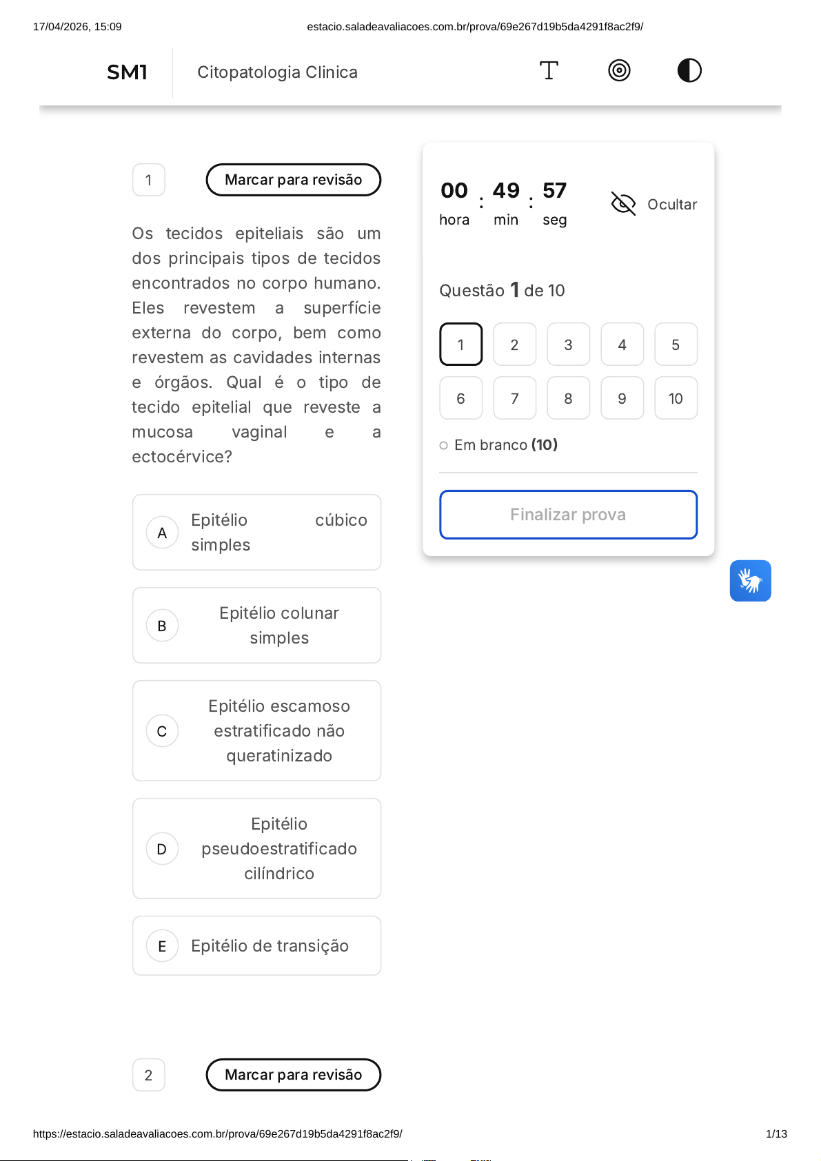 A B C D E 1 Marcar para revisão Os tecidos epiteliais são um dos principais tipos de tecidos encontrados no corpo humano. Eles revestem a superfície externa do corpo, bem como revestem as cavidades internas e órgãos. Qual é o tipo de tecido epitelial que reveste a mucosa vaginal e a ectocérvice? Epitélio cúbico simples Epitélio colunar simples Epitélio escamoso estratificado não queratinizado Epitélio pseudoestratificado cilíndrico Epitélio de transição 2 Marcar para revisão 00 hora : 49 min : 57 seg Ocultar Questão 1 de 10 Em branco (10) Finalizar prova 1 2 3 4 5 6 7 8 9 10 SM1 Citopatologia Clinica 17/04/2026, 15:09 estacio.saladeavaliacoes.com.br/prova/69e267d19b5da4291f8ac2f9/ https://estacio.saladeavaliacoes.com.br/prova/69e267d19b5da4291f8ac2f9/ 1/13 A B C D E Os exames citopatológicos são realizados em células retiradas de uma determinada região do corpo. Esses exames são amplamente utilizados para o diagnóstico e monitoramento de diversas condições, incluindo doenças cancerígenas. Como são obtidas as amostras para os exames citopatológicos? Descamação espontânea ou descamação artificial Ingestão de medicamentos específicos Extração de sangue Realização de biópsia Administração de contrastes radiológicos 3 Marcar para revisão Os exames citopatológicos são realizados a partir de amostras que descamam de uma determinada região do corpo ou lesão. Elas podem ser obtidas de modo natural ou 17/04/2026, 15:09 estacio.saladeavaliacoes.com.br/prova/69e267d19b5da4291f8ac2f9/ https://estacio.saladeavaliacoes.com.br/prova/69e267d19b5da4291f8ac2f9/ 2/13 A B C D E artificial, por punção ou aspirados. Sobre os tipos de descamação celular, observe as alternativas a seguir: I. O escarro é um exemplo de amostra coletada pela descamação natural. II. Na descamação celular natural ou espontânea, as células são mais imaturas em relação à coleta realizada pela descamação artificial. III. Na descamação celular natural ou espontânea, as células são mais maduras em relação à coleta realizada pela descamação artificial. São corretas as afirmações: I II III I e II I e III. 4 Marcar para revisão O exame citopatológico permite a verificação microscópica das 17/04/2026, 15:09 estacio.saladeavaliacoes.com.br/prova/69e267d19b5da4291f8ac2f9/ https://estacio.saladeavaliacoes.com.br/prova/69e267d19b5da4291f8ac2f9/ 3/13 A B C células e suas alterações morfológicas, possibilitando o diagnóstico, a identificação de doenças silenciosas e o rastreamento e prevenção de doenças malignas, como o câncer cervicovaginal. No entanto, esse exame apresenta algumas desvantagens. Marque a opção que apresenta uma desvantagem desse exame. São necessários técnicos especializados e equipamentos altamente sofisticados para a realização dos exames. É um exame altamente invasivo, o que diminui a adesão do paciente. Impossibilidade de averiguação da extensão ou da invasão no caso de uma lesão maligna. 17/04/2026, 15:09 estacio.saladeavaliacoes.com.br/prova/69e267d19b5da4291f8ac2f9/ https://estacio.saladeavaliacoes.com.br/prova/69e267d19b5da4291f8ac2f9/ 4/13 D E A B C Alto custo para sua realização. A coleta deve ser realizada sempre em ambiente hospitalar. 5 Marcar para revisão Durante a análise dos esfregaços, algumas características citoplasmáticas remetem às funções celulares. Células com um núcleo oval ou redondo, volumoso, excêntrico, com a cromatina finamente granular e com discreta variação no tamanho localizado próximo à lâmina basal e com citoplasma volumoso, ligeiramente claro e basófilo, com alguns vacúolos e com uma área (linha) corada mais intensamente, são: Células da endocérvice ciliar Células escamosas intermediárias Células escamosas superficiais 17/04/2026, 15:09 estacio.saladeavaliacoes.com.br/prova/69e267d19b5da4291f8ac2f9/ https://estacio.saladeavaliacoes.com.br/prova/69e267d19b5da4291f8ac2f9/ 5/13 D E Células metaplásicas ciliar Células endometriais glandulares 6 Marcar para revisão Diversos fatores afetam a fixação, dentre eles a temperatura, espessura do tecido, grau de penetração do fixador, relação volume do fixador e tamanho do espécime, estocagem apropriada, pH do fixador, osmolaridade da solução fixadora, adição de sais na mistura, concentração dos fixadores e o tipo de tecido que está sendo retirado. Sobre as interferências causadas por esses fatores, assinale a alternativa incorreta. 17/04/2026, 15:09 estacio.saladeavaliacoes.com.br/prova/69e267d19b5da4291f8ac2f9/ https://estacio.saladeavaliacoes.com.br/prova/69e267d19b5da4291f8ac2f9/ 6/13 A B C Quando forem retiradas várias amostras para biopsia, a fixação de órgãos metabolicamente ativos deve ser realizada antes do que de outros, pois é o primeiro a sofrer autólise. Fragmentos muito espessos devem ser clivados até uma espessura entre 3 a 5mm para garantir a fixação adequada. O tempo de fixação pode variar de 6 a 24 horas. Após a fixação, caso seja necessário armazenar por mais tempo o tecido, eles devem ser transferidos para o álcool 70%. 17/04/2026, 15:09 estacio.saladeavaliacoes.com.br/prova/69e267d19b5da4291f8ac2f9/ https://estacio.saladeavaliacoes.com.br/prova/69e267d19b5da4291f8ac2f9/ 7/13 D E O volume de fixador utilizado deve ser entre 10 e 20 vezes o volume do material coletado e esse material deve ser acondicionado em um recipiente de boca larga. Em tecidos em que é necessária uma penetração mais lenta, a fixação deve ser realizada com soluções fixadoras em uma temperatura ambiente. 7 Marcar para revisão A análise histológica é uma etapa fundamental em diversas áreas da medicina e ciências biológicas, permitindo o estudo detalhado dos tecidos e células por meio do microscópio. Para que essa análise seja precisa e confiável, é crucial que as amostras de tecido estejam bem preservadas e em condições adequadas. Nesse contexto, por que a escolha do fixador é