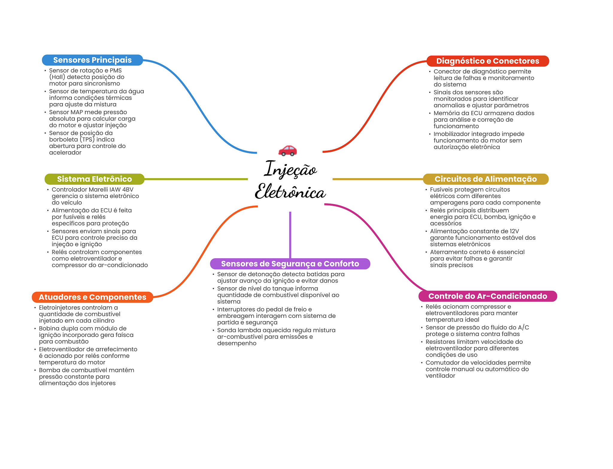 Sensores Principais Diagnóstico e Conectores Sensor de rotação e PMS Conector de diagnóstico permite (Hall) detecta posição do leitura de falhas e monitoramento motor para sincronismo do sistema Sensor de temperatura da água Sinais dos sensores são informa condições térmicas monitorados para identificar para ajuste da mistura anomalias e ajustar parâmetros Sensor MAP mede pressão Memória da ECU armazena dados absoluta para calcular carga para análise e correção de do motor e ajustar injeção funcionamento Sensor de posição da Imobilizador integrado impede borboleta (TPS) indica funcionamento do motor sem abertura para controle do autorização eletrônica acelerador Injeção Sistema Eletrônico Circuitos de Alimentação Controlador Marelli IAW 4BV Eletrônica Fusíveis protegem circuitos gerencia sistema eletrônico elétricos com diferentes do veículo amperagens para cada componente Alimentação da ECU é feita Relés principais distribuem por fusíveis e relés energia para ECU, bomba, ignição e específicos para proteção acessórios Sensores enviam sinais para Alimentação constante de 12V ECU para controle preciso da garante funcionamento estável dos injeção e ignição sistemas eletrônicos Relés controlam componentes Aterramento correto é essencial como eletroventilador e para evitar falhas e garantir compressor do ar-condicionado Sensores de Segurança e Conforto sinais precisos Sensor de detonação detecta batidas para ajustar avanço da ignição e evitar danos Sensor de nível do tanque informa Atuadores e Componentes quantidade de combustível disponível ao Controle do Ar-Condicionado sistema Eletroinjetores controlam a Interruptores do pedal de freio e Relés acionam compressor e quantidade de combustível embreagem interagem com sistema de eletroventiladores para manter injetado em cada cilindro partida e segurança temperatura ideal Bobina dupla com módulo de Sonda lambda aquecida regula mistura Sensor de pressão do fluido do A/C ignição incorporado gera faísca ar-combustível para emissões e protege sistema contra falhas para combustão desempenho Resistores limitam velocidade do Eletroventilador de arrefecimento eletroventilador para diferentes é acionado por relés conforme condições de uso temperatura do motor Comutador de velocidades permite Bomba de combustível mantém controle manual ou automático do pressão constante para ventilador alimentação dos injetores