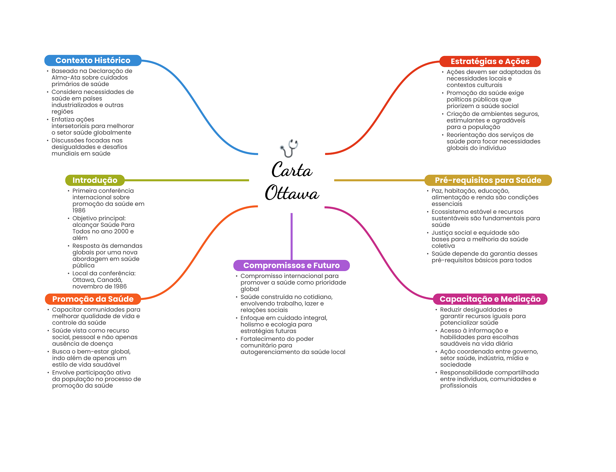 Contexto Histórico Estratégias e Ações Baseada na Declaração de Ações devem ser adaptadas às Alma-Ata sobre cuidados necessidades locais e primários de saúde contextos culturais Considera necessidades de Promoção da saúde exige saúde em países políticas públicas que industrializados e outras priorizem a saúde social regiões Criação de ambientes seguros, Enfatiza ações estimulantes e agradáveis intersetoriais para melhorar para a população setor saúde globalmente Reorientação dos serviços de Discussões focadas nas saúde para focar necessidades desigualdades e desafios globais do indivíduo mundiais em saúde Carta Introdução Pré-requisitos para Saúde Primeira conferência internacional sobre Ottawa Paz, habitação, educação, alimentação e renda são condições promoção da saúde em essenciais 1986 Ecossistema estável e recursos Objetivo principal: sustentáveis são fundamentais para alcançar Saúde Para saúde Todos no ano 2000 e Justiça social e equidade são além bases para a melhoria da saúde Resposta às demandas coletiva globais por uma nova Saúde depende da garantia desses abordagem em saúde pré-requisitos básicos para todos pública Compromissos e Futuro Local da conferência: Compromisso internacional para Ottawa, Canadá, promover a saúde como prioridade novembro de 1986 global Promoção da Saúde Saúde construída no cotidiano, envolvendo trabalho, lazer e Capacitação e Mediação Capacitar comunidades para relações sociais Reduzir desigualdades e melhorar qualidade de vida e Enfoque em cuidado integral, garantir recursos iguais para controle da saúde holismo e ecologia para potencializar saúde Saúde vista como recurso estratégias futuras Acesso à informação e social, pessoal e não apenas Fortalecimento do poder habilidades para escolhas ausência de doença comunitário para saudáveis na vida diária Busca bem-estar global, autogerenciamento da saúde local Ação coordenada entre governo, indo além de apenas um setor saúde, indústria, mídia e estilo de vida saudável sociedade Envolve participação ativa Responsabilidade compartilhada da população no processo de entre indivíduos, comunidades e promoção da saúde profissionais