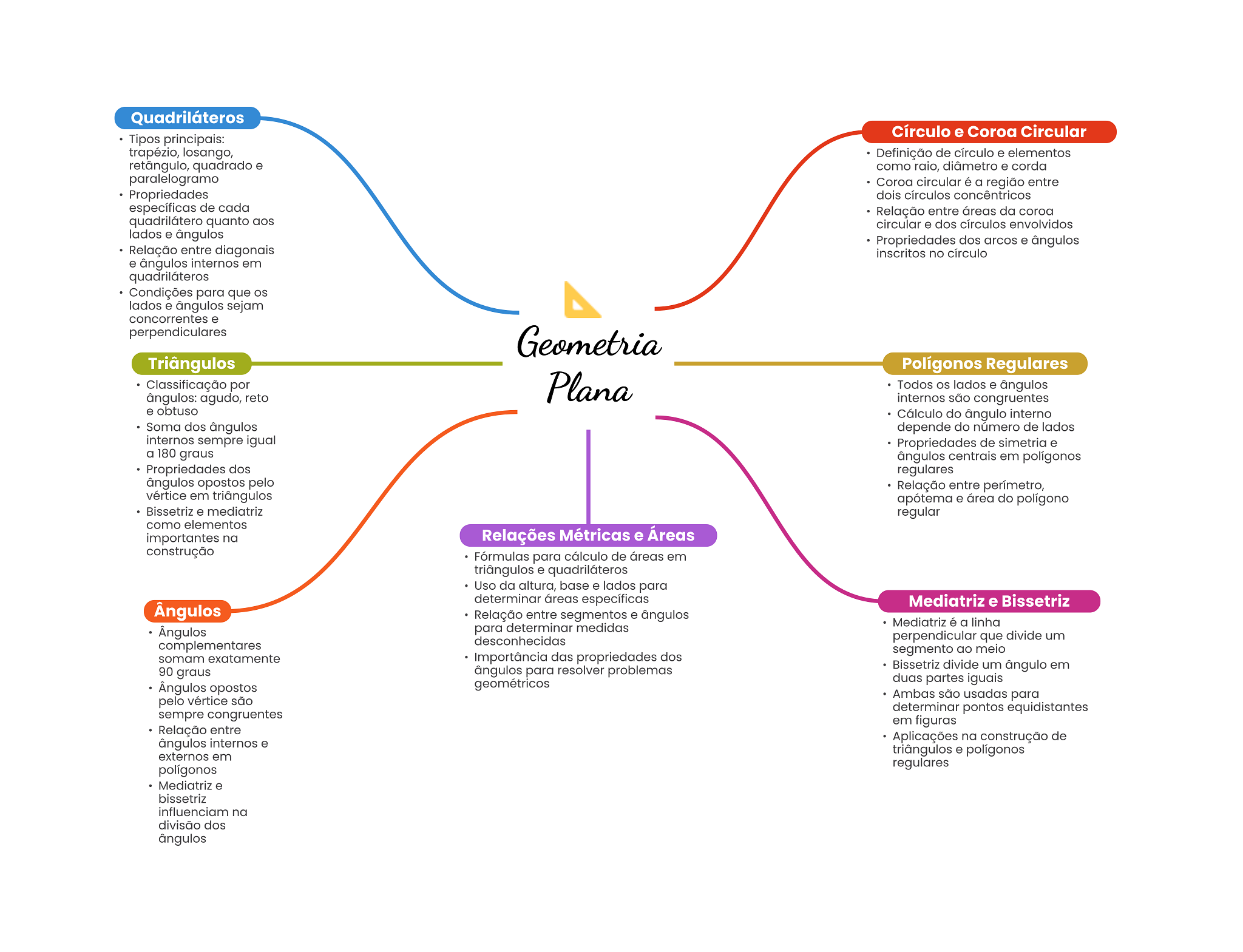 Quadriláteros Círculo e Coroa Circular Tipos principais: trapézio, losango, Definição de círculo e elementos retângulo, quadrado e como raio, diâmetro e corda paralelogramo Coroa circular é a região entre Propriedades dois círculos concêntricos específicas de cada Relação entre áreas da coroa quadrilátero quanto aos circular e dos círculos envolvidos lados e ângulos Propriedades dos arcos e ângulos Relação entre diagonais inscritos no círculo e ângulos internos em quadriláteros Condições para que OS lados e ângulos sejam concorrentes e perpendiculares Geometria Triângulos Polígonos Regulares Classificação por ângulos: agudo, reto Plana Todos lados e ângulos internos são congruentes e obtuso Cálculo do ângulo interno Soma dos ângulos depende do número de lados internos sempre igual Propriedades de simetria e a 180 graus ângulos centrais em polígonos Propriedades dos regulares ângulos opostos pelo Relação entre perímetro, vértice em triângulos apótema e área do polígono Bissetriz e mediatriz regular como elementos importantes na Relações Métricas e Áreas construção Fórmulas para cálculo de áreas em triângulos e quadriláteros Uso da altura, base e lados para determinar áreas específicas Mediatriz e Bissetriz Ângulos Relação entre segmentos e ângulos Mediatriz é a linha Ângulos para determinar medidas complementares desconhecidas perpendicular que divide um segmento ao meio somam exatamente Importância das propriedades dos ângulos para resolver problemas Bissetriz divide um ângulo em 90 graus geométricos duas partes iguais opostos Ambas são usadas para pelo vértice são determinar pontos equidistantes sempre congruentes em figuras Relação entre Aplicações na construção de ângulos internos e externos em triângulos e polígonos regulares polígonos Mediatriz e bissetriz influenciam na divisão dos ângulos
