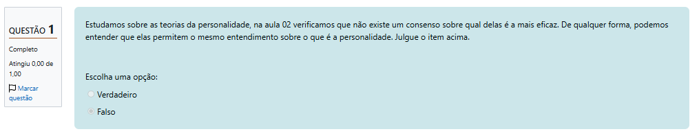 QUESTÃO 1 Estudamos sobre as teorias da personalidade, na aula 02 verificamos que não existe um consenso sobre qual delas é a mais eficaz. De qualquer forma, podemos entender que elas permitem mesmo entendimento sobre que é a personalidade. Julgue item acima. Completo Atingiu de Escolha uma opção: Marcar questão Verdadeiro Falso