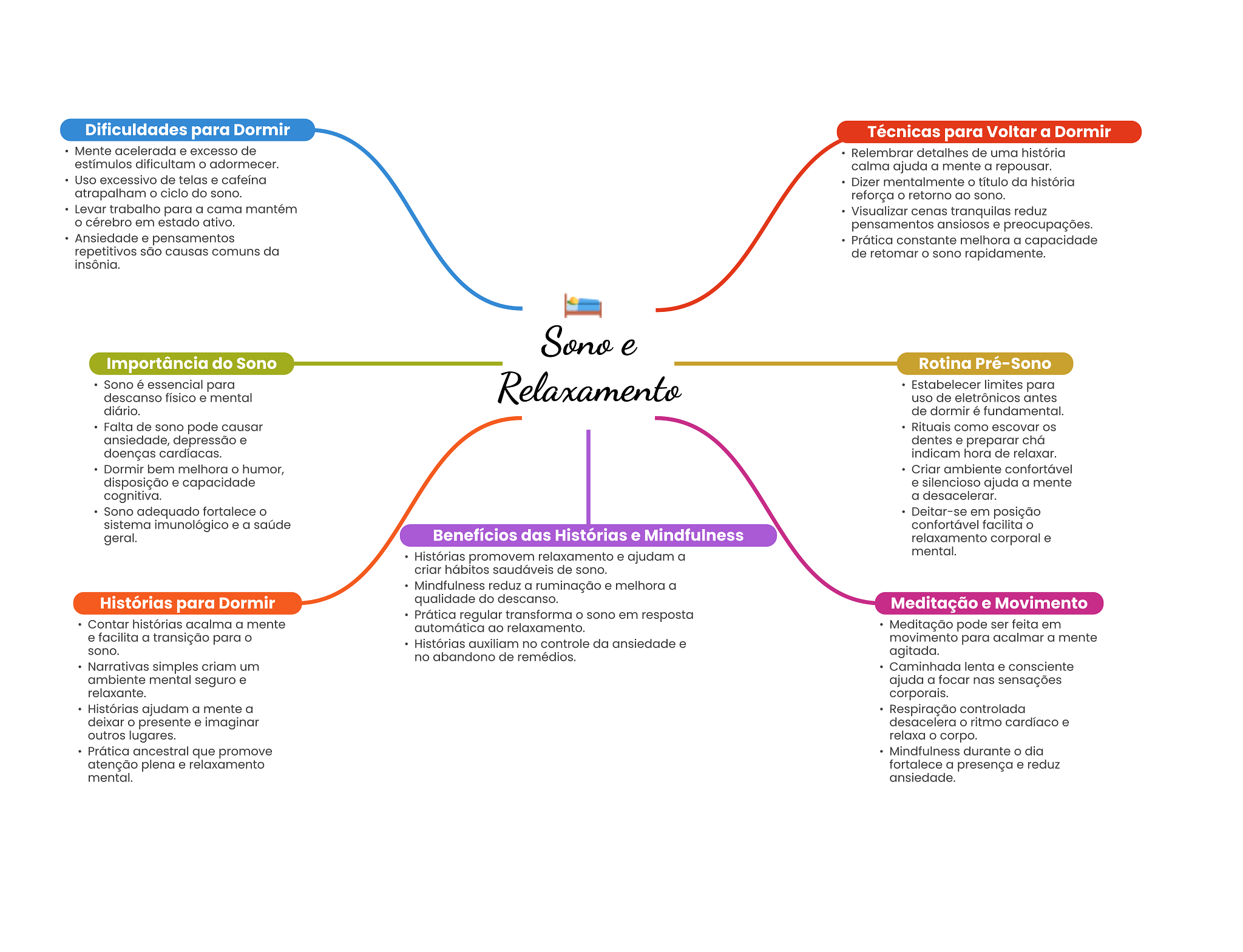 Dificuldades para Dormir Técnicas para Voltar a Dormir Mente acelerada e excesso de Relembrar detalhes de uma história estímulos dificultam adormecer. calma ajuda a mente a repousar. Uso excessivo de telas e cafeína Dizer mentalmente título da história atrapalham ciclo do sono. reforça retorno ao sono. Levar trabalho para a cama mantém Visualizar cenas tranquilas reduz cérebro em estado ativo. pensamentos ansiosos e preocupações. Ansiedade e pensamentos Prática constante melhora a capacidade repetitivos são causas comuns da de retomar O sono rapidamente. insônia. Sonoe Importância do Sono Rotina Pré-Sono Sono é essencial para Relaxamento Estabelecer limites para descanso físico e mental uso de eletrônicos antes diário. de dormir é fundamental. Falta de sono pode causar Rituais como escovar ansiedade, depressão e dentes e preparar chá doenças cardíacas. indicam hora de relaxar. Dormir bem melhora humor, Criar ambiente confortável disposição e capacidade e silencioso ajuda a mente cognitiva. a desacelerar. Sono adequado fortalece O Deitar-se em posição sistema imunológico e a saúde confortável facilita O geral. Benefícios das Histórias e Mindfulness relaxamento corporal e Histórias promovem relaxamento e ajudam a mental. criar hábitos saudáveis de sono. Mindfulness reduz a ruminação e melhora a Histórias para Dormir qualidade do descanso. Meditação e Movimento Prática regular transforma sono em resposta Contar histórias acalma a mente automática ao relaxamento. Meditação pode ser feita em e facilita a transição para Histórias auxiliam no controle da ansiedade e movimento para acalmar a mente sono. no abandono de remédios. agitada. Narrativas simples criam um Caminhada lenta e consciente ambiente mental seguro e ajuda a focar nas sensações relaxante. corporais. Histórias ajudam a mente a Respiração controlada deixar presente e imaginar desacelera ritmo cardíaco e outros lugares. relaxa corpo. Prática ancestral que promove Mindfulness durante dia atenção plena e relaxamento fortalece a presença e reduz mental. ansiedade.