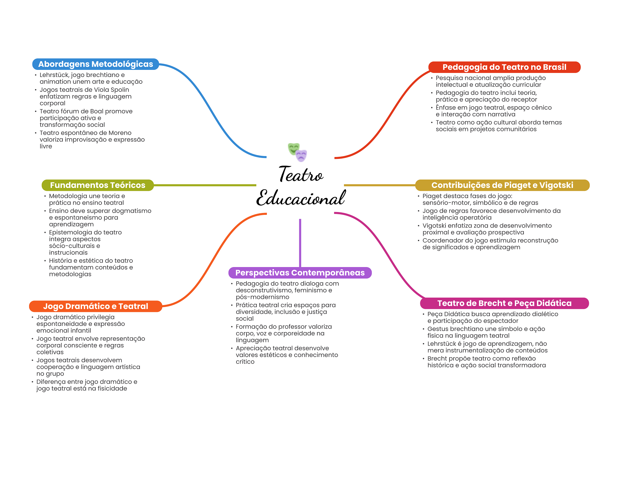 Abordagens Metodológicas Pedagogia do Teatro no Brasil Lehrstück, jogo brechtiano e Pesquisa nacional amplia produção animation unem arte e educação intelectual e atualização curricular Jogos teatrais de Viola Spolin Pedagogia do teatro inclui teoria, enfatizam regras e linguagem prática e apreciação do receptor corporal Teatro fórum de Boal promove Ênfase em jogo teatral, espaço cênico e interação com narrativa participação ativa e transformação social Teatro como ação cultural aborda temas sociais em projetos comunitários Teatro espontâneo de Moreno valoriza improvisação e expressão livre Teatro Fundamentos Teóricos Contribuições de Piaget e Vigotski Metodologia une teoria e prática no ensino teatral Educacional Piaget destaca fases do jogo: sensório-motor, simbólico e de regras Ensino deve superar dogmatismo Jogo de regras favorece desenvolvimento da e para inteligência operatória aprendizagem Vigotski enfatiza zona de desenvolvimento Epistemologia do teatro proximal e avaliação prospectiva integra aspectos Coordenador do jogo estimula reconstrução sócio-culturais e de significados e aprendizagem instrucionais História e estética do teatro fundamentam conteúdos e metodologias Perspectivas Contemporâneas Pedagogia do teatro dialoga com desconstrutivismo, feminismo e pós-modernismo Jogo Dramático e Teatral Prática teatral cria espaços para Teatro de Brecht e Peça Didática diversidade, inclusão e justiça Jogo dramático privilegia Peça Didática busca aprendizado dialético social espontaneidade e expressão e participação do espectador Formação do professor valoriza emocional infantil Gestus brechtiano une símbolo e ação corpo, e corporeidade na Jogo teatral envolve representação física na linguagem teatral linguagem corporal consciente e regras Lehrstück é jogo de aprendizagem, não coletivas Apreciação teatral desenvolve mera instrumentalização de conteúdos valores estéticos e conhecimento Jogos teatrais desenvolvem crítico Brecht propõe teatro como reflexão cooperação e linguagem artística histórica e social transformadora no grupo Diferença entre jogo dramático e jogo teatral está na fisicidade