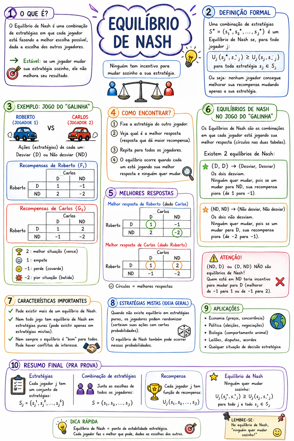 0 QUE É? 2 DEFINIÇÃO FORMAL Equilíbrio de Nash é uma combinação EQUILÍBRIO Uma combinação de estratégias de estratégias em que cada jogador S* = é um está fazendo a melhor escolha possível, DE NASH Equilíbrio de Nash se, para todo dada a escolha dos outros jogadores. jogador j: Estável: se um jogador mudar sua estratégia sozinho, ele não Ninguém tem incentivo para para toda estratégia melhora seu resultado. mudar sozinho a sua estratégia. Ou seja: nenhum jogador consegue melhorar sua recompensa mudando apenas a sua estratégia. 3 EXEMPLO: JOGO DO "GALINHA" 6 EQUILÍBRIOS DE NASH 4 COMO ENCONTRAR? ROBERTO CARLOS NO JOGO DO "GALINHA" (JOGADOR 1) (JOGADOR 2) 1 Fixe a estratégia do outro jogador. Os Equilíbrios de Nash são as combinações 2 Veja qual é a melhor resposta em que cada jogador está jogando sua (resposta que dá maior recompensa). melhor resposta (círculos nas duas tabelas). Ações (estratégias) de cada um: 3 Repita para todos jogadores. Desviar (D) ou Não desviar (ND) Existem 2 equilíbrios de Nash: 4 equilíbrio ocorre quando cada Recompensas de Roberto um está jogando sua melhor (D, D) (Desviar, Desviar) Carlos resposta e ninguém quer mudar. Os dois desviam. D ND Ninguém quer mudar, pois se um Roberto D 1 -1 mudar para ND, sua recompensa ND 2 -2 5 MELHORES RESPOSTAS piora (de 1 para -1). Melhor resposta de Roberto (dado Carlos) Recompensas de Carlos (G2) Carlos (ND, ND) (Não desviar, Não desviar) Carlos D ND Os dois não desviam. D ND Roberto D 1 -1 Ninguém quer mudar, pois se um Roberto D 1 2 ND 2 -2 mudar para D, sua recompensa ND -1 -2 piora (de -2 para -1). Melhor resposta de Carlos (dado Roberto) 2 melhor situação (vence) Carlos D ND 1 empate ATENÇÃO! Roberto D 1 2 -1: perde (covarde) (ND, D) ou (D, ND) NÃO são ): ND -1 -2 equilíbrios de Nash! -2 pior situação (batida) Quem está em ND teria incentivo Círculos = melhores respostas para mudar para D (melhorar de -1 para 1 ou de - -1 para 2). 7 CARACTERÍSTICAS IMPORTANTES 8 ESTRATÉGIAS MISTAS (IDEIA GERAL) Pode existir mais de um equilíbrio de Nash. 9 APLICAÇÕES Quando não existe equilíbrio em estratégias Nem todo jogo tem equilíbrio de Nash em puras, jogadores podem randomizar Economia (preços, concorrência) estratégias puras (pode existir apenas em (sorteiam suas ações com certas Política (eleições, negociações) estratégias mistas). probabilidades). Biologia (comportamento animal) Nem sempre equilíbrio é "bom" para todos. equilíbrio de Nash também pode ocorrer Leilões, disputas, acordos Pode haver conflitos de interesse. nessas probabilidades. Qualquer situação de decisão estratégica 10 RESUMO FINAL (PRA PROVA) Estratégias Combinação de estratégias Recompensa Equilíbrio de Nash Cada jogador j tem Junta as escolhas de Cada jogador j tem Ninguém quer mudar um conjunto de sozinho: todos jogadores: função de recompensa: estratégias: S = para todo j e todo DICA RÁPIDA LEMBRE-SE: No equilíbrio de Nash, Equilíbrio de Nash = ponto de estabilidade estratégica. "ninguém quer mudar Cada jogador faz 0 melhor que pode, dadas as escolhas dos outros. sozinho!"
