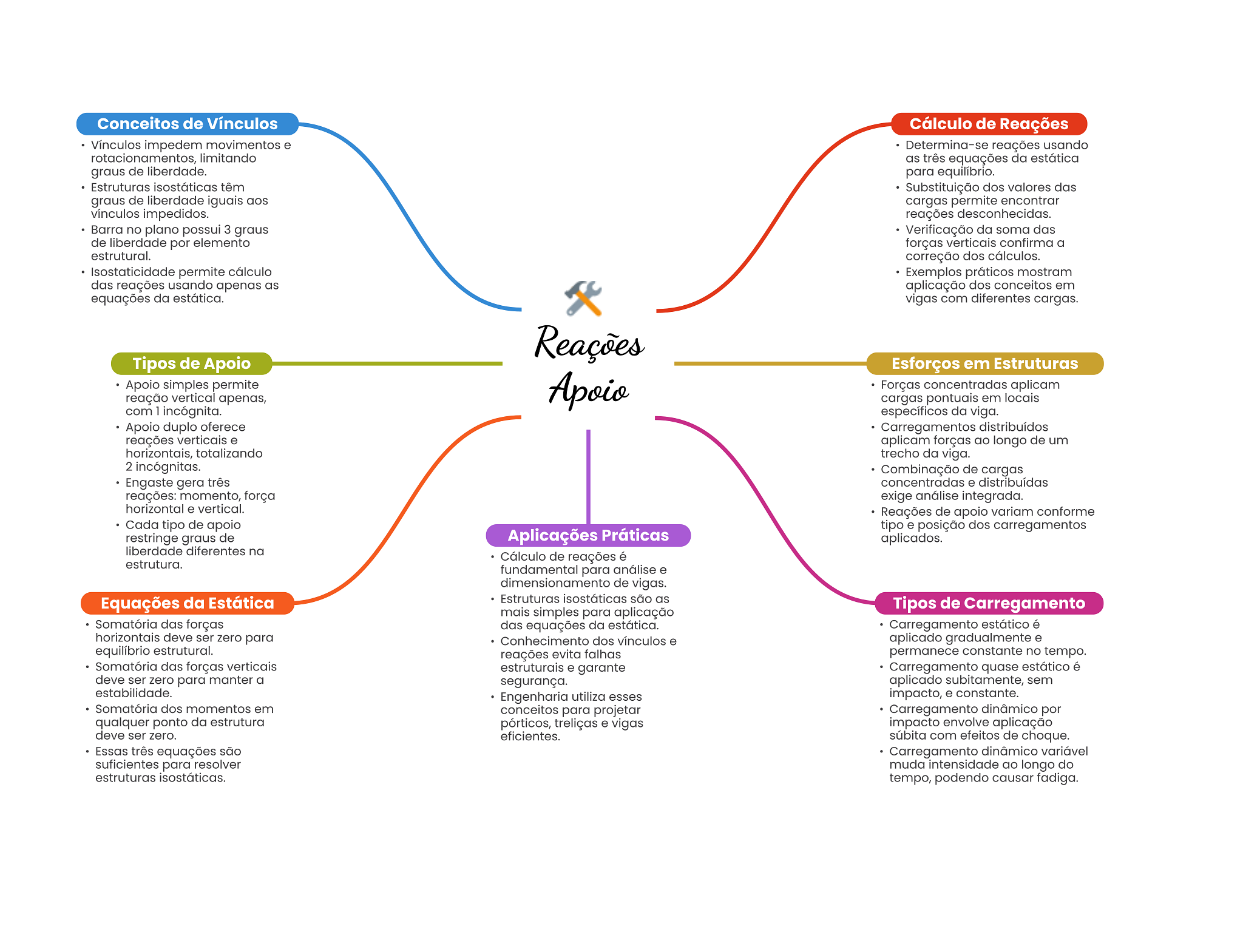 Conceitos de Vínculos Cálculo de Reações Vínculos impedem movimentos e Determina-se reações usando rotacionamentos, limitando as três equações da estática graus de liberdade. para equilíbrio. Estruturas isostáticas têm Substituição dos valores das graus de liberdade iguais aos cargas permite encontrar vínculos impedidos. reações desconhecidas. Barra no plano possui 3 graus Verificação da soma das de liberdade por elemento forças verticais confirma a estrutural. correção dos cálculos. Isostaticidade permite cálculo Exemplos práticos mostram das reações usando apenas as aplicação dos conceitos em equações da estática. vigas com diferentes cargas. Reações Tipos de Apoio Esforços em Estruturas Apoio simples permite Apoio Forças concentradas aplicam reação vertical apenas, cargas pontuais em locais com 1 incógnita. específicos da viga. Apoio duplo oferece Carregamentos distribuídos reações verticais e aplicam forças ao longo de um horizontais, totalizando trecho da viga. 2 incógnitas. Combinação de cargas Engaste gera três concentradas e distribuídas reações: momento, força exige análise integrada. horizontal e vertical. Reações de apoio variam conforme Cada tipo de apoio tipo e posição dos carregamentos restringe graus de Aplicações Práticas aplicados. liberdade diferentes na Cálculo de reações é estrutura. fundamental para análise e dimensionamento de vigas. Equações da Estática Estruturas isostáticas são as Tipos de Carregamento mais simples para aplicação Somatória das forças das equações da estática. Carregamento estático é horizontais deve ser zero para Conhecimento dos vínculos e aplicado gradualmente e equilíbrio estrutural. reações evita falhas permanece constante no tempo. Somatória das forças verticais estruturais e garante Carregamento quase estático é deve ser zero para manter a segurança. aplicado subitamente, sem estabilidade. Engenharia utiliza esses impacto, e constante. Somatória dos momentos em conceitos para projetar Carregamento dinâmico por qualquer ponto da estrutura pórticos, treliças e vigas impacto envolve aplicação deve ser zero. eficientes. súbita com efeitos de choque. Essas três equações são Carregamento dinâmico variável suficientes para resolver muda intensidade ao longo do estruturas isostáticas. tempo, podendo causar fadiga.