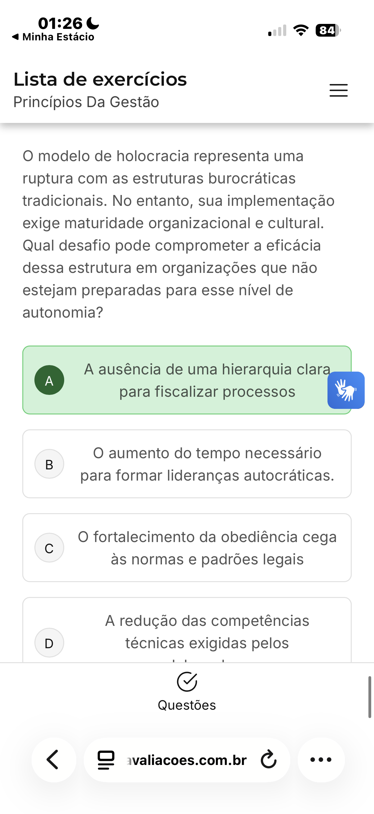 01:26 84 Minha Estácio Lista de exercícios Princípios Da Gestão modelo de holocracia representa uma ruptura com as estruturas burocráticas tradicionais. No entanto, sua implementação exige maturidade organizacional e cultural. Qual desafio pode comprometer a eficácia dessa estrutura em organizações que não estejam preparadas para esse nível de autonomia? A ausência de uma hierarquia clara A para fiscalizar processos aumento do tempo necessário para formar lideranças autocráticas. fortalecimento da obediência cega c às normas e padrões legais A redução das competências D técnicas exigidas pelos Questões