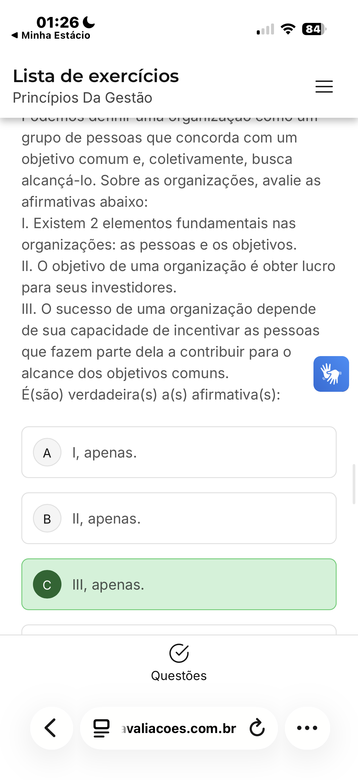 01:26 84 Minha Estácio Lista de exercícios Princípios Da Gestão grupo de pessoas que concorda com um objetivo comum e, coletivamente, busca alcançá-lo. Sobre as organizações, avalie as afirmativas abaixo: I. Existem 2 elementos fundamentais nas organizações: as pessoas e os objetivos. II. objetivo de uma organização é obter lucro para seus investidores. III. sucesso de uma organização depende de sua capacidade de incentivar as pessoas que fazem parte dela a contribuir para alcance dos objetivos comuns. É(são) verdadeira(s) a(s) afirmativa(s): A I, apenas. II, apenas. III, apenas. Questões