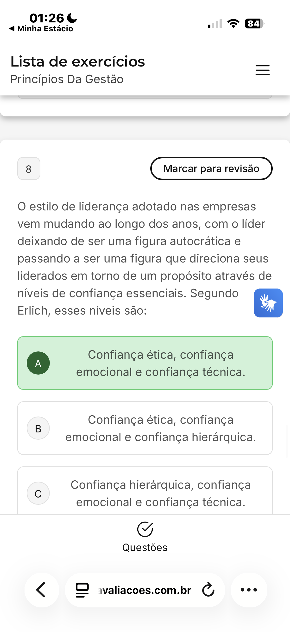 01:26 84 Minha Estácio Lista de exercícios Princípios Da Gestão 8 Marcar para revisão estilo de liderança adotado nas empresas vem mudando ao longo dos anos, com líder deixando de ser uma figura autocrática e passando a ser uma figura que direciona seus liderados em torno de um propósito através de níveis de confiança essenciais. Segundo Erlich, esses níveis são: Confiança ética, confiança A emocional e confiança técnica. Confiança ética, confiança emocional e confiança hierárquica. Confiança hierárquica, confiança c emocional e confiança técnica. Questões