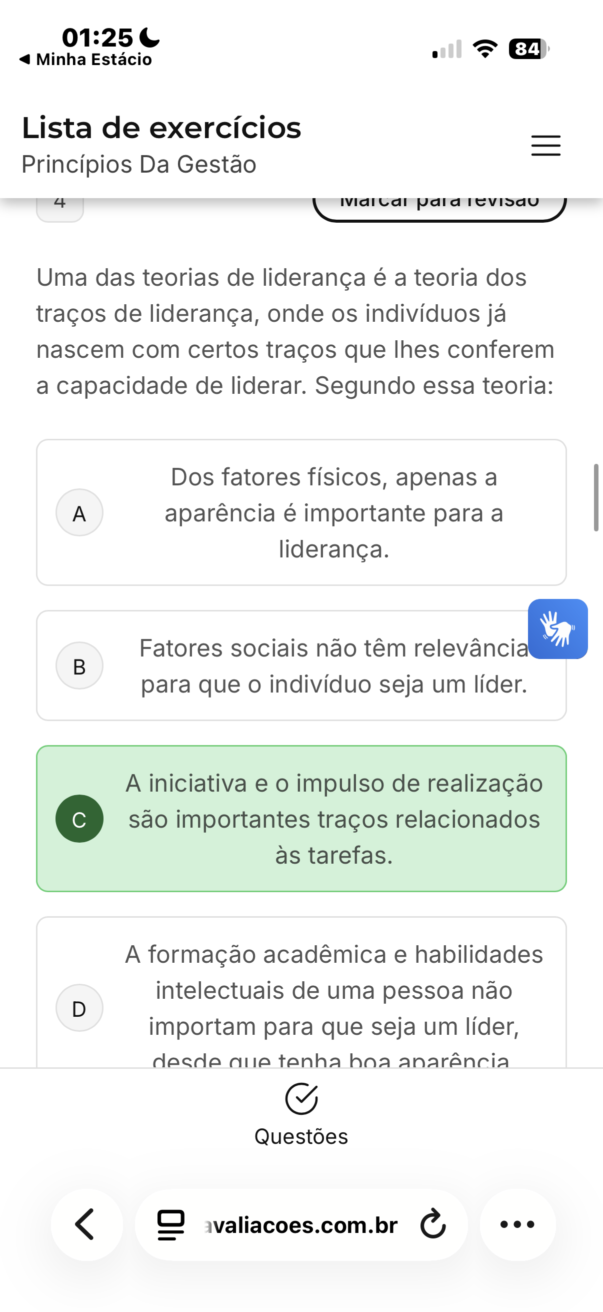 01:25 84 Minha Estácio Lista de exercícios Princípios Da Gestão 4 Uma das teorias de liderança é a teoria dos traços de liderança, onde os indivíduos já nascem com certos traços que lhes conferem a capacidade de liderar. Segundo essa teoria: Dos fatores físicos, apenas a A aparência é importante para a liderança. Fatores sociais não têm relevância para que indivíduo seja um líder. A iniciativa e impulso de realização são importantes traços relacionados às tarefas. A formação acadêmica e habilidades intelectuais de uma pessoa não D importam para que seja um líder, desde que tenha boa Questões