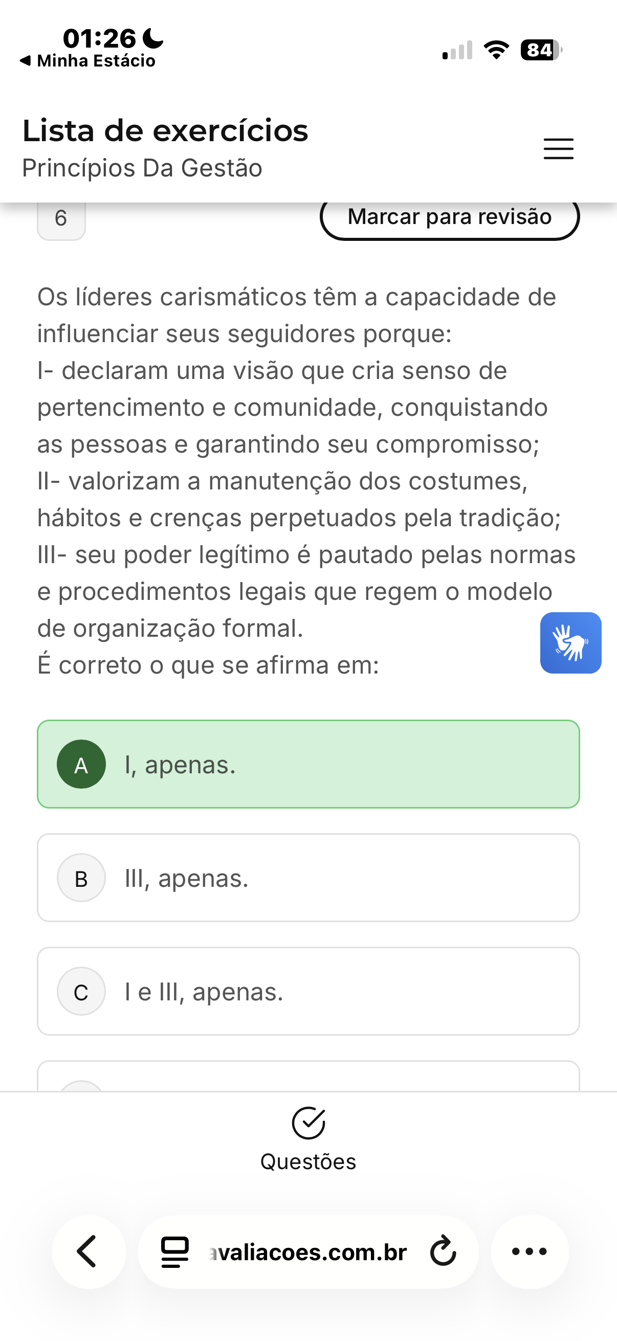 01:26 84 Minha Estácio Lista de exercícios Princípios Da Gestão 6 Marcar para revisão Os líderes carismáticos têm a capacidade de influenciar seus seguidores porque: I- declaram uma visão que cria senso de pertencimento e comunidade, conquistando as pessoas e garantindo seu compromisso; II- valorizam a manutenção dos costumes, hábitos e crenças perpetuados pela tradição; III- seu poder legítimo é pautado pelas normas e procedimentos legais que regem modelo de organização formal. É correto que se afirma em: A I, apenas. III, apenas. c I e III, apenas. Questões