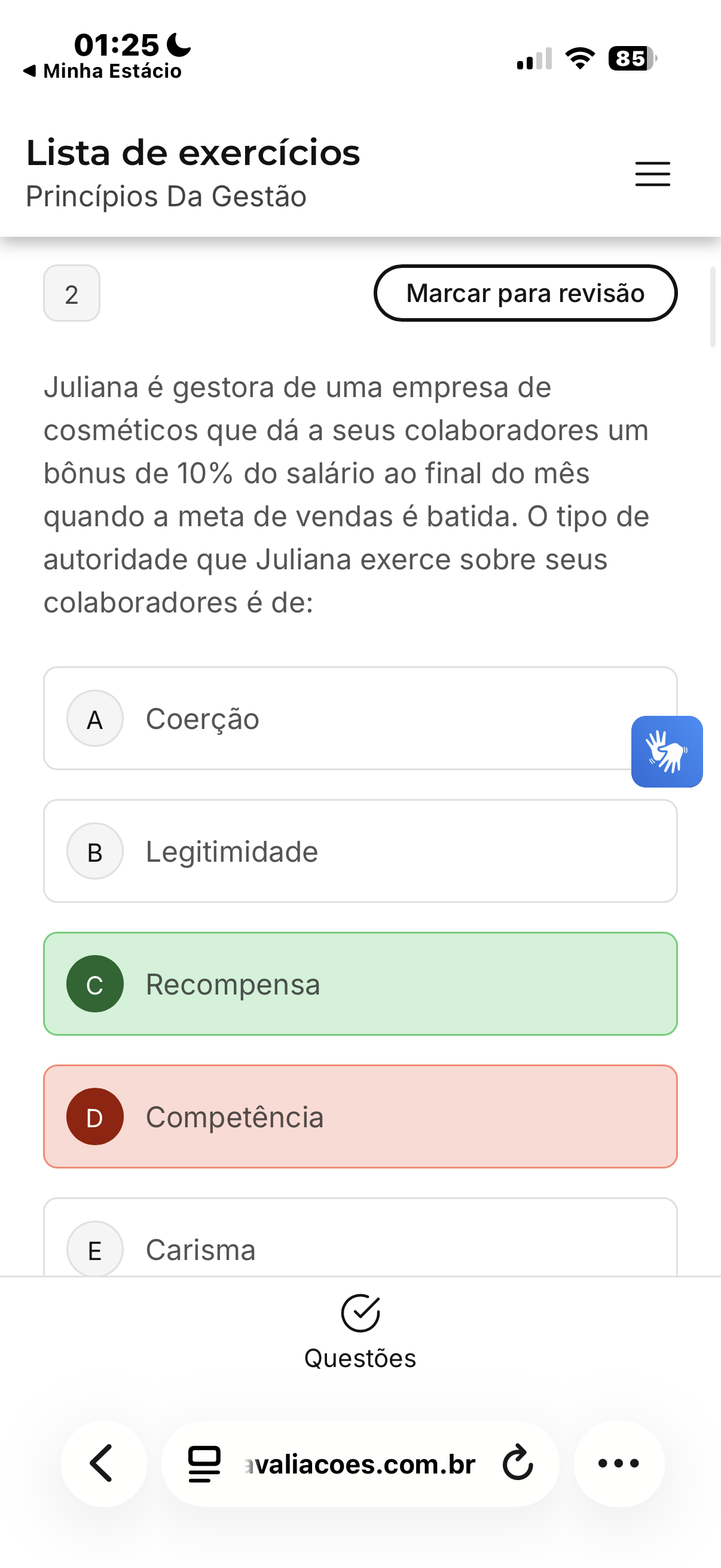 01:25 85 Minha Estácio Lista de exercícios Princípios Da Gestão 2 Marcar para revisão Juliana é gestora de uma empresa de cosméticos que dá a seus colaboradores um bônus de 10% do salário ao final do mês quando a meta de vendas é batida. tipo de autoridade que Juliana exerce sobre seus colaboradores é de: A Coerção Legitimidade Recompensa D Competência E Carisma Questões