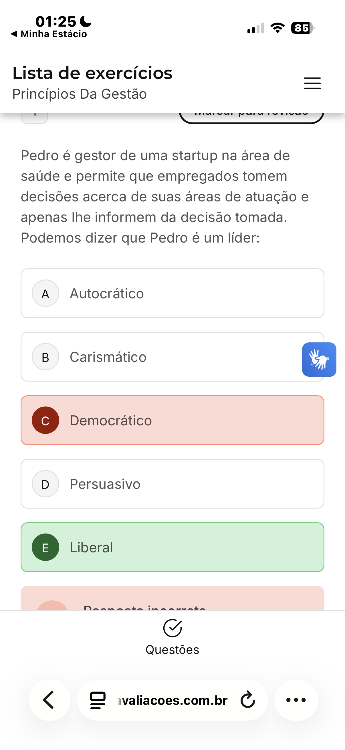01:25 85 Minha Estácio Lista de exercícios Princípios Da Gestão Pedro é gestor de uma startup na área de saúde e permite que empregados tomem decisões acerca de suas áreas de atuação e apenas lhe informem da decisão tomada. Podemos dizer que Pedro é um líder: A Autocrático Carismático Democrático D Persuasivo E Liberal Questões