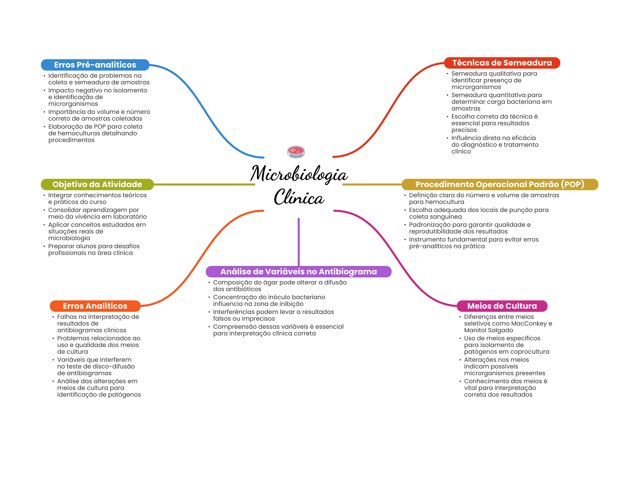 Erros Pré-analíticos Técnicas de Semeadura Identificação de problemas na Semeadura qualitativa para coleta e semeadura de amostras identificar presença de Impacto negativo no isolamento microrganismos e identificação de Semeadura quantitativa para microrganismos determinar carga bacteriana em amostras Importância do volume e número correto de amostras coletadas Escolha correta da técnica é Elaboração de POP para coleta essencial para resultados de hemoculturas detalhando precisos procedimentos Influência direta na eficácia do diagnóstico e tratamento clínico Microbiologia Objetivo da Atividade Procedimento Operacional Padrão (POP) Integrar conhecimentos teóricos Clínica Definição clara do número e volume de amostras e práticos do curso para hemocultura Consolidar aprendizagem por Escolha adequada dos locais de punção para meio da vivência em laboratório coleta sanguínea Aplicar conceitos estudados em Padronização para garantir qualidade e situações reais de reprodutibilidade dos resultados microbiologia Instrumento fundamental para evitar erros Preparar alunos para desafios pré-analíticos na prática profissionais na área clínica Análise de Variáveis no Antibiograma Composição do ágar pode alterar a difusão dos antibióticos Concentração do inóculo bacteriano Erros Analíticos influencia na zona de inibição Meios de Cultura Interferências podem levar a resultados Falhas na interpretação de falsos ou imprecisos Diferenças entre meios resultados de antibiogramas clínicos Compreensão dessas variáveis é essencial seletivos como MacConkey e para interpretação clínica correta Manitol Salgado Problemas relacionados ao Uso de meios específicos uso e qualidade dos meios para isolamento de de cultura patógenos em coprocultura Variáveis que interferem Alterações nos meios no teste de disco-difusão indicam possíveis de antibiogramas microrganismos presentes Análise das alterações em Conhecimento dos meios é meios de cultura para vital para interpretação identificação de patógenos correta dos resultados