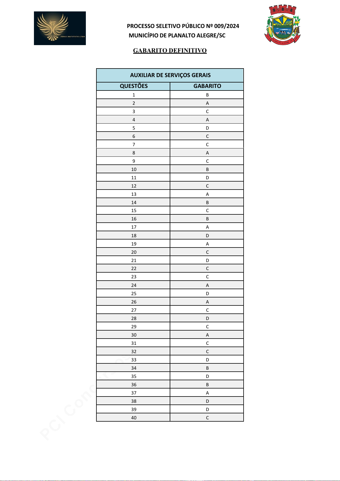 pcimarkpci MDAwMDowMDAwOjAwMDA6MDAwMDowMDAwOmZmZmY6YTRhMzoyNjFl:TW9uLCAxNiBGZWIgMjAyNiAxNDo1MToyMyAtMDMwMA== www.pciconcursos.com.br PROCESSO SELETIVO PÚBLICO Nº 009/2024 MUNICÍPIO DE PLANALTO ALEGRE/SC GABARITO DEFINITIVO AUXILIAR DE SERVIÇOS GERAIS QUESTÕES GABARITO 1 B 2 A 3 C 4 A 5 D 6 C 7 C 8 A 9 C 10 B 11 D 12 C 13 A 14 B 15 C 16 B 17 A 18 D 19 A 20 C 21 D 22 C 23 C 24 A 25 D 26 A 27 C 28 D 29 C 30 A 31 C 32 C 33 D 34 B 35 D 36 B 37 A 38 D 39 D 40 C pcimarkpci MDAwMDowMDAwOjAwMDA6MDAwMDowMDAwOmZmZmY6YTRhMzoyNjFl:TW9uLCAxNiBGZWIgMjAyNiAxNDo1MToyMyAtMDMwMA== www.pciconcursos.com.br PROCESSO SELETIVO PÚBLICO Nº 009/2024 MUNICÍPIO DE PLANALTO ALEGRE/SC GABARITO DEFINITIVO MOTORISTA QUESTÕES GABARITO 1 B 2 A 3 C 4 A 5 D 6 C 7 C 8 A 9 C 10 B 11 D 12 C 13 A 14 B 15 C 16 B 17 A 18 D 19 A 20 C 21 D 22 C 23 C 24 A 25 D 26 A 27 C 28 D 29 C 30 A 31 B 32 A 33 C 34 D 35 A 36 D 37 C 38 B 39 B 40 C pcimarkpci MDAwMDowMDAwOjAwMDA6MDAwMDowMDAwOmZmZmY6YTRhMzoyNjFl:TW9uLCAxNiBGZWIgMjAyNiAxNDo1MToyMyAtMDMwMA== www.pciconcursos.com.br PROCESSO SELETIVO PÚBLICO Nº 009/2024 MUNICÍPIO DE PLANALTO ALEGRE/SC GABARITO DEFINITIVO FISCAL DE VIGILÂNCIA SANITÁRIA, CONTROLE EPIDEMIOLÓGICO E COMBATE A ENDEMIAS QUESTÕES GABARITO 1 D 2 C 3 C 4 A 5 B 6 B 7 D 8 C 9 A 10 B 11 B 12 C 13 C 14 A 15 D 16 A 17 D 18 B 19 B 20 D 21 C 22 D 23 D 24 A 25 A 26 B 27 A 28 C 29 A 30 C 31 C 32 A 33 B 34 B 35 C 36 A 37 A 38 B 39 D 40 C pcimarkpci MDAwMDowMDAwOjAwMDA6MDAwMDowMDAwOmZmZmY6YTRhMzoyNjFl:TW9uLCAxNiBGZWIgMjAyNiAxNDo1MToyMyAtMDMwMA== www.pciconcursos.com.br PROCESSO SELETIVO PÚBLICO Nº 009/2024 MUNICÍPIO DE PLANALTO ALEGRE/SC GABARITO DEFINITIVO MONITOR DE TRANSPORTE ESCOLAR QUESTÕES GABARITO 1 D 2 C 3 C 4 A 5 B 6 B 7 D 8 C 9 A 10 B 11 B 12 C 13 C 14 A 15 D 16 A 17 D 18 B 19 B 20 D 21 C 22 D 23 D 24 A 25 A 26 B 27 A 28 C 29 A 30 C 31 B 32 D 33 C 34 A 35 C 36 B 37 B 38 A 39 A 40 D pcimarkpci MDAwMDowMDAwOjAwMDA6MDAwMDowMDAwOmZmZmY6YTRhMzoyNjFl:TW9uLCAxNiBGZWIgMjAyNiAxNDo1MToyMyAtMDMwMA== www.pciconcursos.com.br PROCESSO SELETIVO PÚBLICO Nº 009/2024 MUNICÍPIO DE PLANALTO ALEGRE/SC GABARITO DEFINITIVO TÉCNICO EM ENFERMAGEM QUESTÕES GABARITO 1 D 2 C 3 C 4 A 5 B 6 B 7 D 8 C 9 A 10 B 11 B 12 C 13 C 14 A 15 D 16 A 17 D 18 B 19 B 20 D 21 C 22 D 23 D 24 A 25 A 26 B 27 A 28 C 29 A 30 C 31 D 32 C 33 D 34 B 35 B 36 A 37 A 38 A 39 D 40 C pcimarkpci MDAwMDowMDAwOjAwMDA6MDAwMDowMDAwOmZmZmY6YTRhMzoyNjFl:TW9uLCAxNiBGZWIgMjAyNiAxNDo1MToyMyAtMDMwMA== www.pciconcursos.com.br PROCESSO SELETIVO PÚBLICO Nº 009/2024 MUNICÍPIO DE PLANALTO ALEGRE/SC GABARITO DEFINITIVO ASSISTENTE SOCIAL QUESTÕES GABARITO 1 C 2 D 3 C 4 A 5 A 6 D 7 B 8 C 9 B 10 B 11 D 12 C 13 A 14 D 15 B 16 B 17 ANULADA 18 A 19 C 20 C 21 D 22 A 23 B 24 C 25 A 26 D 27 C 28 A 29 B 30 A 31 D 32 C 33 A 34 D 35 A 36 B 37 A 38 C 39 A 40 D pcimarkpci MDAwMDowMDAwOjAwMDA6MDAwMDowMDAwOmZmZmY6YTRhMzoyNjFl:TW9uLCAxNiBGZWIgMjAyNiAxNDo1MToyMyAtMDMwMA== www.pciconcursos.com.br PROCESSO SELETIVO PÚBLICO Nº 009/2024 MUNICÍPIO DE PLANALTO ALEGRE/SC GABARITO DEFINITIVO ENFERMEIRO QUESTÕES GABARITO 1 C 2 D 3 C 4 A 5 A 6 D 7 B 8 C 9 B 10 B 11 D 12 C 13 A 14 D 15 B 16 B 17 ANULADA 18 A 19 C 20 C 21 D 22 A 23 B 24 C 25 A 26 D 27 C 28 A 29 B 30 A 31 D 32 A 33 B 34 C 35 C 36 B 37 A 38 D 39 D 40 A pcimarkpci MDAwMDowMDAwOjAwMDA6MDAwMDowMDAwOmZmZmY6YTRhMzoyNjFl:TW9uLCAxNiBGZWIgMjAyNiAxNDo1MToyMyAtMDMwMA== www.pciconcursos.com.br PROCESSO SELETIVO PÚBLICO Nº 009/2024 MUNICÍPIO DE PLANALTO ALEGRE/SC GABARITO DEFINITIVO FARMACÊUTICO QUESTÕES GABARITO 1 C 2 D 3 C 4 A 5 A 6 D 7 B 8 C 9 B 10 B 11 D 12 C 13 A 14 D 15 B 16 B 17 ANULADA 18 A 19 C 20 C 21 D 22 A 23 B 24 C 25 A 26 D 27 C 28 A 29 B 30 A 31 C 32 A 33 A 34 D 35 C 36 C 37 A 38 D 39 B 40 A pcimarkpci MDAwMDowMDAwOjAwMDA6MDAwMDowMDAwOmZmZmY6YTRhMzoyNjFl:TW9uLCAxNiBGZWIgMjAyNiAxNDo1MToyMyAtMDMwMA== www.pciconcursos.com.br PROCESSO SELETIVO PÚBLICO Nº 009/2024 MUNICÍPIO DE PLANALTO ALEGRE/SC GABARITO DEFINITIVO FISCAL DE OBRAS E TRIBUTOS QUESTÕES GABARITO 1 C 2 D 3 C 4 A 5 A 6 D 7 B 8 C 9 B 10 B 11 D 12 C 13 A 14 D 15 B 16 B 17 ANULADA 18 A 19 C 20 C 21 D 22 A 23 B 24 C 25 A 26 D 27 C 28 A 29 B 30 A 31 A 32 C 33 D 34 B 35 A 36 B 37 A 38 D 39 C 40 A pcimarkpci MDAwMDowMDAwOjAwMDA6MDAwMDowMDAwOmZmZmY6YTRhMzoyNjFl:TW9uLCAxNiBGZWIgMjAyNiAxNDo1MToyMyAtMDMwMA== www.pciconcursos.com.br PROCESSO SELETIVO PÚBLICO Nº 009/2024 MUNICÍPIO DE PLANALTO ALEGRE/SC GABARITO DEFINITIVO FONOAUDIÓLOGO QUESTÕES GABARITO 1 C 2 D 3 C 4 A 5 A 6 D 7 B 8 C 9 B 10 B 11 D 12 C 13 A 14 D 15 B 16 B 17 ANULADA 18 A 19 C 20 C 21 D 22 A 23 B 24 C 25 A 26 D 27 C 28 A 29 B 30 A 31 A 32 B 33 C 34 C 35 B 36 D 37 A 38 A 39 B 40 B pcimarkpci MDAwMDowMDAwOjAwMDA6MDAwMDowMDAwOmZmZmY6YTRhMzoyNjFl:TW9uLCAxNiBGZWIgMjAyNiAxNDo1MToyMyAtMDMwMA== www.pciconcursos.com.br PROCESSO SELETIVO PÚBLICO Nº 009/2024 MUNICÍPIO DE PLANALTO ALEGRE/SC GABARITO DEFINITIVO MÉDICO VETERINÁRIO QUESTÕES GABARITO 1 C 2 D 3 C 4 A 5 A 6 D 7 B 8 C 9 B 10 B 11 D 12 C 13 A 14 D 15 B 16 B 17 ANULADA 18 A 19 C 20 C 21 D 22 A 23 B 24 C 25 A 26 D 27 C 28 A 29 B 30 A 31 A 32 D 33 A 34 B 35 D 36 C 37 B 38 A 39 D 40 B pcimarkpci MDAwMDowMDAwOjAwMDA6MDAwMDowMDAwOmZmZmY6YTRhMzoyNjFl:TW9uLCAxNiBGZWIgMjAyNiAxNDo1MToyMyAtMDMwMA== www.pciconcursos.com.br PROCESSO SELETIVO PÚBLICO Nº 009/2024 MUNICÍPIO DE PLANALTO ALEGRE/SC GABARITO DEFINITIVO NUTRICIONISTA QUESTÕES GABARITO 1 C 2 D 3 C 4 A 5 A 6 D 7 B 8 C 9 B 10 B 11 D 12 C 13 A 14 D 15 B 16 B 17 ANULADA 18 A 19 C 20 C 21 D 22 A 23 B 24 C 25 A 26 D 27C 28 A 29 B 30 A 31 B 32 D 33 C 34 B 35 D 36 A 37 B 38 C 39 C 40 B pcimarkpci MDAwMDowMDAwOjAwMDA6MDAwMDowMDAwOmZmZmY6YTRhMzoyNjFl:TW9uLCAxNiBGZWIgMjAyNiAxNDo1MToyMyAtMDMwMA== www.pciconcursos.com.br PROCESSO SELETIVO PÚBLICO Nº 009/2024 MUNICÍPIO DE PLANALTO ALEGRE/SC GABARITO DEFINITIVO ORIENTADOR SOCIAL COM FORMAÇÃO EM PEDAGOGIA QUESTÕES GABARITO 1 C 2 D 3 C 4 A 5 A 6 D 7 B 8 C 9 B 10 B 11 D 12 C 13 A 14 D 15 B 16 B 17 ANULADA 18 A 19 C 20 C 21 D 22 A 23 B 24 C 25 A 26 D 27 C 28 A 29 B 30
