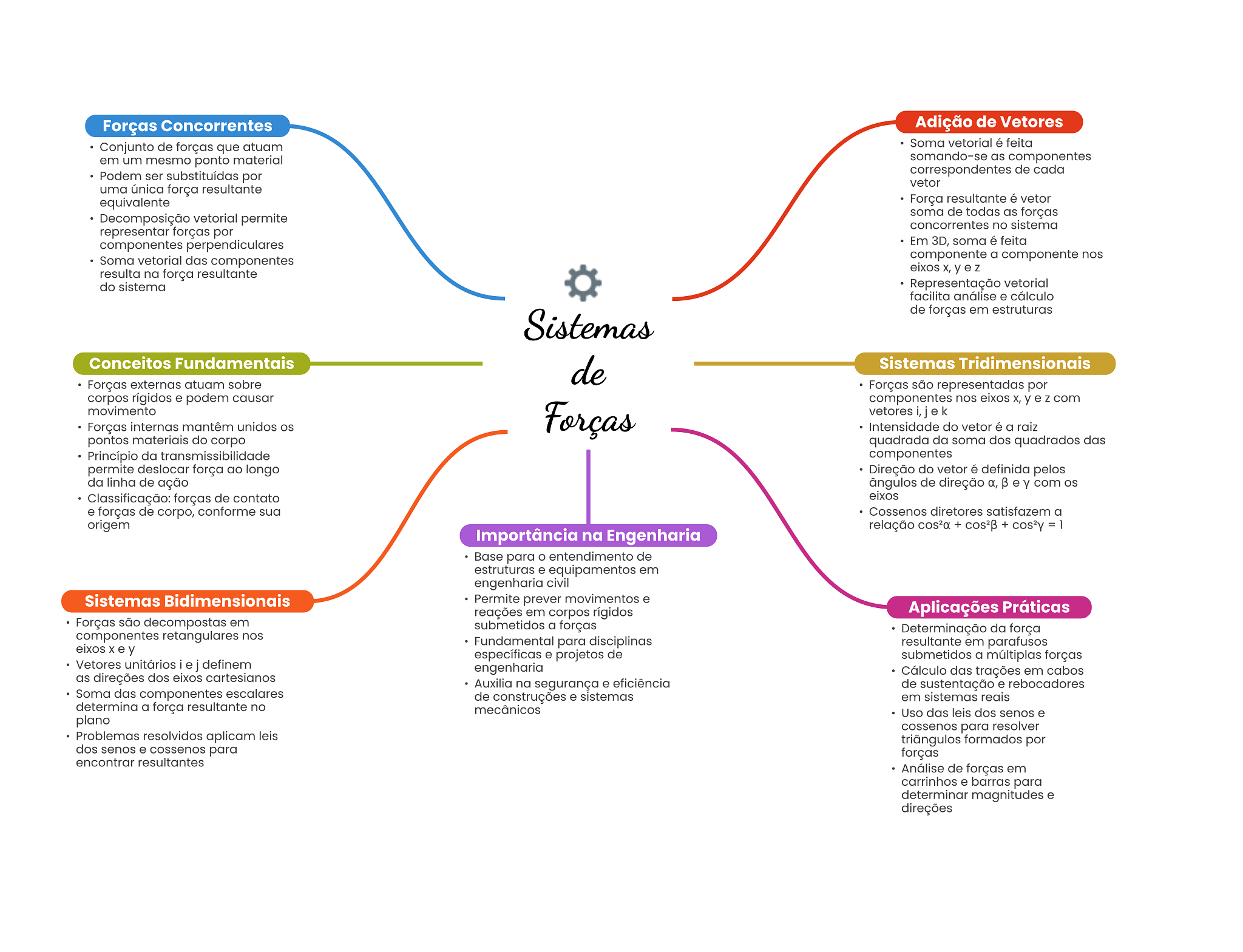 Forças Concorrentes Adição de Vetores Conjunto de forças que atuam Soma vetorial é feita em um mesmo ponto material somando-se as componentes Podem ser substituídas por correspondentes de cada vetor uma única força resultante equivalente Força resultante é vetor Decomposição vetorial permite soma de todas as forças concorrentes no sistema representar forças por componentes perpendiculares Em 3D, soma é feita Soma vetorial das componentes componente a componente nos resulta na força resultante eixos X, y e Z do sistema Representação vetorial facilita análise e cálculo de forças em estruturas Sistemas Conceitos Fundamentais de Sistemas Tridimensionais Forças externas atuam sobre Forças são representadas por corpos rígidos e podem causar componentes nos eixos X, y e Z com movimento Forças internas mantêm unidos OS Forças vetoresi,jek Intensidade do vetor é a raiz pontos materiais do corpo quadrada da soma dos quadrados das Princípio da transmissibilidade componentes permite deslocar força ao longo Direção do vetor é definida pelos da linha de ação ângulos de direção α, e Y com Classificação: forças de contato eixos e forças de corpo, conforme sua Cossenos diretores satisfazem a origem relação + + = 1 Importância na Engenharia Base para entendimento de estruturas e equipamentos em engenharia civil Sistemas Bidimensionais Permite prever movimentos e reações em corpos rígidos Aplicações Práticas Forças são decompostas em submetidos a forças Determinação da força componentes retangulares nos Fundamental para disciplinas resultante em parafusos eixos X e y específicas e projetos de submetidos a múltiplas forças Vetores unitários i e j definem engenharia Cálculo das trações em cabos as direções dos eixos cartesianos Auxilia na segurança e eficiência de sustentação e rebocadores Soma das componentes escalares de construções e sistemas em sistemas reais determina a força resultante no mecânicos Uso das leis dos senos e plano cossenos para resolver Problemas resolvidos aplicam leis triângulos formados por dos senos e cossenos para forças encontrar resultantes Análise de forças em carrinhos e barras para determinar magnitudes e direções