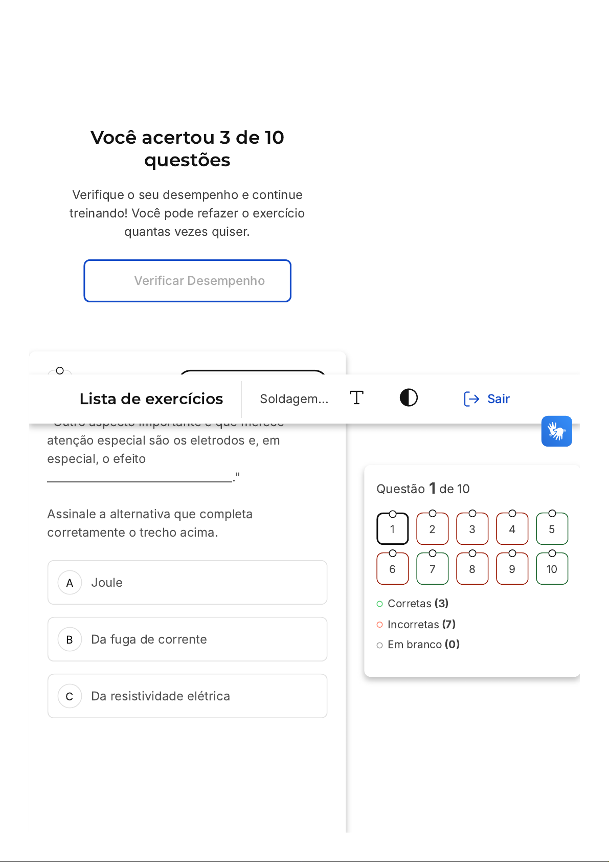 Você acertou 3 de 10 questões Verifique o seu desempenho e continue treinando! Você pode refazer o exercício quantas vezes quiser. Verificar Desempenho A B C 1 Desmarcar para revisão "Outro aspecto importante e que merece atenção especial são os eletrodos e, em especial, o efeito _________________________________." Assinale a alternativa que completa corretamente o trecho acima. Joule Da fuga de corrente Da resistividade elétrica Questão 1 de 10 Corretas (3) Incorretas (7) Em branco (0) 1 2 3 4 5 6 7 8 9 10 Lista de exercícios Soldagem… Sair D E Do desgaste sobre eles Da condutividade elétrica Resposta incorreta Opa! A alternativa correta é a letra D. Confira o gabarito comentado! Gabarito Comentado A frase completa corretamente seria: "Outro aspecto importante e que merece atenção especial são os eletrodos e, em especial, o efeito do desgaste sobre eles". O desgaste dos eletrodos é um fator crucial a ser considerado, pois pode afetar a eficiência do processo de condução de eletricidade. Quando os eletrodos sofrem desgaste, a área de contato entre eles e a superfície metálica aumenta, o que pode resultar em variações na corrente elétrica. Portanto, a alternativa D é a correta. 2 Desmarcar para revisão "A Soldagem por resistência elétrica é feita através da _____________, devido à passagem de corrente elétrica e consequente efeito Joule, com a ação e aplicação conjunta de pressão entre as peças metálicas." Assinale a alternativa que completa corretamente o trecho acima. A B C D E Tensão de arco Tensão mecânica Energia Resistência Geração de calor Resposta incorreta Opa! A alternativa correta é a letra E. Confira o gabarito comentado! Gabarito Comentado A soldagem por resistência elétrica é um processo que se realiza através da geração de calor. Este calor é produzido devido à passagem de corrente elétrica e ao consequente efeito Joule, que é a produção de calor quando uma corrente elétrica passa por um condutor. A ação e aplicação conjunta de pressão entre as peças metálicas são essenciais para a efetivação do processo de soldagem. Portanto, a alternativa que corretamente completa o trecho do enunciado é a "Geração de calor". 3 Desmarcar para revisão A B C D E Os equipamentos de corrente alternada são do tipo ________________, sendo a corrente de soldagem fornecida diretamente por um transformador __________________. Assinale a alternativa que completa corretamente o trecho acima. energia indireta / bifásico. energia direta / trifásico energia direta / monofásico energia indireta / monofásico energia indireta / trifásico Resposta incorreta Opa! A alternativa correta é a letra C. Confira o gabarito comentado! Gabarito Comentado A questão se refere aos equipamentos de corrente alternada, que são do tipo energia direta. Isso significa que a corrente de soldagem é fornecida diretamente por um transformador. No caso, o tipo de transformador é monofásico, que é um sistema de distribuição de energia elétrica que utiliza apenas uma fase. Portanto, a alternativa que completa corretamente o trecho é "energia direta / monofásico". A B C D E 4 Desmarcar para revisão "O ponto crucial dentro deste processo de soldagem e que merece atenção especial é que o calor gerado é devido a _________ imposta pelo conjunto formado pelas peças metálicas à passagem de corrente elétrica através das mesmas." Assinale a alternativa que completa corretamente o trecho acima. Corrente elétrica Tensão mecânica Tensão de arco Resistência Energia Resposta incorreta Opa! A alternativa correta é a letra D. Confira o gabarito comentado! Gabarito Comentado O calor gerado no processo de soldagem é devido à resistência imposta pelo conjunto formado pelas peças metálicas à passagem de corrente elétrica através delas. Isso ocorre porque a resistência elétrica é uma propriedade que os materiais têm de se opor à passagem de corrente elétrica, transformando parte A B C D E dessa energia em calor. Portanto, a alternativa que completa corretamente o trecho é a "Resistência". 5 Desmarcar para revisão O campo magnético gerado interfere diretamente na intensidade de corrente, causando fuga de corrente pelo efeito _________________. Assinale a alternativa que completa corretamente o trecho acima. Joule de resistividade absoluta Ohm das forças de Lorentz dos circuitos variados Resposta correta Parabéns, você selecionou a alternativa correta. Confira o gabarito comentado! Gabarito Comentado A alternativa correta é a letra D, que indica o efeito das forças de Lorentz. Este efeito é A B C D E uma consequência da interação entre a corrente elétrica e o campo magnético, que pode causar uma alteração na trajetória dos elétrons, resultando em uma fuga de corrente. As outras alternativas não são adequadas para completar a frase, pois não descrevem um efeito que cause a fuga de corrente em um campo magnético. 6 Desmarcar para revisão Sendo o processo de soldagem por resistência com alta frequência um processo que envolve a passagem de _________________ em alta frequência, problemas envolvendo a influência negativa de _________________________ sobre a região de solda são comuns. Assinale a alternativa que completa corretamente o trecho acima. tensão elétrica / contaminantes corrente elétrica / contaminantes corrente elétrica / campos magnéticos tensão elétrica / campos magnéticos calor / campos magnéticos Resposta incorreta A B C Opa! A alternativa correta é a letra C. Confira o gabarito comentado! Gabarito Comentado A alternativa correta é a letra C. O processo de soldagem por resistência com alta frequência envolve a passagem de corrente elétrica em alta frequência. Durante esse processo, é comum que ocorram problemas relacionados à influência negativa de campos magnéticos sobre a região de solda. Isso ocorre porque os campos magnéticos podem interferir na corrente elétrica, af