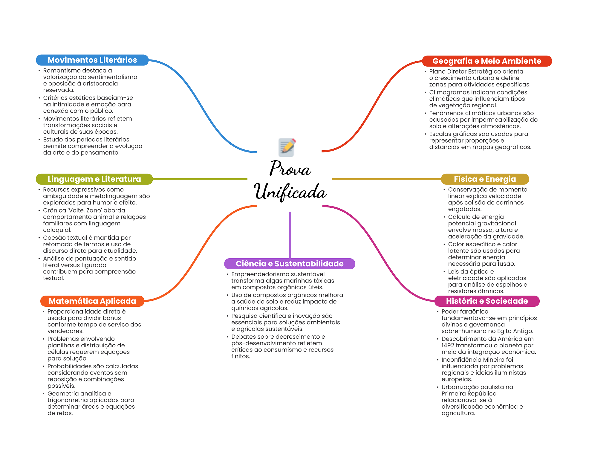 Movimentos Literários Geografia e Meio Ambiente Romantismo destaca a Plano Diretor Estratégico orienta valorização do sentimentalismo crescimento urbano e define e oposição à aristocracia zonas para atividades específicas. reservada. Climogramas indicam condições Critérios estéticos baseiam-se climáticas que influenciam tipos na intimidade e emoção para de vegetação regional. conexão com público. Fenômenos climáticos urbanos são Movimentos literários refletem causados por impermeabilização do transformações sociais e solo e alterações atmosféricas. culturais de suas épocas. Escalas gráficas são usadas para Estudo dos períodos literários representar e permite compreender a evolução distâncias em mapas geográficos. da arte e do pensamento. Prova Linguagem e Literatura Física e Energia Recursos expressivos como Unificada Conservação de momento ambiguidade e metalinguagem são linear explica velocidade explorados para humor e efeito. após colisão de carrinhos Crônica 'Volte, Zano' aborda engatados. comportamento animal e relações Cálculo de energia familiares com linguagem potencial gravitacional coloquial. envolve massa, altura e Coesão textual é mantida por aceleração da gravidade. retomada de termos e uso de Calor específico e calor discurso direto para atualidade. latente são usados para Análise de pontuação e sentido determinar energia literal versus figurado Ciência e Sustentabilidade necessária para fusão. contribuem para compreensão Empreendedorismo sustentável Leis da óptica e textual. transforma algas marinhas tóxicas eletricidade são aplicadas em compostos orgânicos úteis. para análise de espelhos e resistores ôhmicos. Uso de compostos orgânicos melhora Matemática Aplicada a saúde do solo e reduz impacto de História e Sociedade Proporcionalidade direta é químicos agrícolas. Poder faraônico usada para dividir bônus Pesquisa científica e inovação são fundamentava-se em princípios conforme tempo de serviço dos essenciais para soluções ambientais divinos e governança vendedores. e agrícolas sustentáveis. sobre-humana no Egito Antigo. Problemas envolvendo Debates sobre decrescimento e Descobrimento da América em planilhas e distribuição de pós-desenvolvimento refletem 1492 transformou planeta por células requerem equações críticas ao consumismo e recursos meio da integração econômica. para solução. finitos. Inconfidência Mineira foi Probabilidades são calculadas influenciada por problemas considerando eventos sem regionais e ideias iluministas reposição e combinações europeias. possíveis. Urbanização paulista na Geometria analítica e Primeira República trigonometria aplicadas para relacionava-se à determinar áreas e equações diversificação econômica e de retas. agricultura.