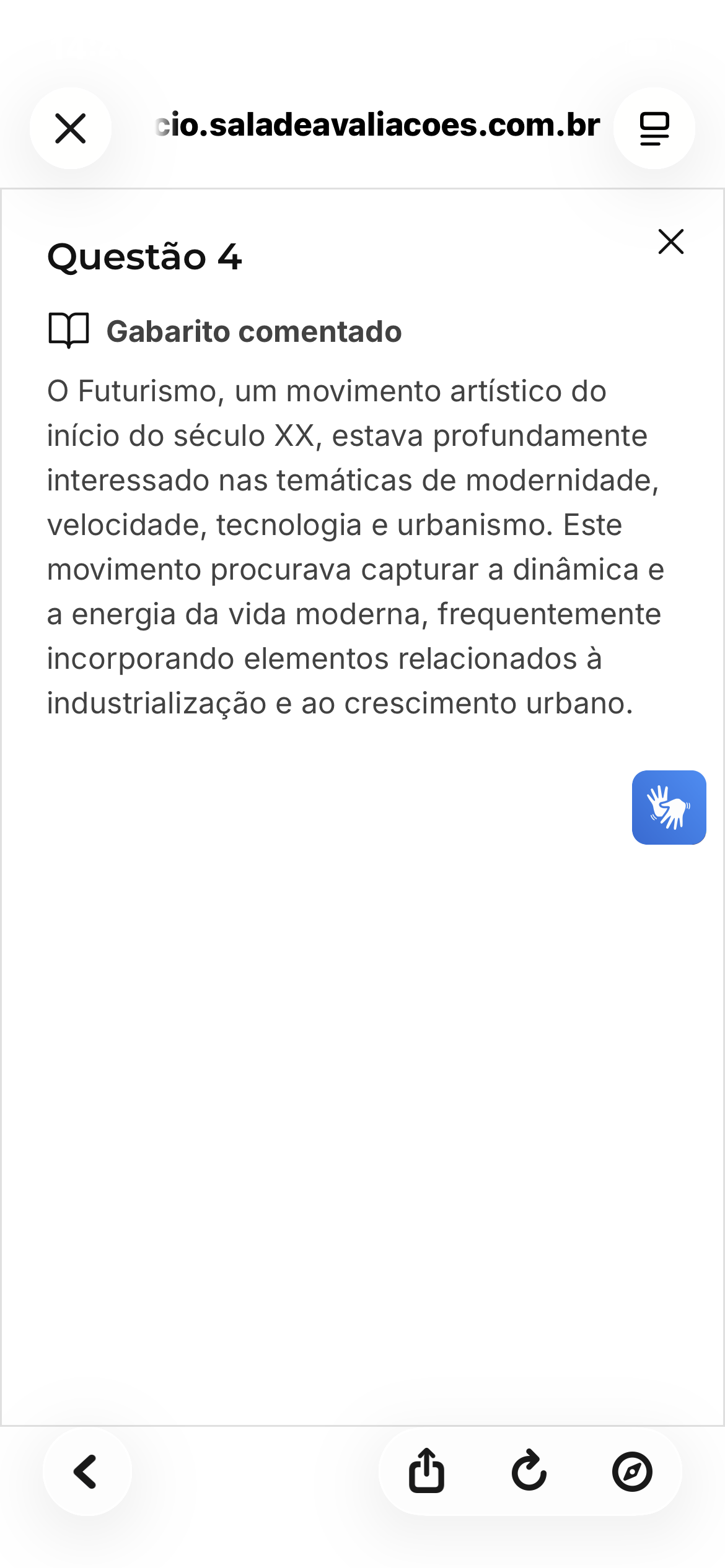 X cio.saladeavaliacoes.com.br Questão 4 X Gabarito comentado Futurismo, um movimento artístico do início do século estava profundamente interessado nas temáticas de modernidade, velocidade, tecnologia e urbanismo. Este movimento procurava capturar a dinâmica e a energia da vida moderna, frequentemente incorporando elementos relacionados à industrialização e ao crescimento urbano.