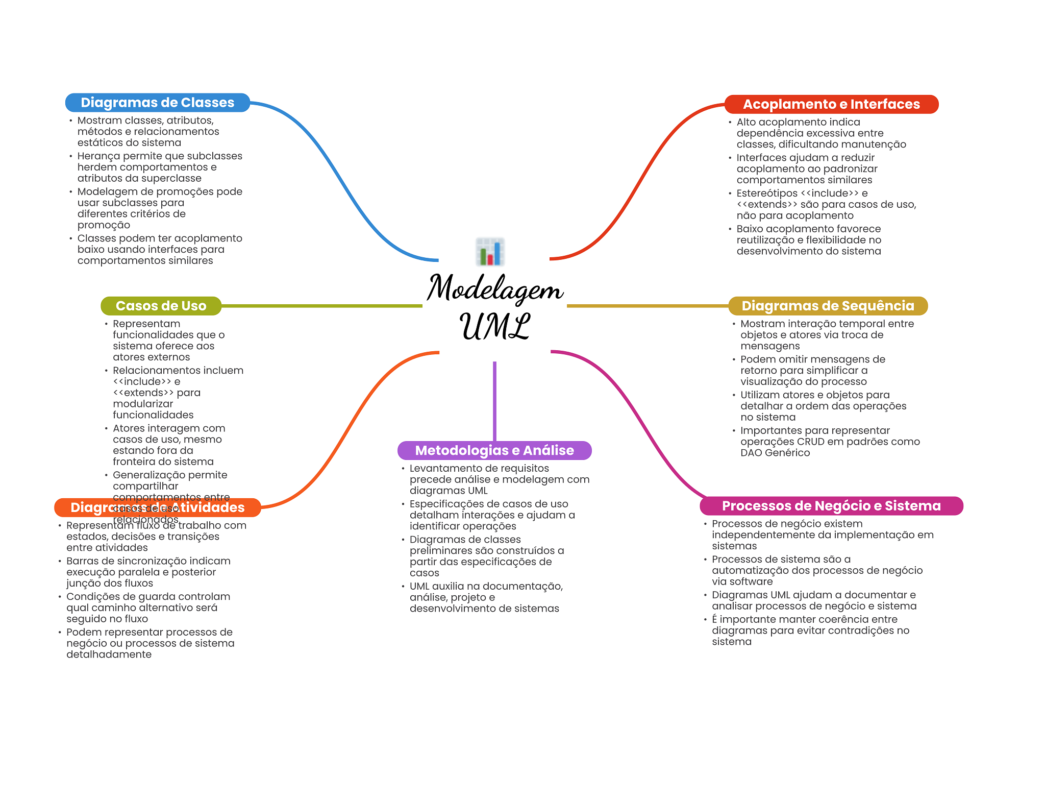 Diagramas de Classes Acoplamento e Interfaces Mostram classes, atributos, Alto acoplamento indica métodos e relacionamentos dependência excessiva entre estáticos do sistema classes, dificultando manutenção Herança permite que subclasses Interfaces ajudam a reduzir herdem comportamentos e acoplamento ao padronizar atributos da superclasse comportamentos similares Modelagem de promoções pode Estereótipos e usar subclasses para são para casos de uso, diferentes critérios de não para acoplamento promoção Baixo acoplamento favorece Classes podem ter acoplamento reutilização e flexibilidade no baixo usando interfaces para desenvolvimento do sistema comportamentos similares Modelagem Casos de Uso Diagramas de Sequência Representam funcionalidades que UML Mostram interação temporal entre objetos e atores via troca de sistema oferece aos mensagens atores externos Podem omitir mensagens de Relacionamentos incluem retorno para simplificar a e visualização do processo para Utilizam atores e objetos para modularizar detalhar a ordem das operações funcionalidades no sistema Atores interagem com Importantes para representar casos de uso, mesmo operações CRUD em padrões como estando fora da Metodologias e Análise DAO Genérico fronteira do sistema Levantamento de requisitos Generalização permite precede análise e modelagem com compartilhar diagramas UML comportamentos entre de Atividades Especificações de casos de uso Processos de Negócio e Sistema relacionados detalham interações e ajudam a Representam fluxo de trabalho com identificar operações Processos de negócio existem estados, decisões e transições Diagramas de classes independentemente da implementação em entre atividades sistemas preliminares são construídos a Barras de sincronização indicam partir das especificações de Processos de sistema são a execução paralela e posterior casos automatização dos processos de negócio junção dos fluxos via software UML auxilia na documentação, Condições de guarda controlam análise, projeto e Diagramas UML ajudam a documentar e qual caminho alternativo será desenvolvimento de sistemas analisar processos de negócio e sistema seguido no fluxo É importante manter coerência entre Podem representar processos de diagramas para evitar contradições no negócio ou processos de sistema sistema detalhadamente